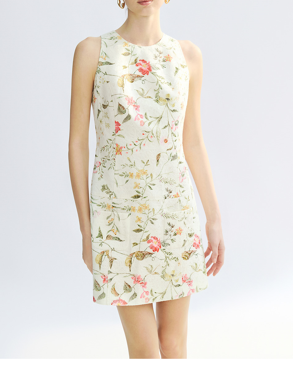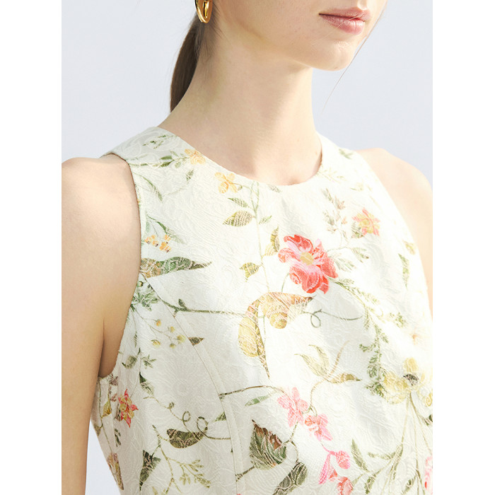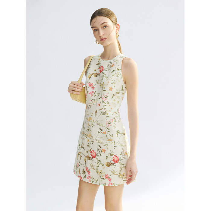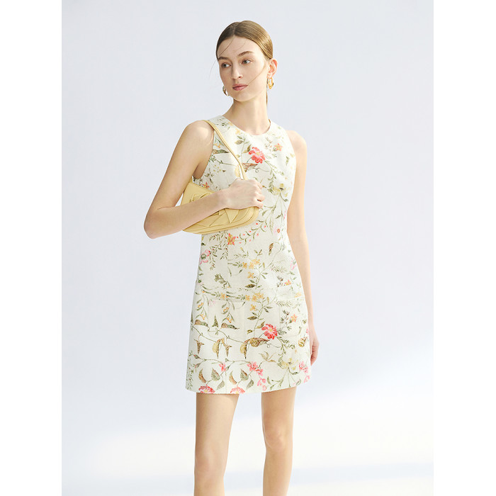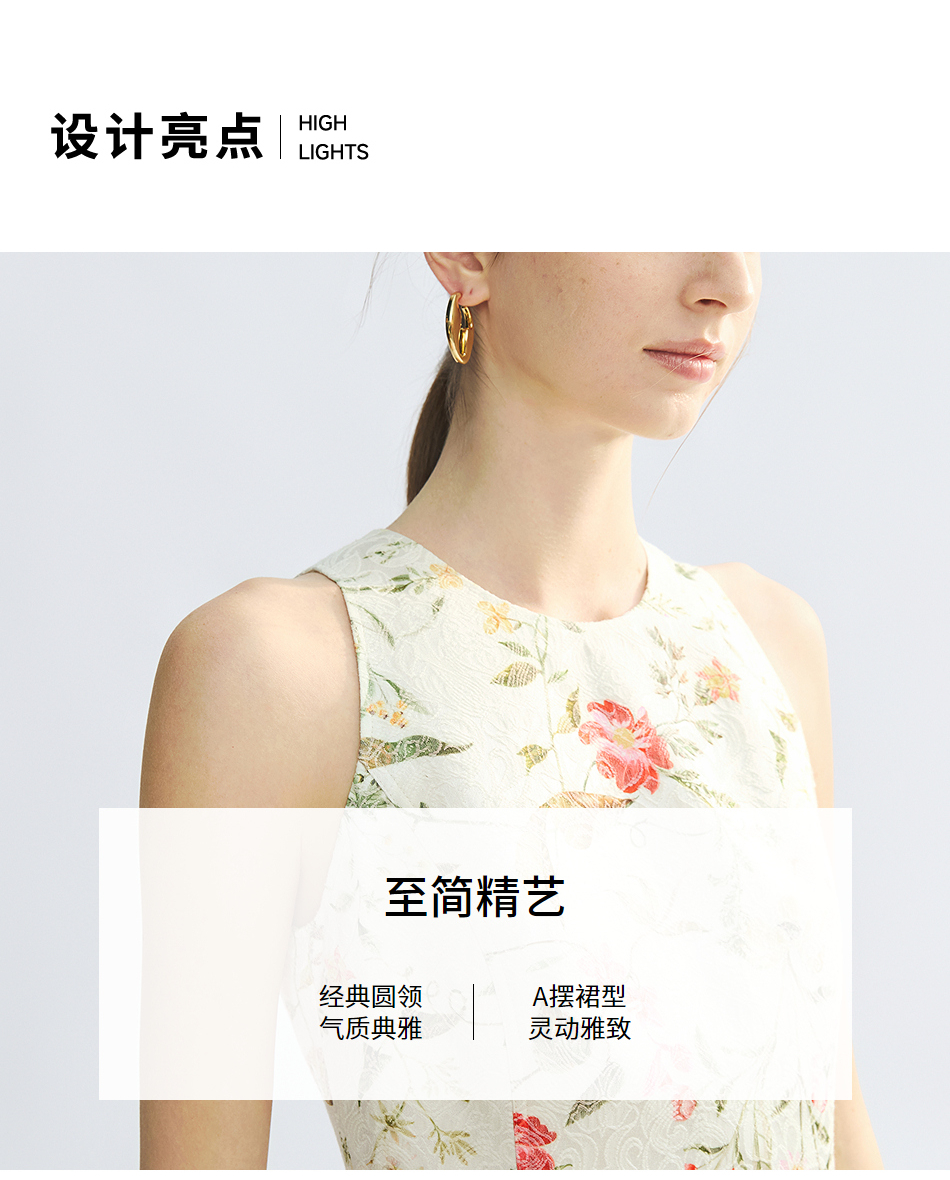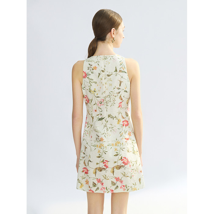 朗姿無袖法式提花肌理圓領連衣裙女印花A字裙2025年夏季新款