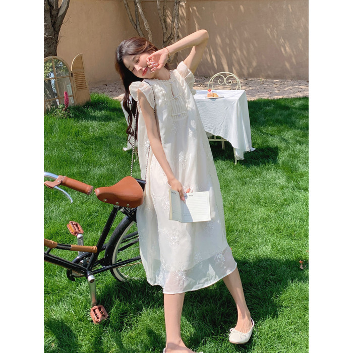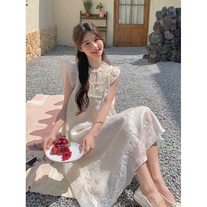 米白色新中式連衣裙女夏2025新款國風小飛袖氣質甜美溫柔刺綉裙子