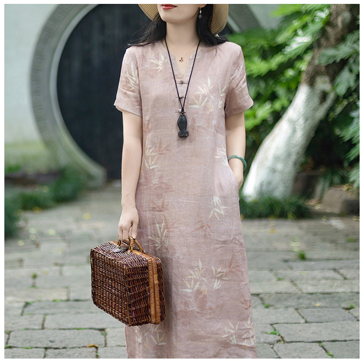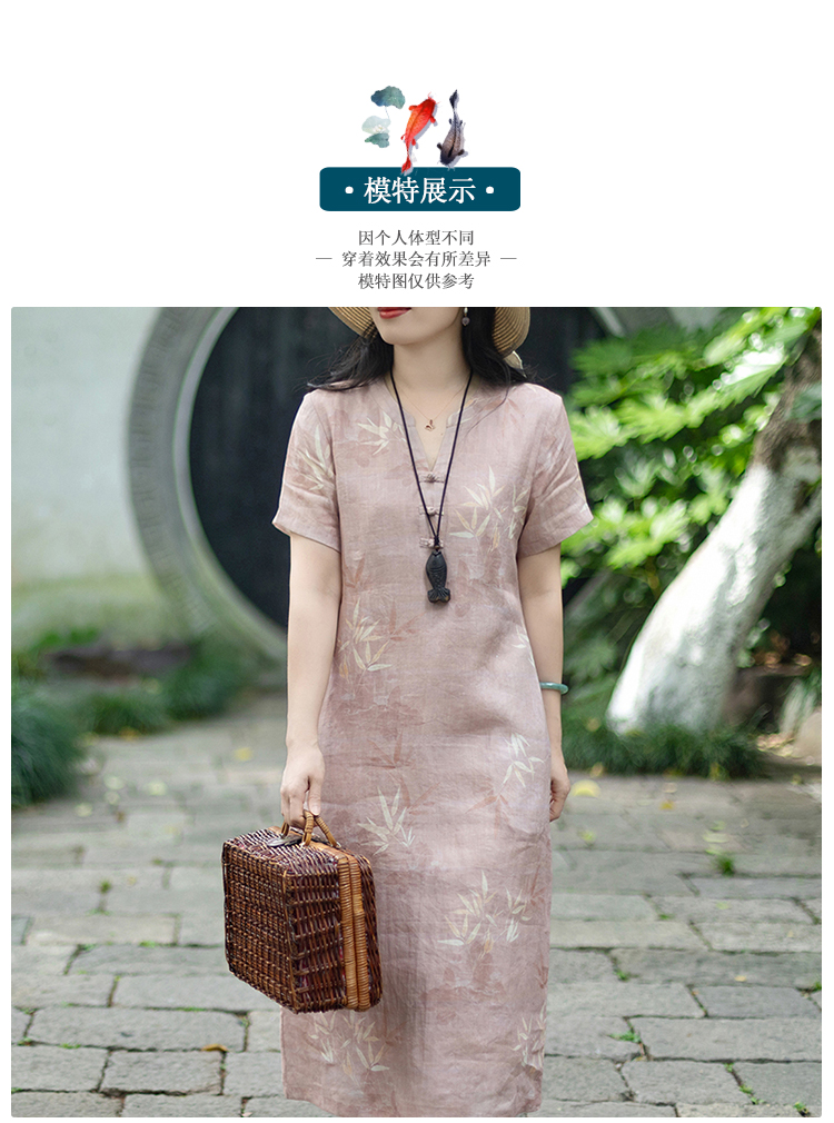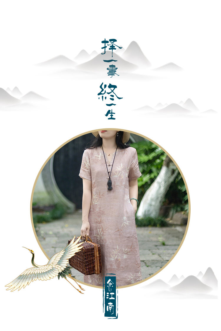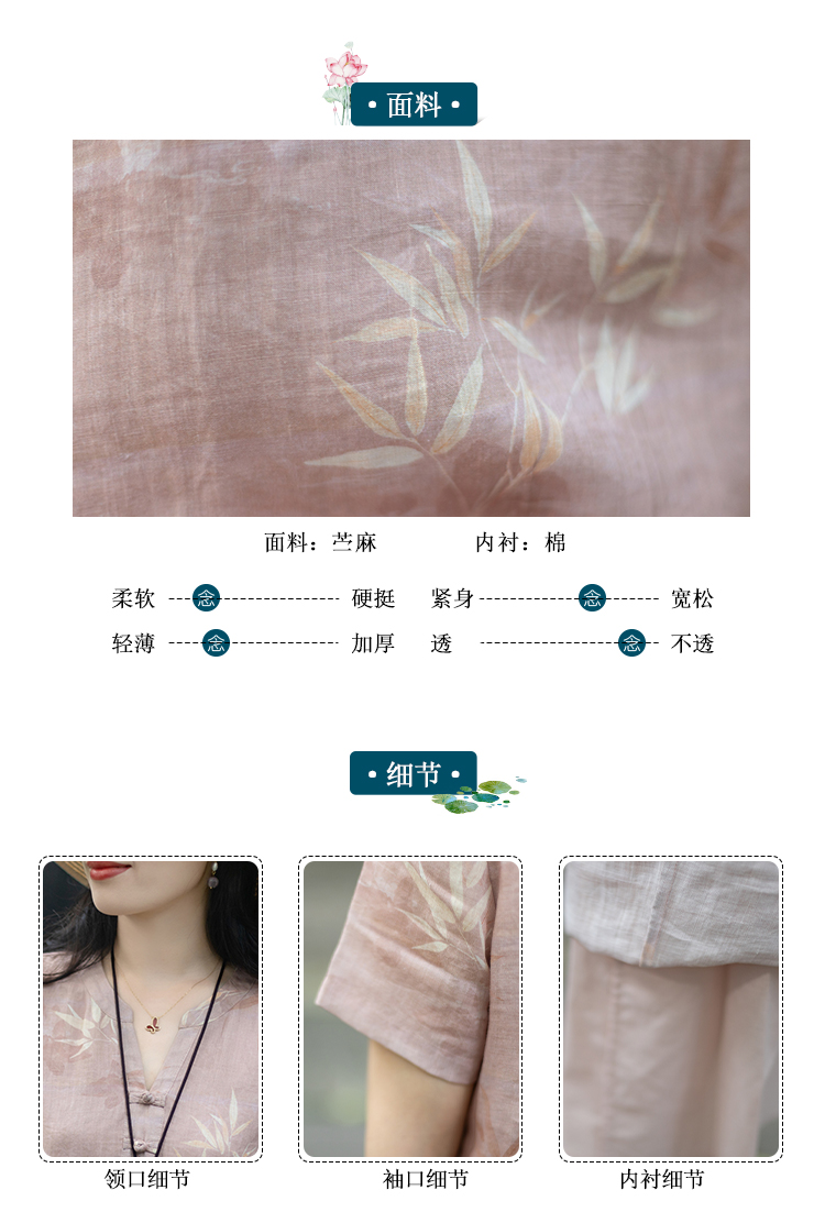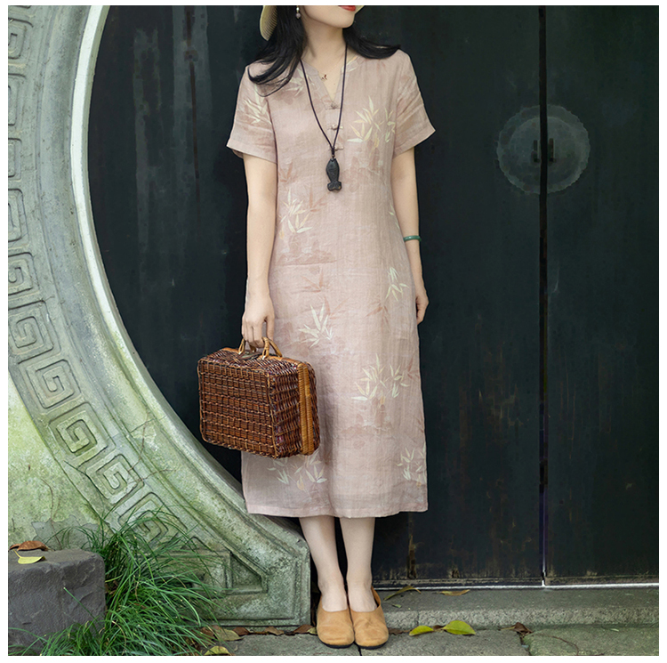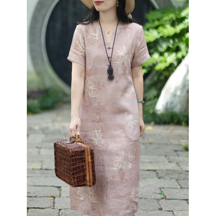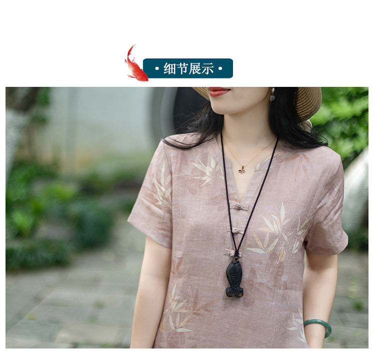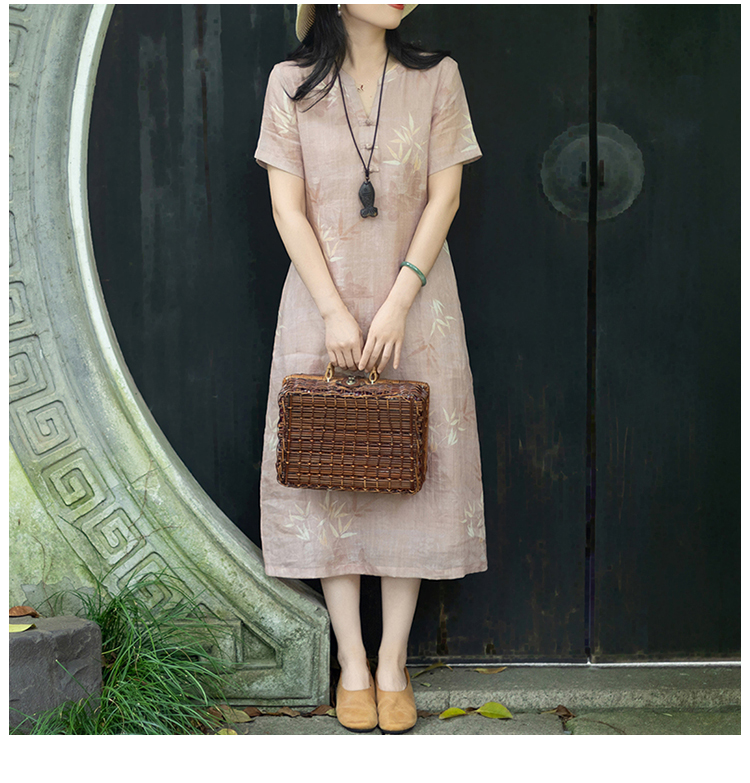 念江南溫柔雅致竹葉印花苧麻V領盤釦短袖松弛顯瘦新中式連衣裙女