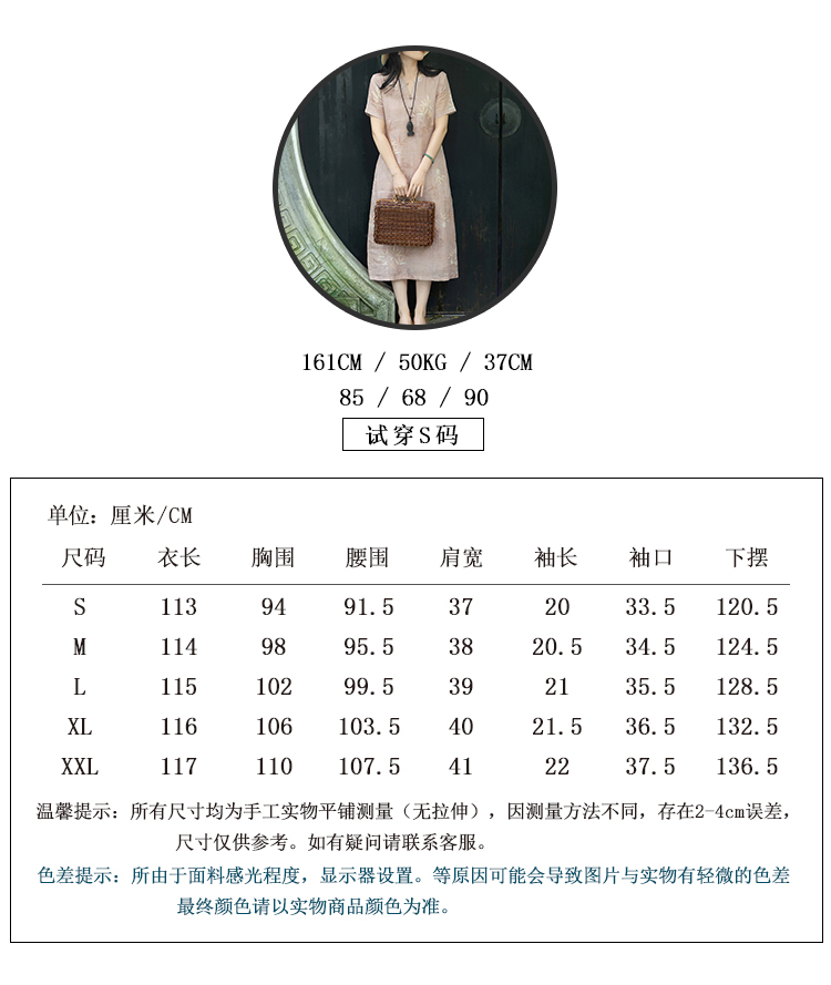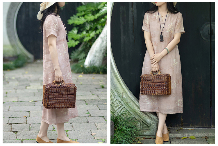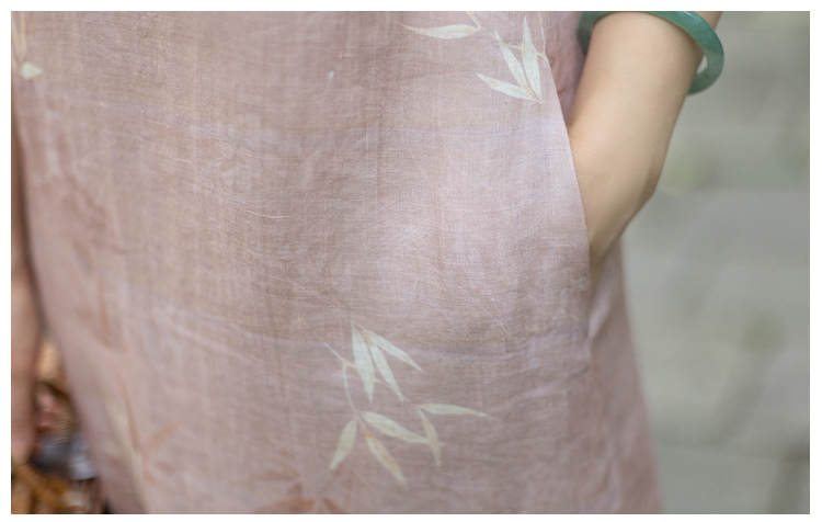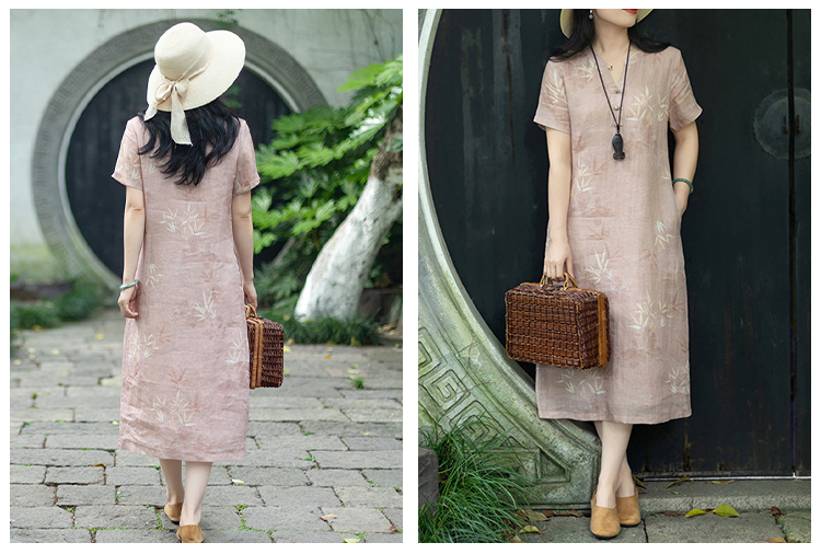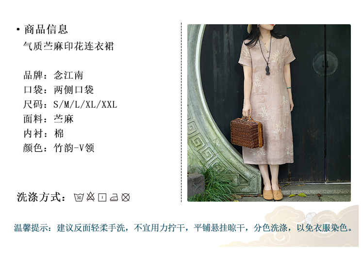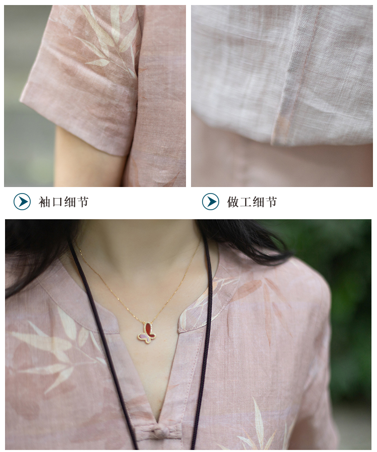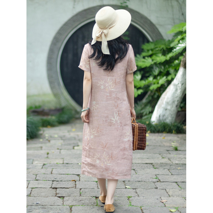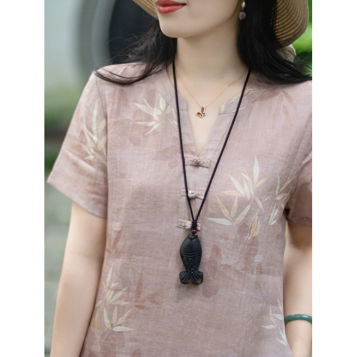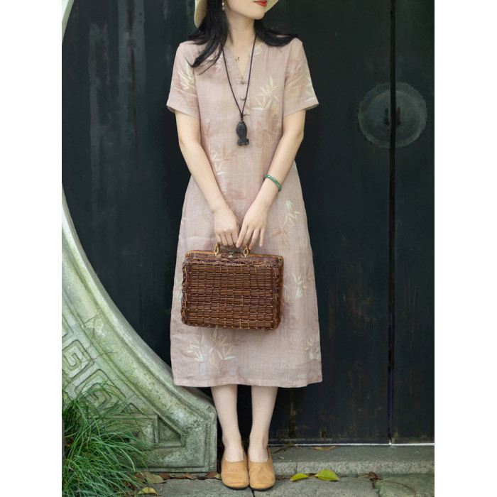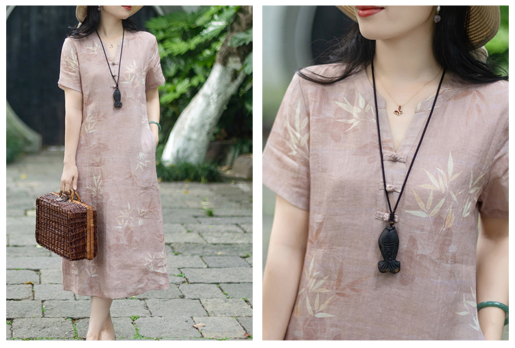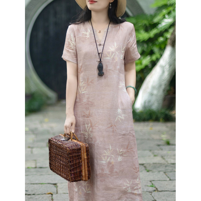 念江南溫柔雅致竹葉印花苧麻V領盤釦短袖松弛顯瘦新中式連衣裙女