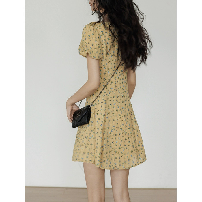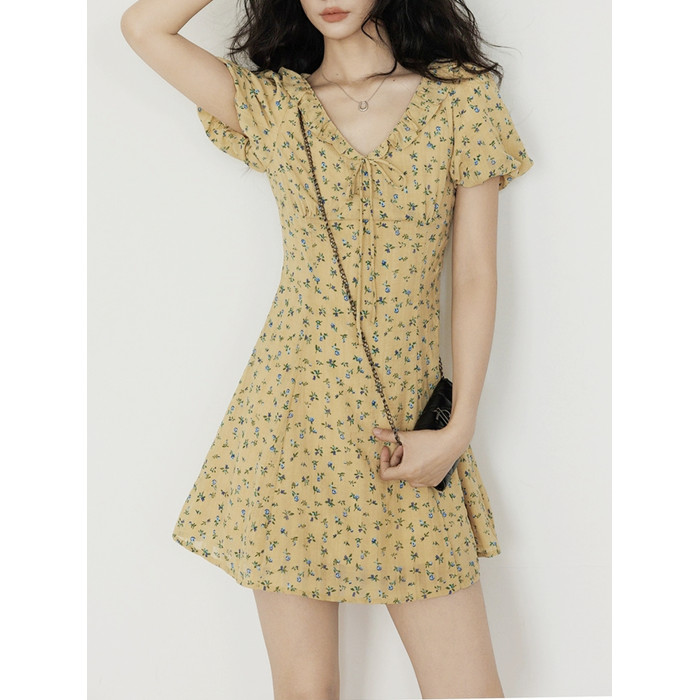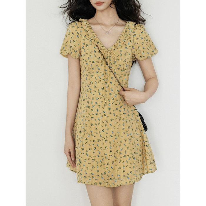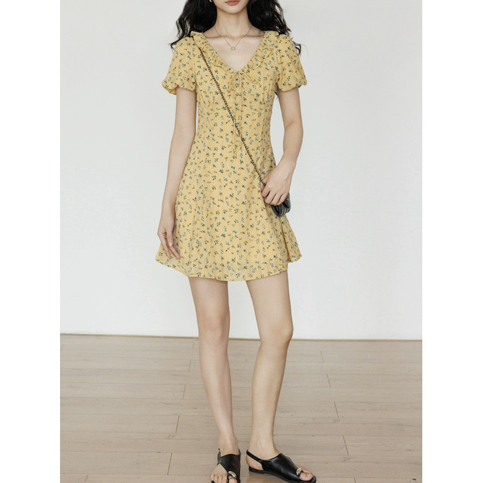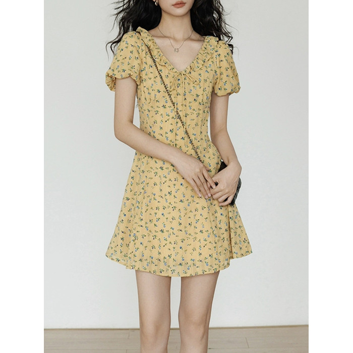 2025夏季新款法式黃色碎花連衣裙女荷葉邊v領度假風氣質短裙子