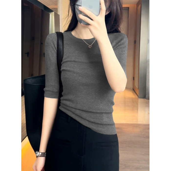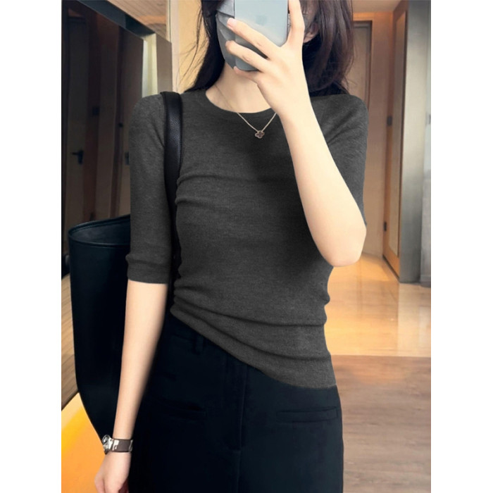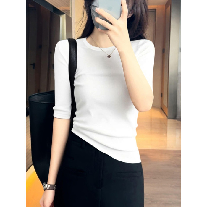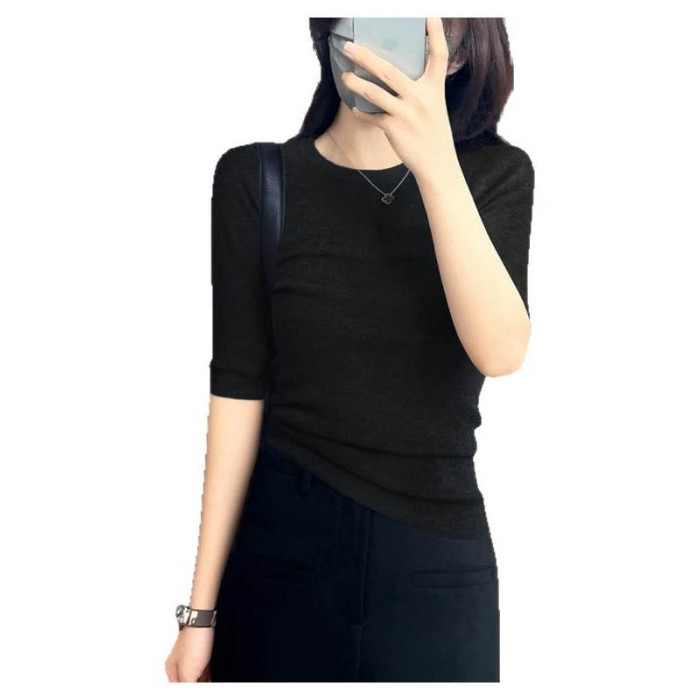 潮牌新款洋氣修身圓領套頭上衣女裝氣質五分袖簡約純色針織打底衫