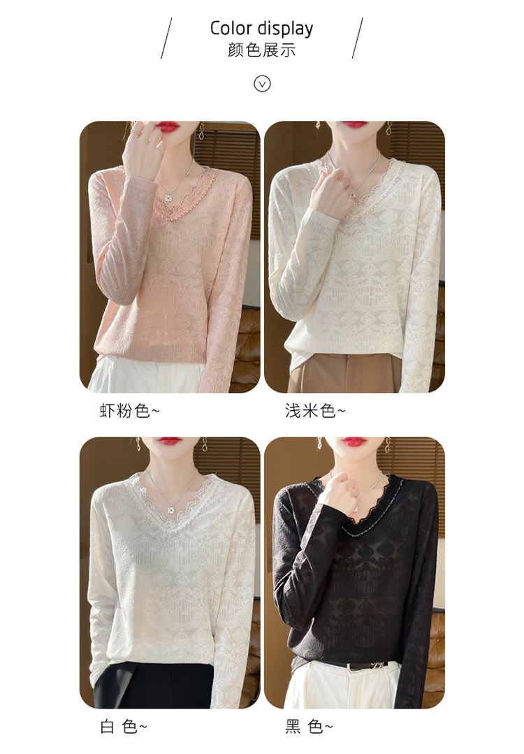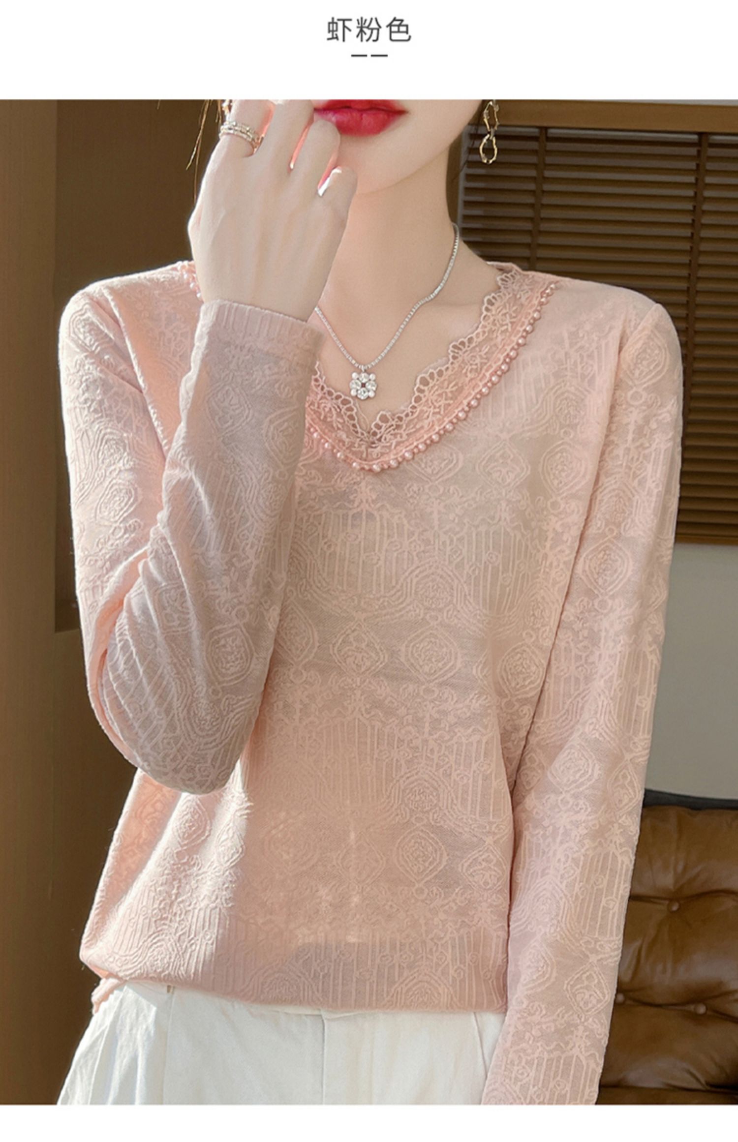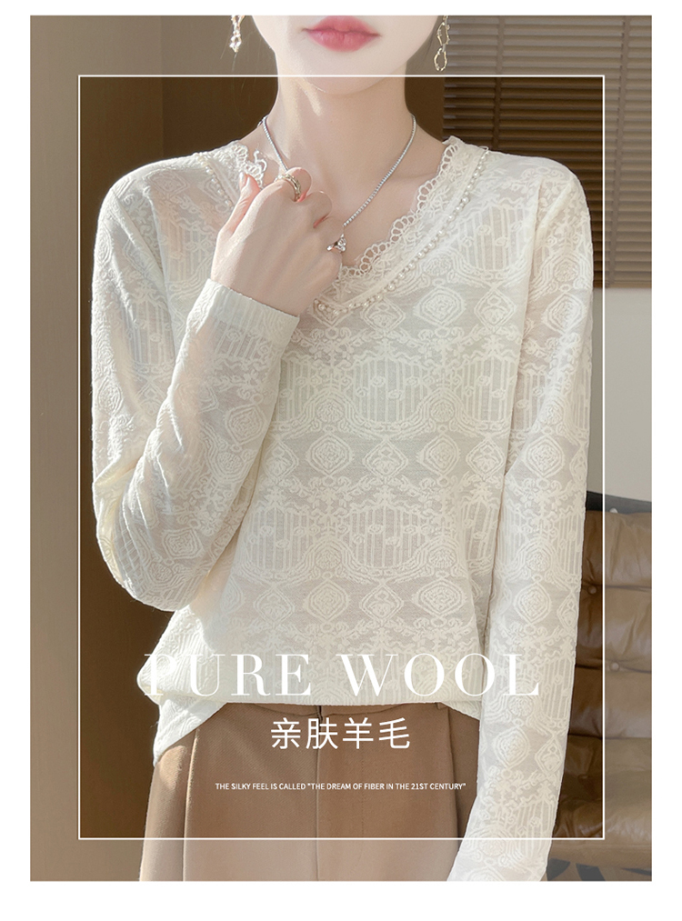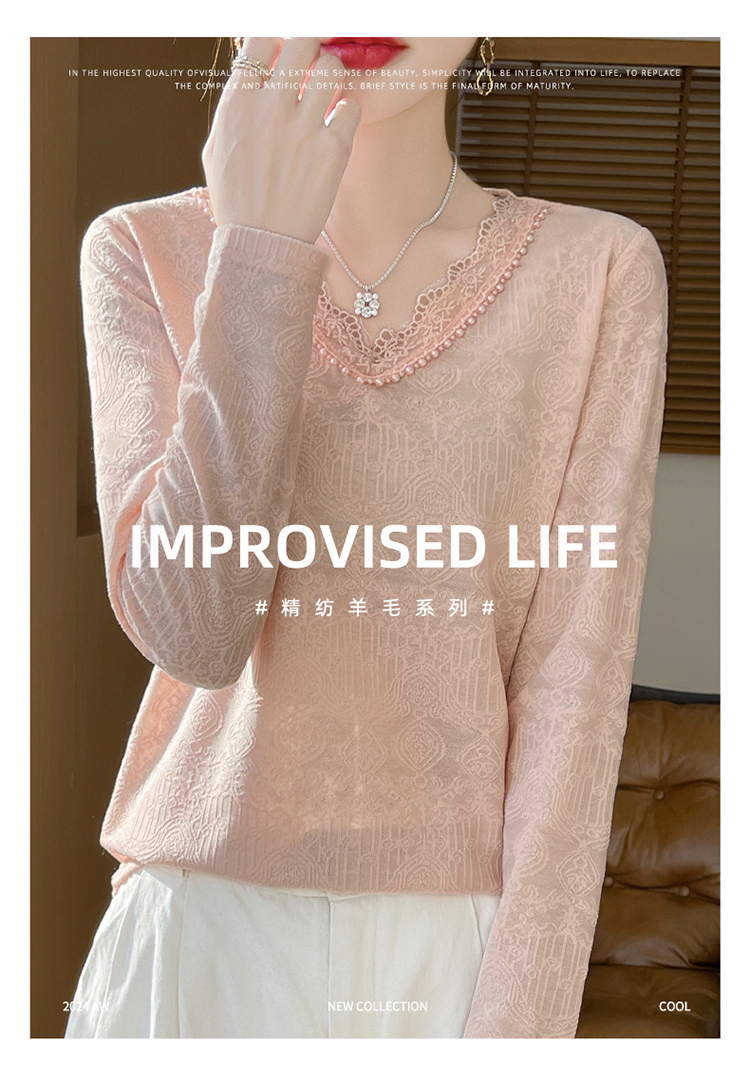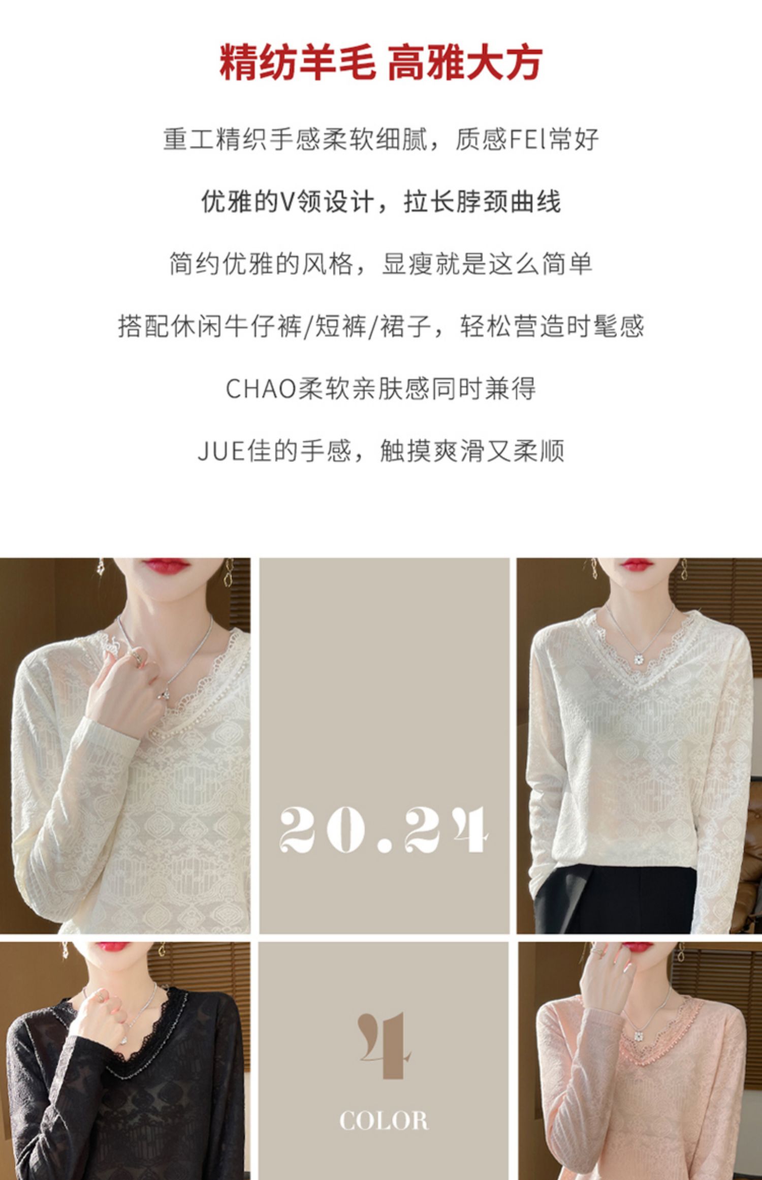 精紡羊毛高級感釘珠蕾絲拼接V領針織衫女春季內搭打底衫毛衣上衣