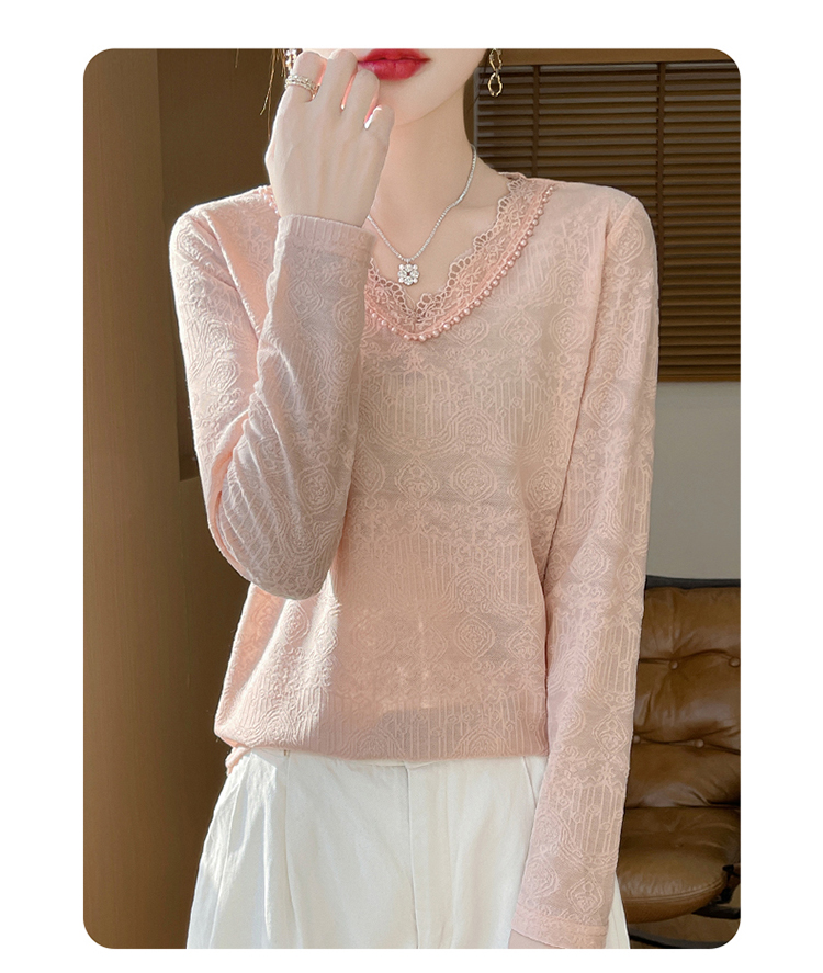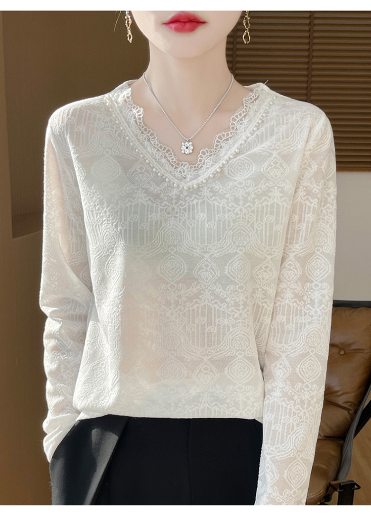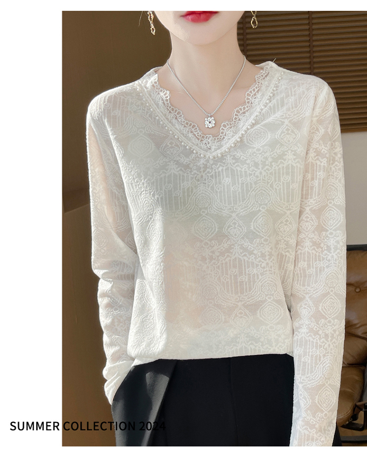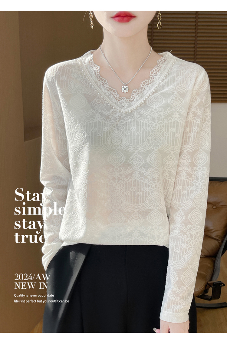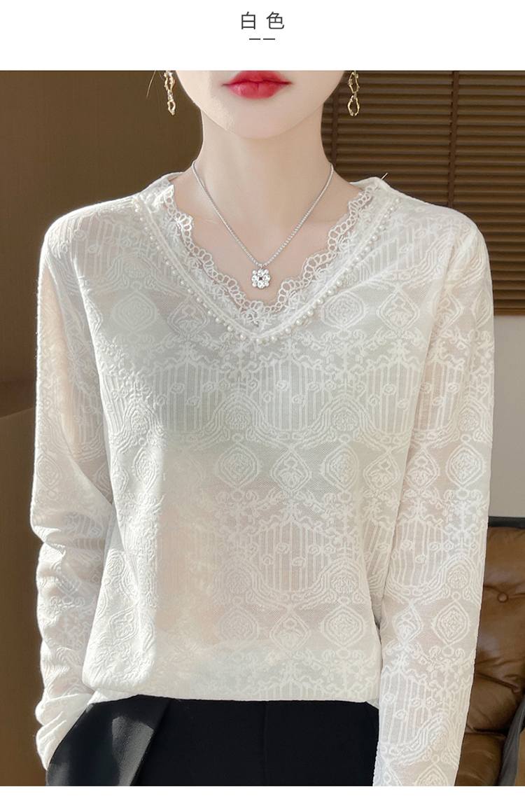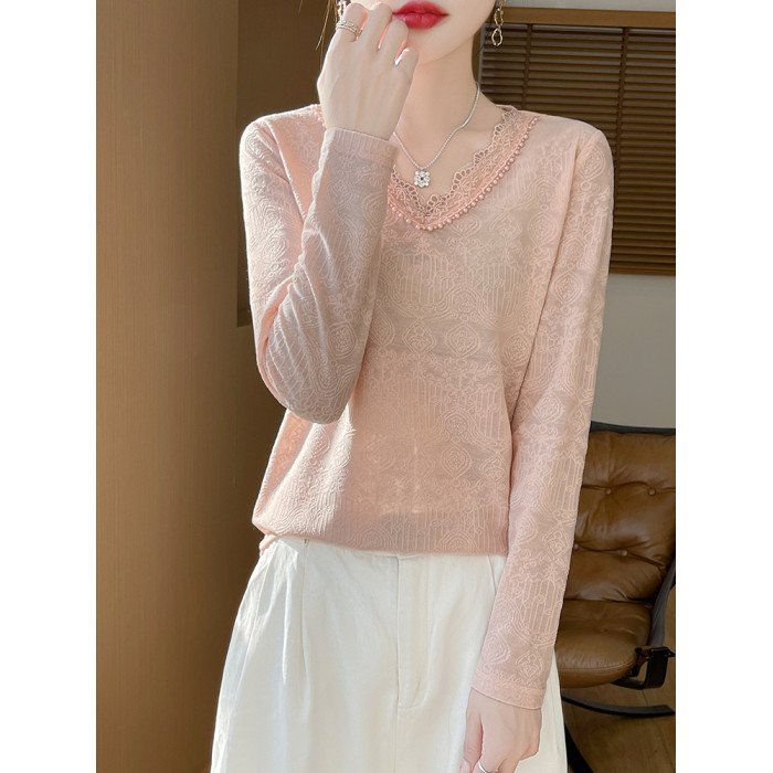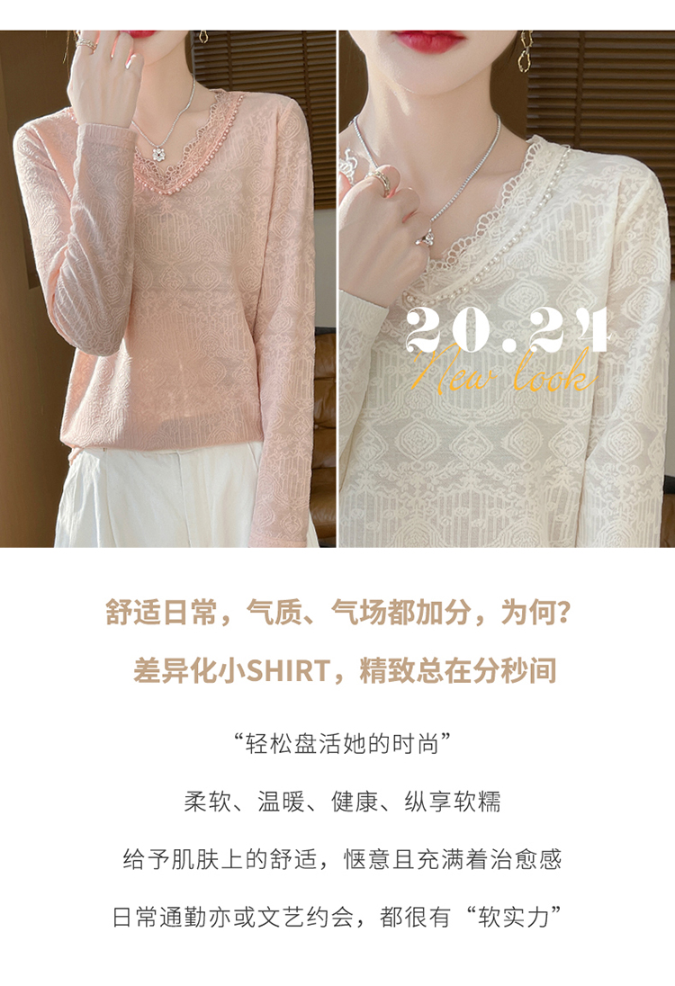 精紡羊毛高級感釘珠蕾絲拼接V領針織衫女春季內搭打底衫毛衣上衣