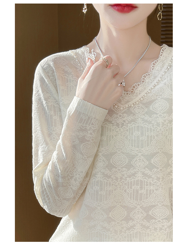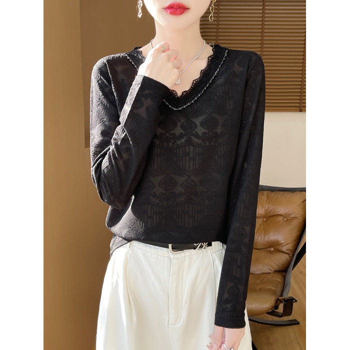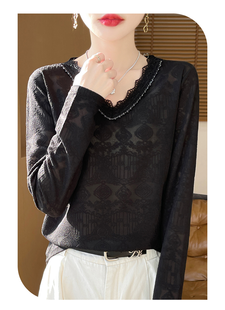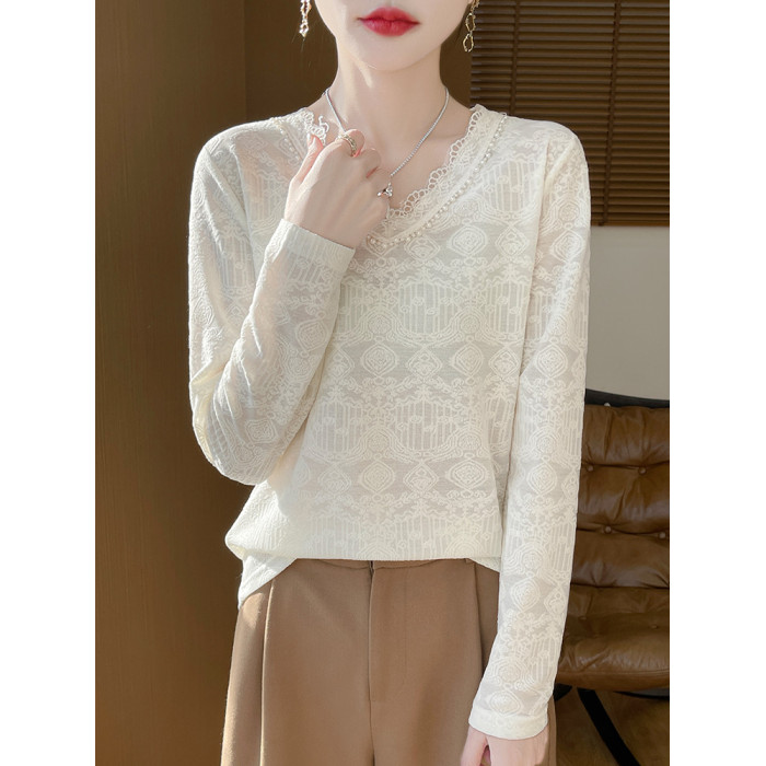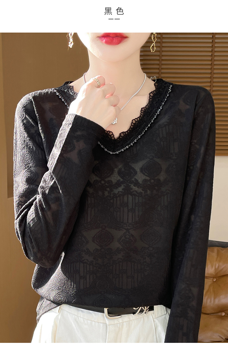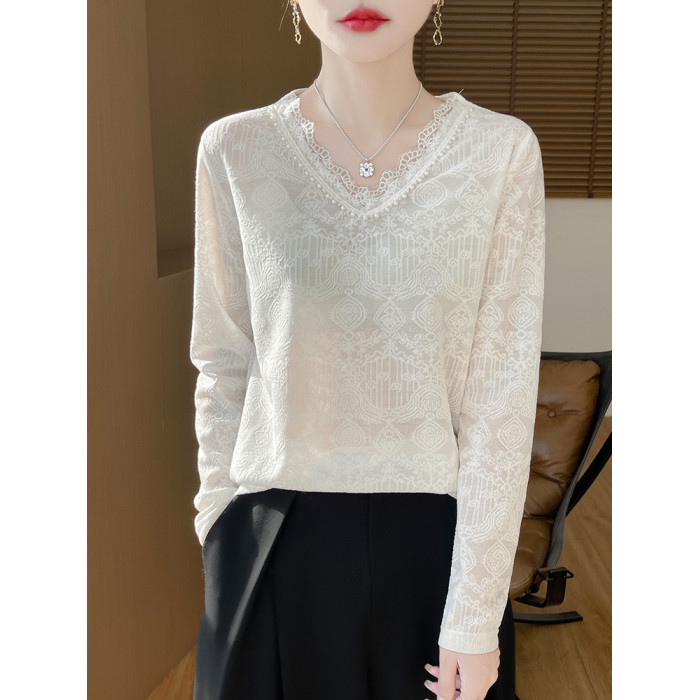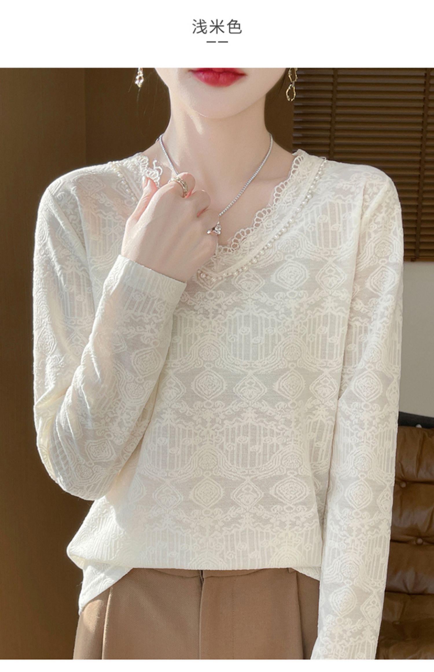 精紡羊毛高級感釘珠蕾絲拼接V領針織衫女春季內搭打底衫毛衣上衣
