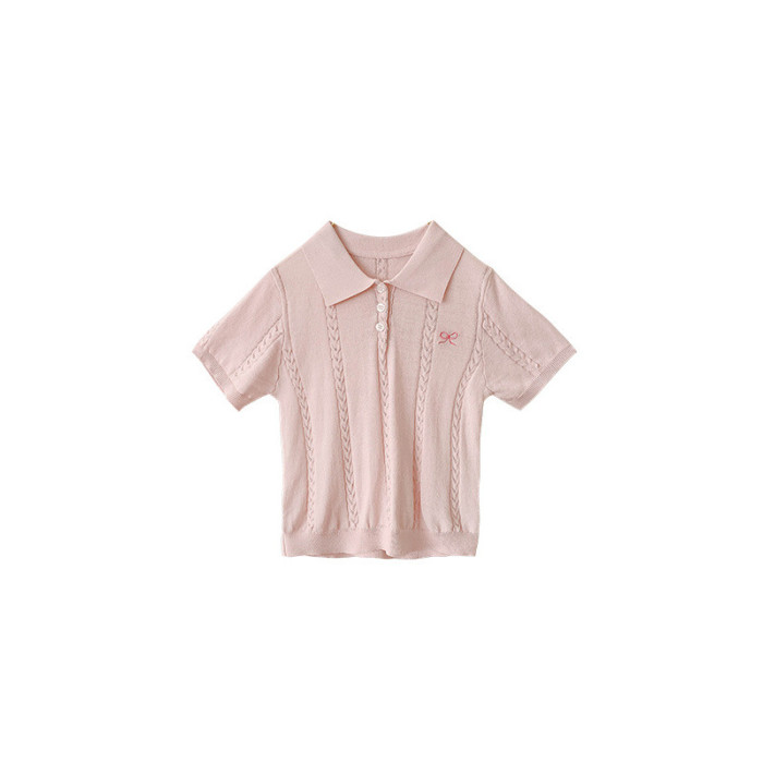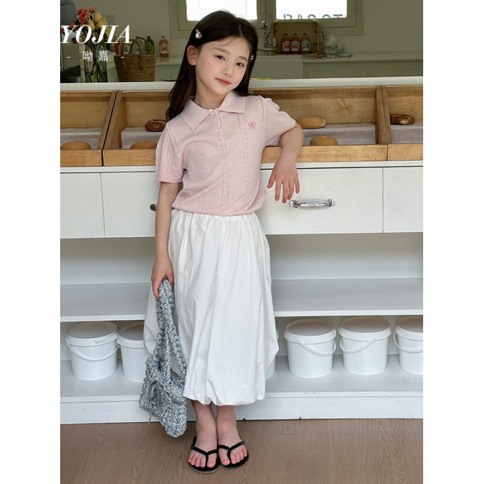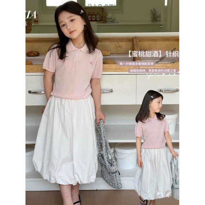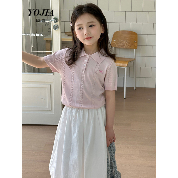 女童針織短袖夏季2025新款洋氣女大童刺綉蝴蝶結POLO衫兒童T恤薄