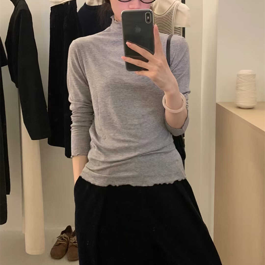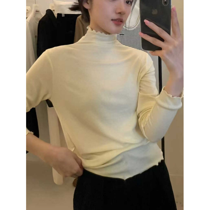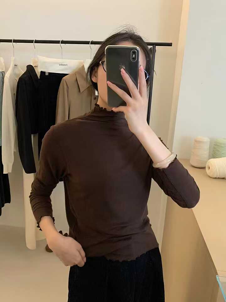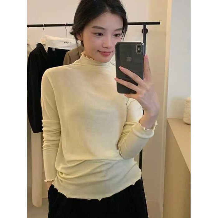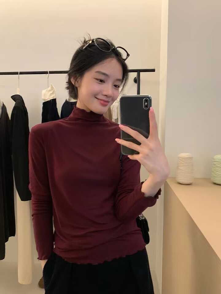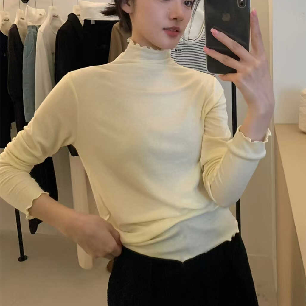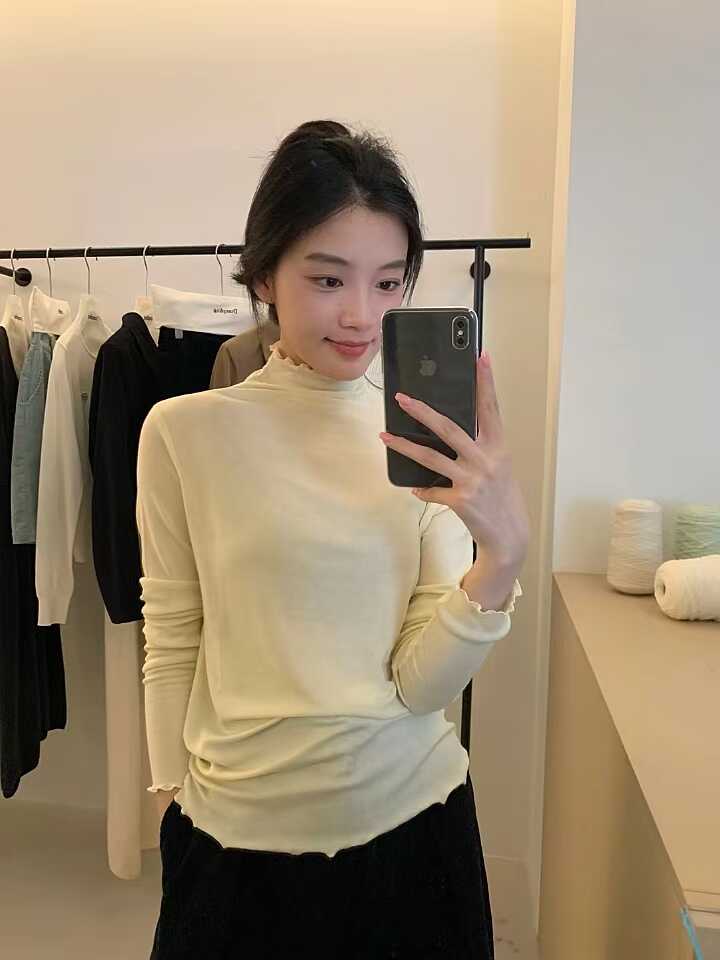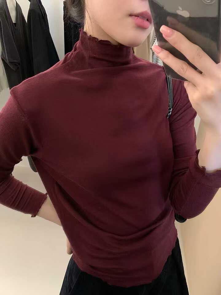 韓系木耳邊打底衫2025秋冬半高領薄款曡穿內搭天絲羊毛針織衫上衣