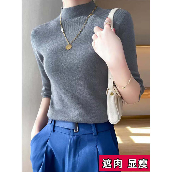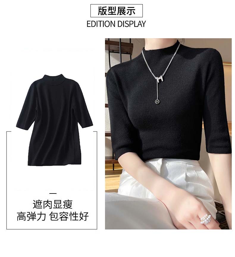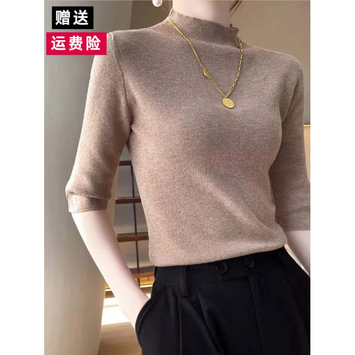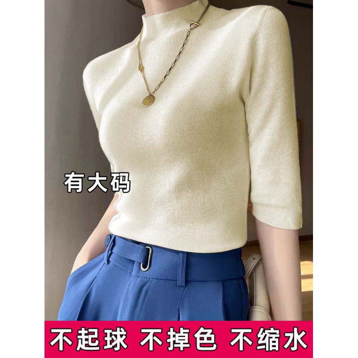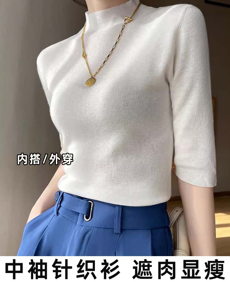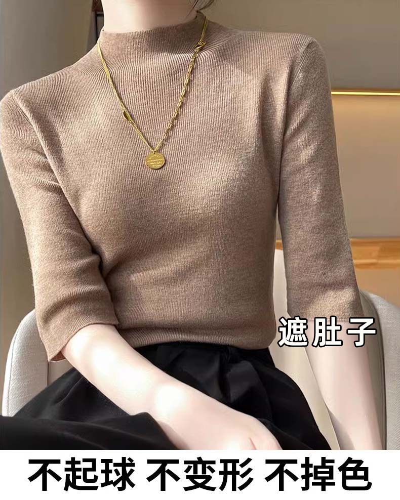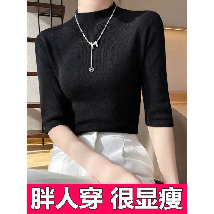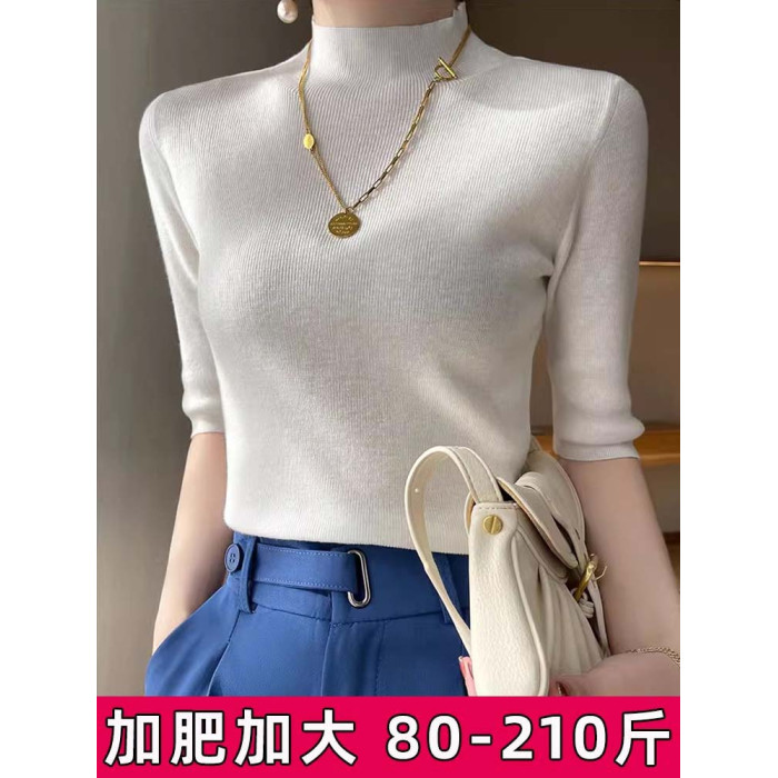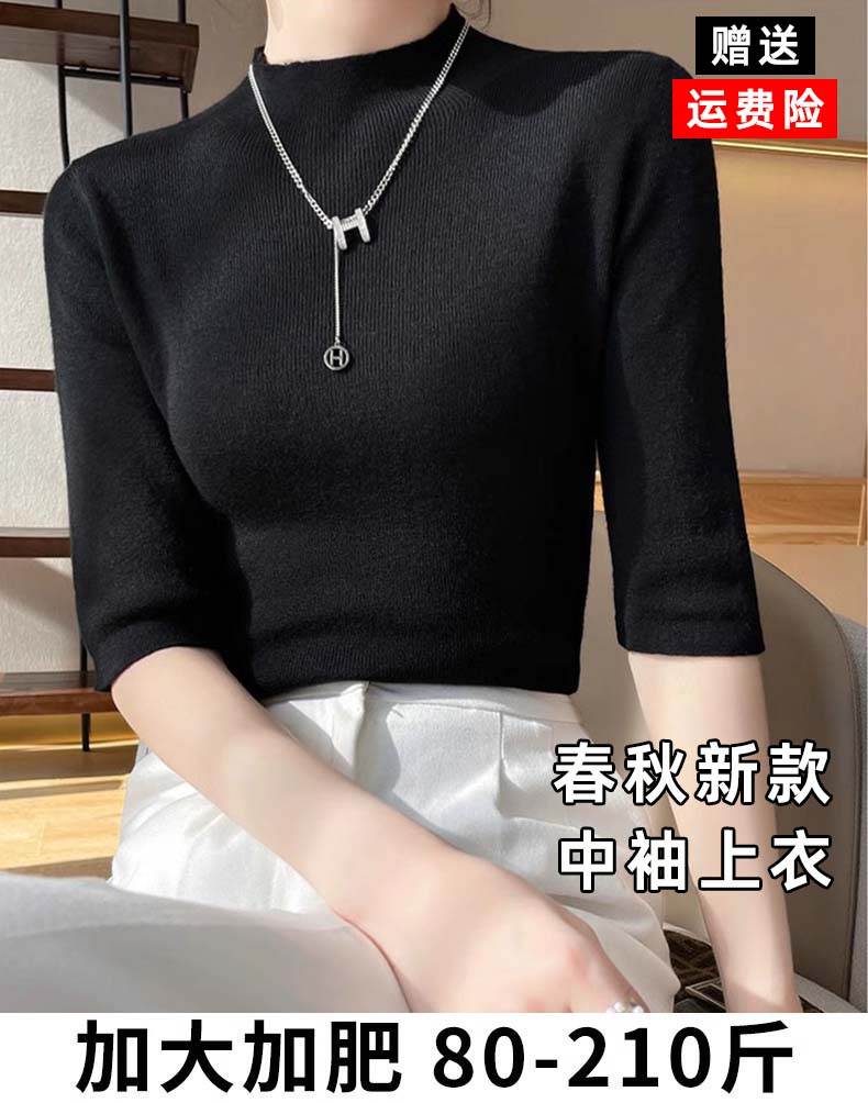 2025新款秋季半高領中袖針織衫女大碼寬松胖mm五分袖打底衫上衣