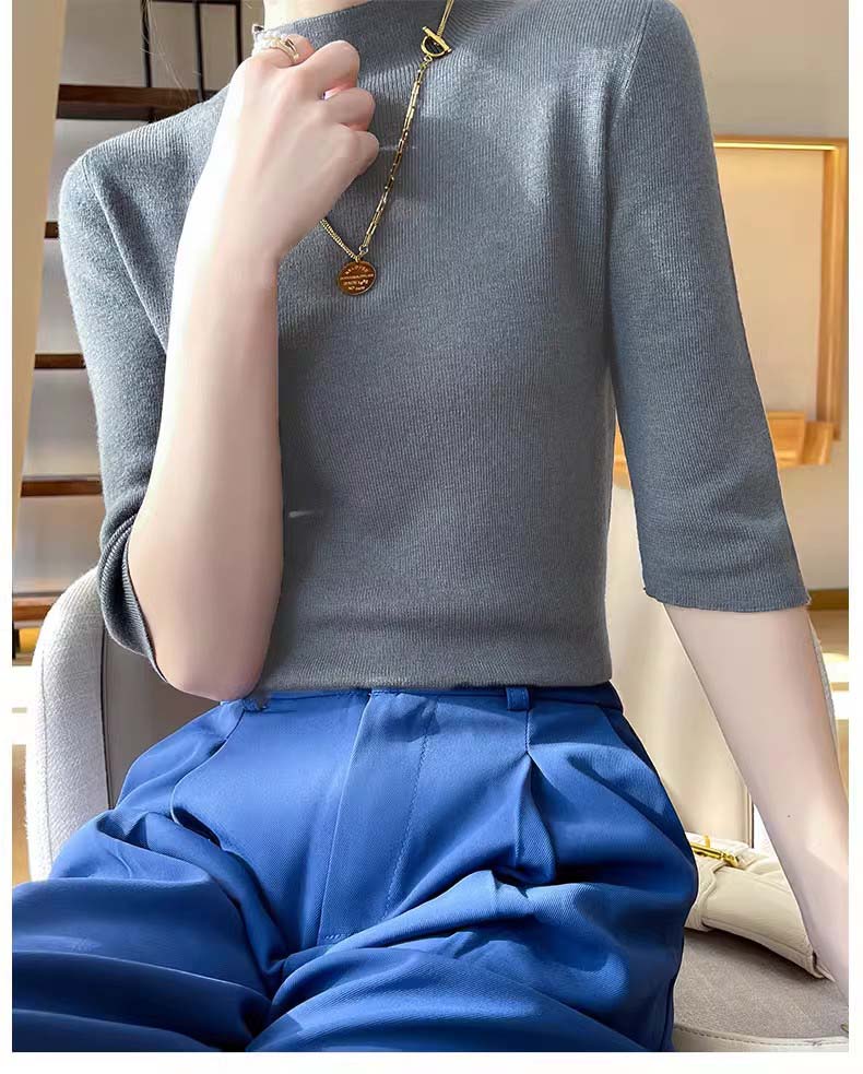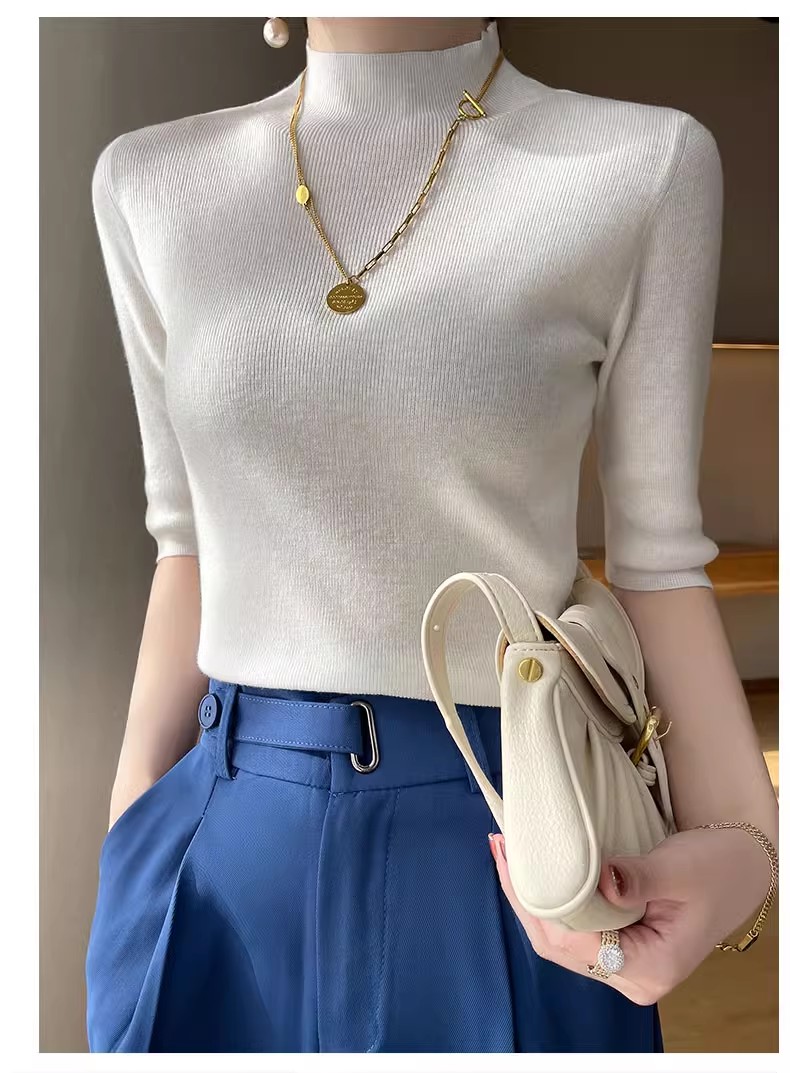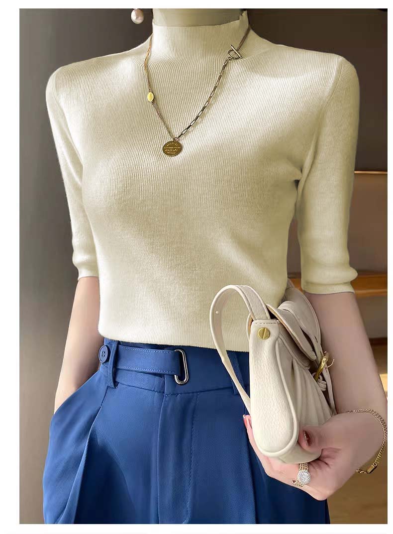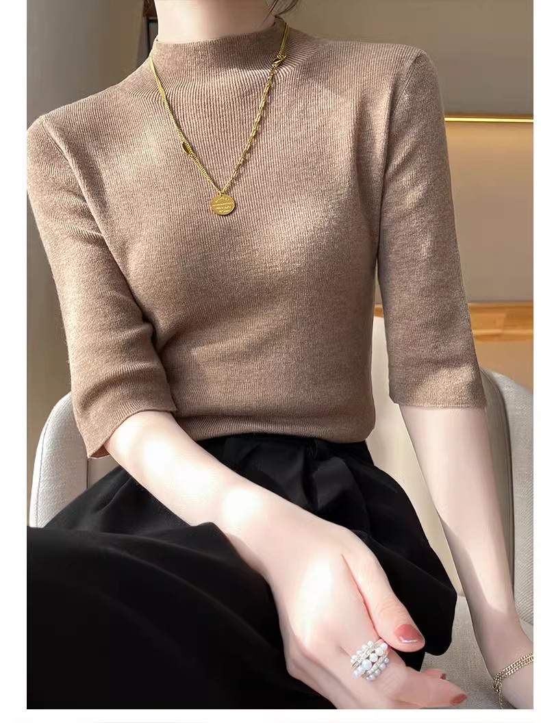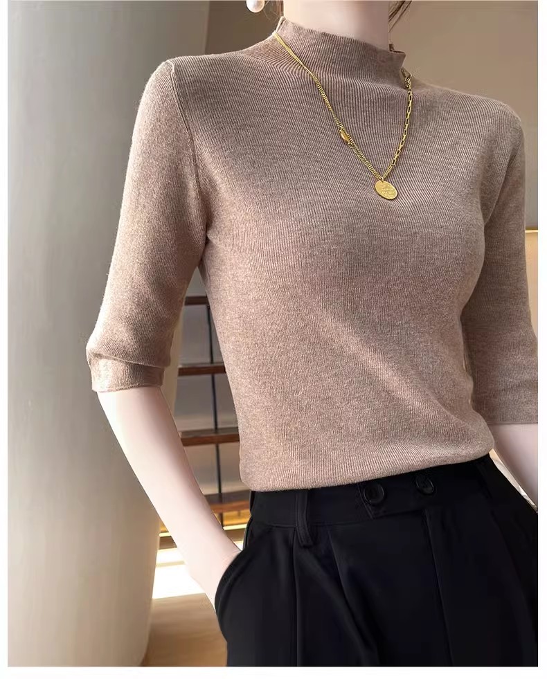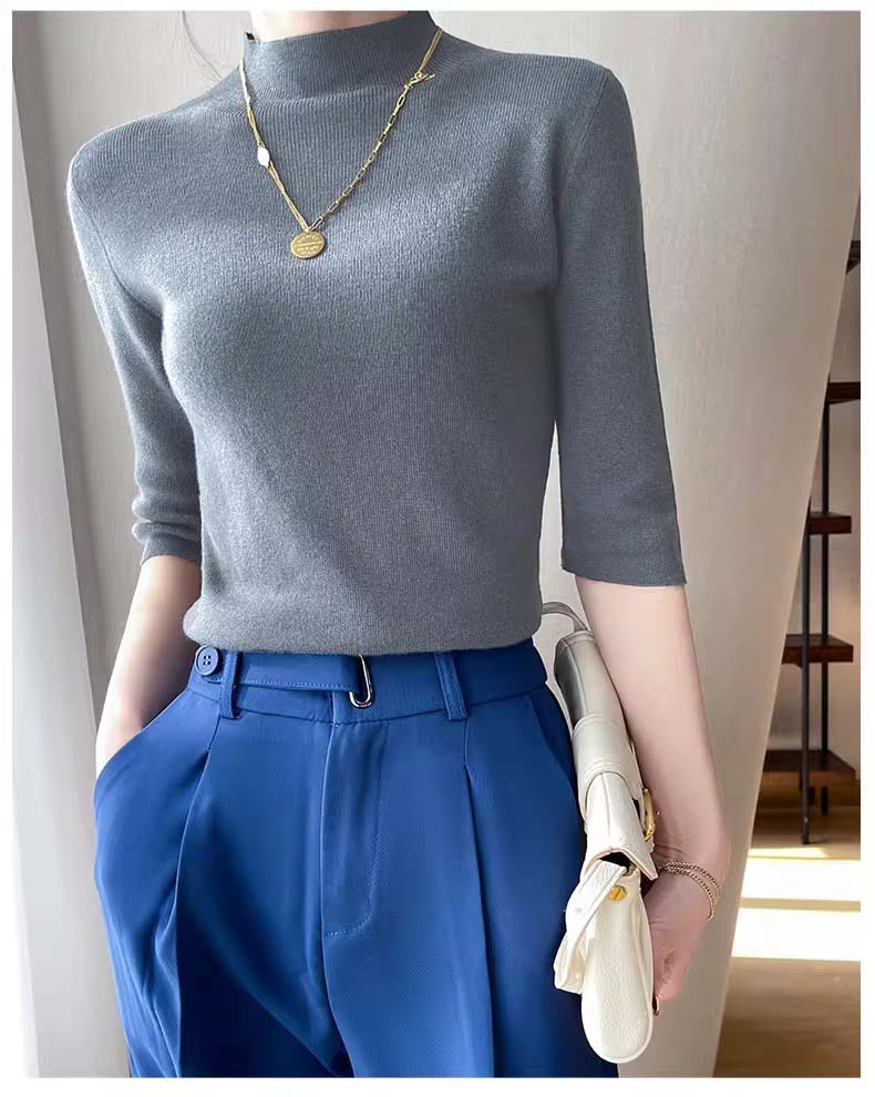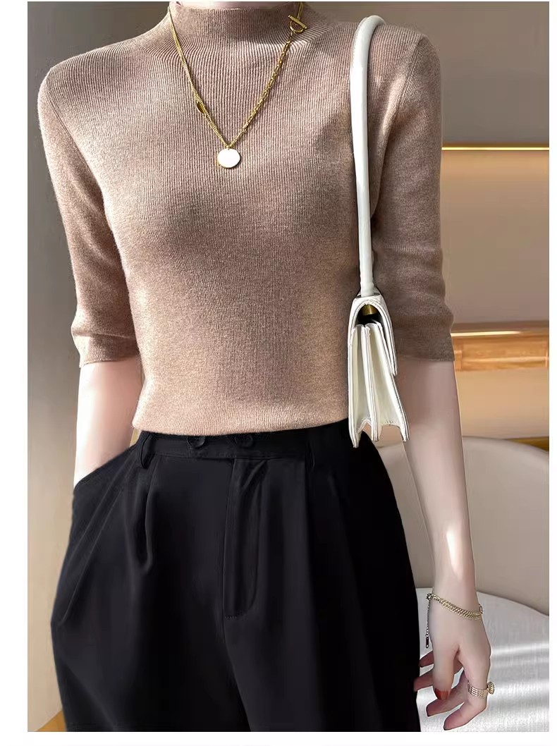 2025新款秋季半高領中袖針織衫女大碼寬松胖mm五分袖打底衫上衣