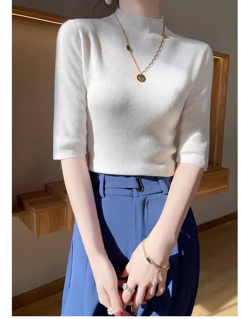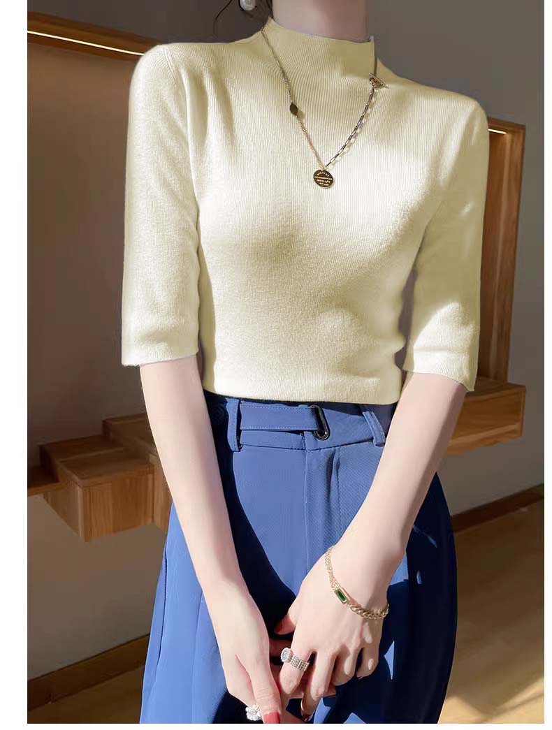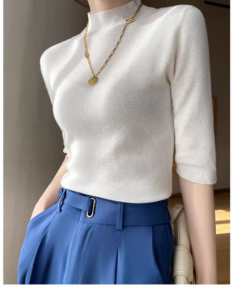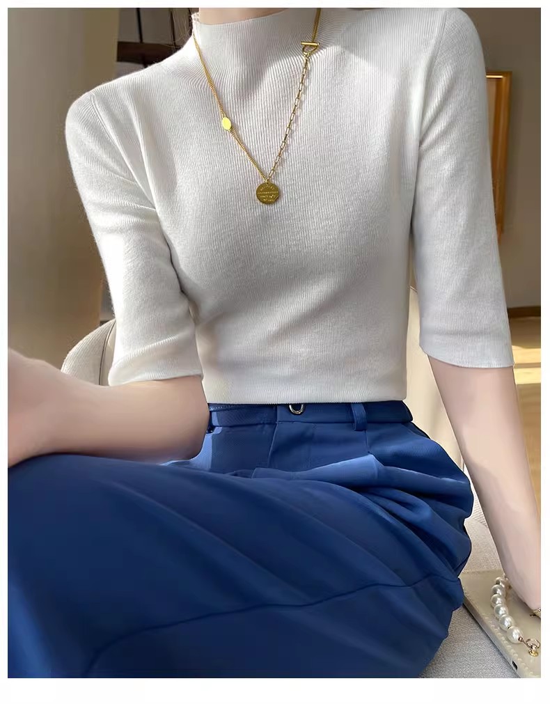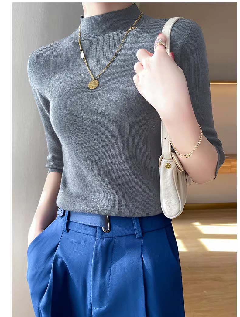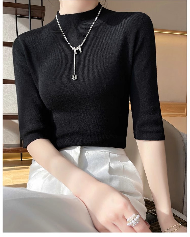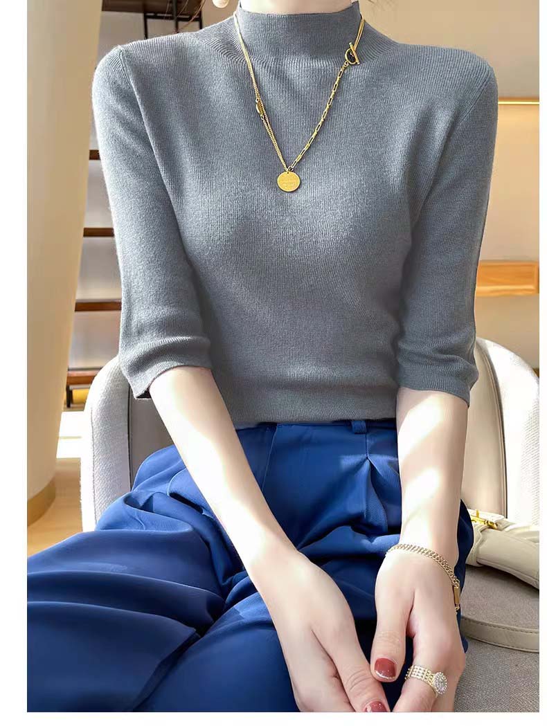 2025新款秋季半高領中袖針織衫女大碼寬松胖mm五分袖打底衫上衣