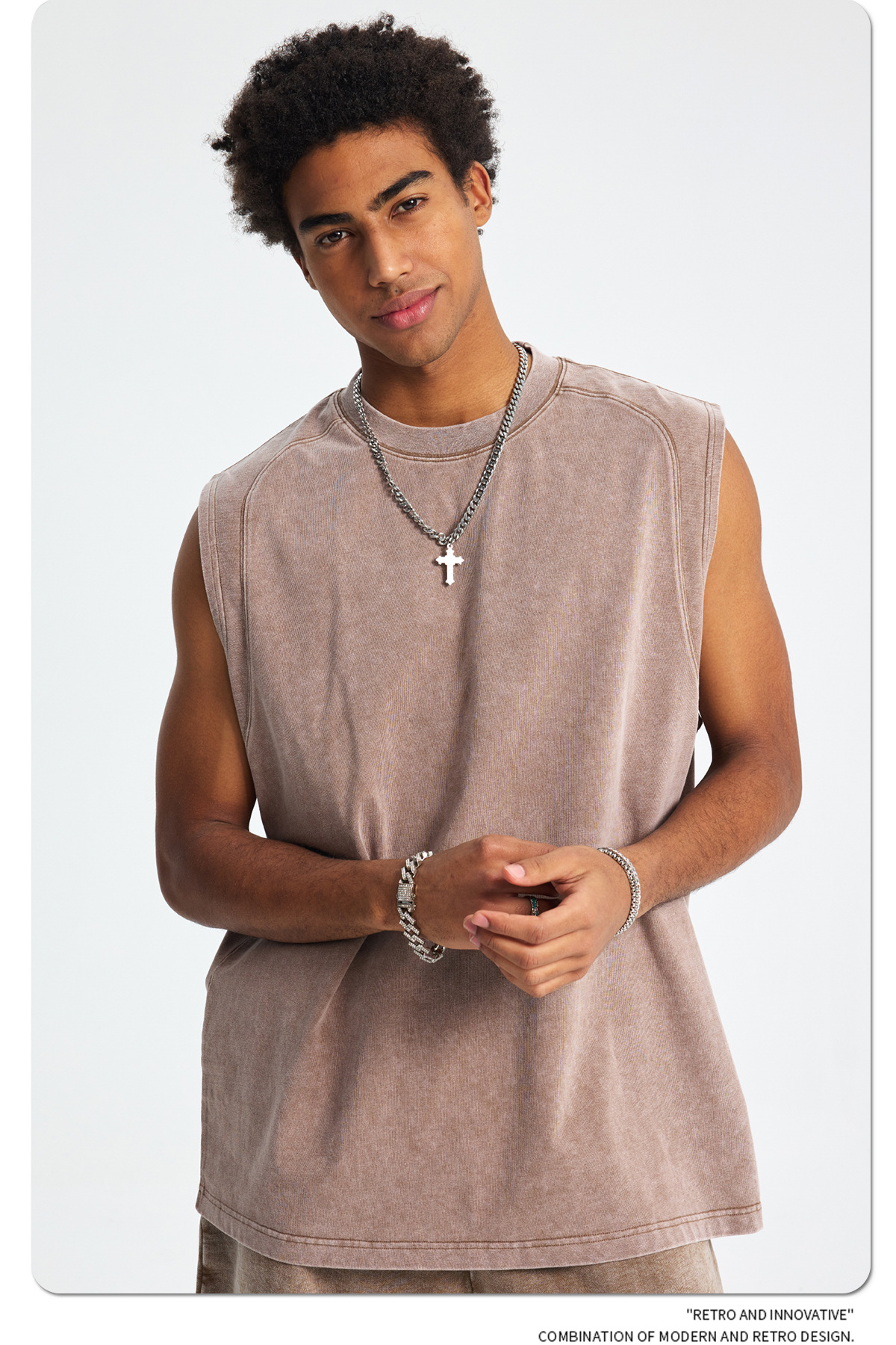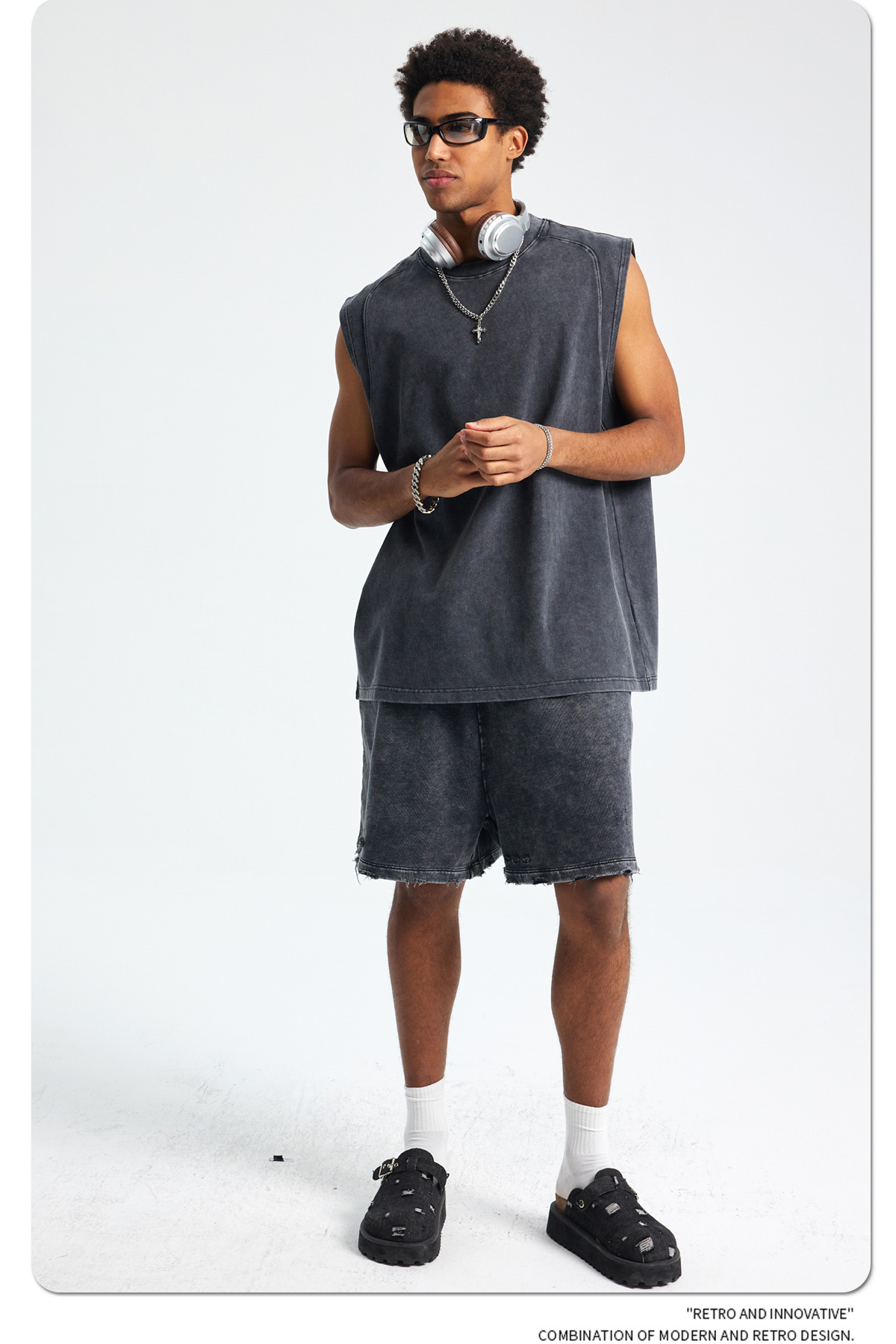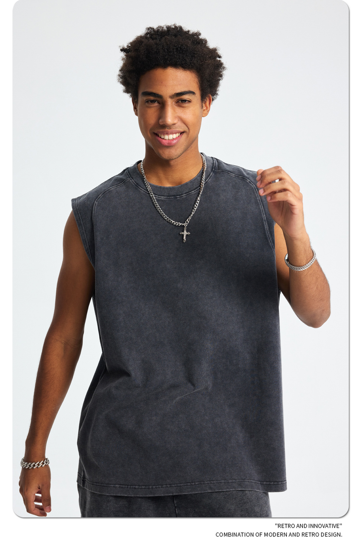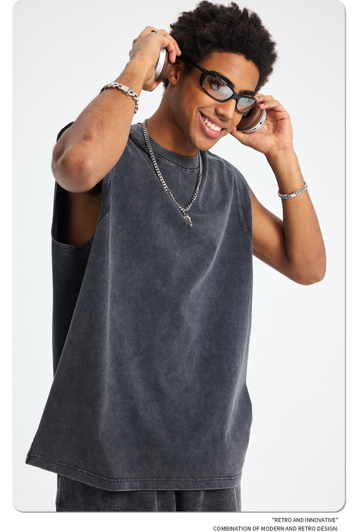 美式潮牌寬松寬肩重磅蠟染做舊運動健身圓領無袖T恤背心男坎肩夏