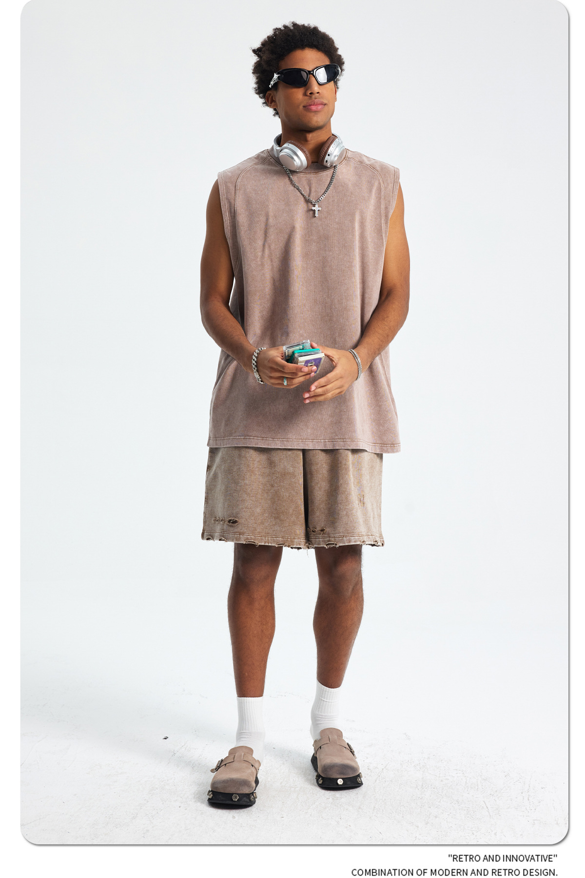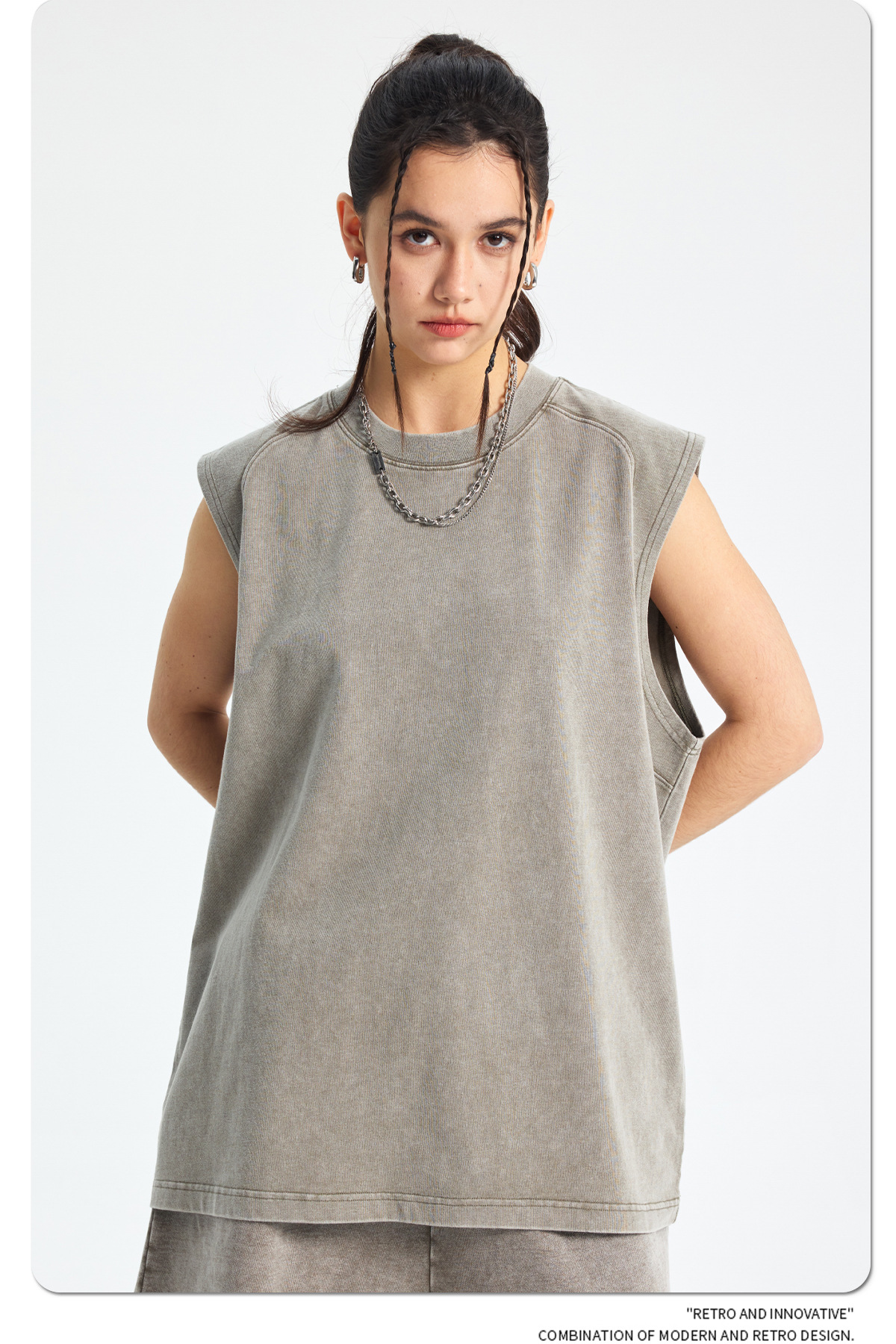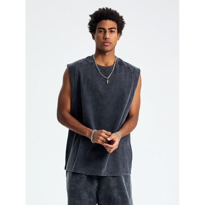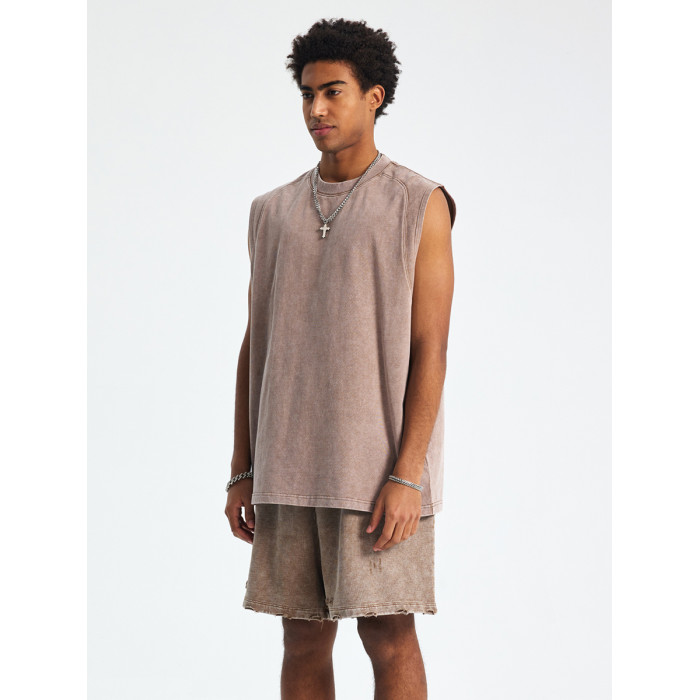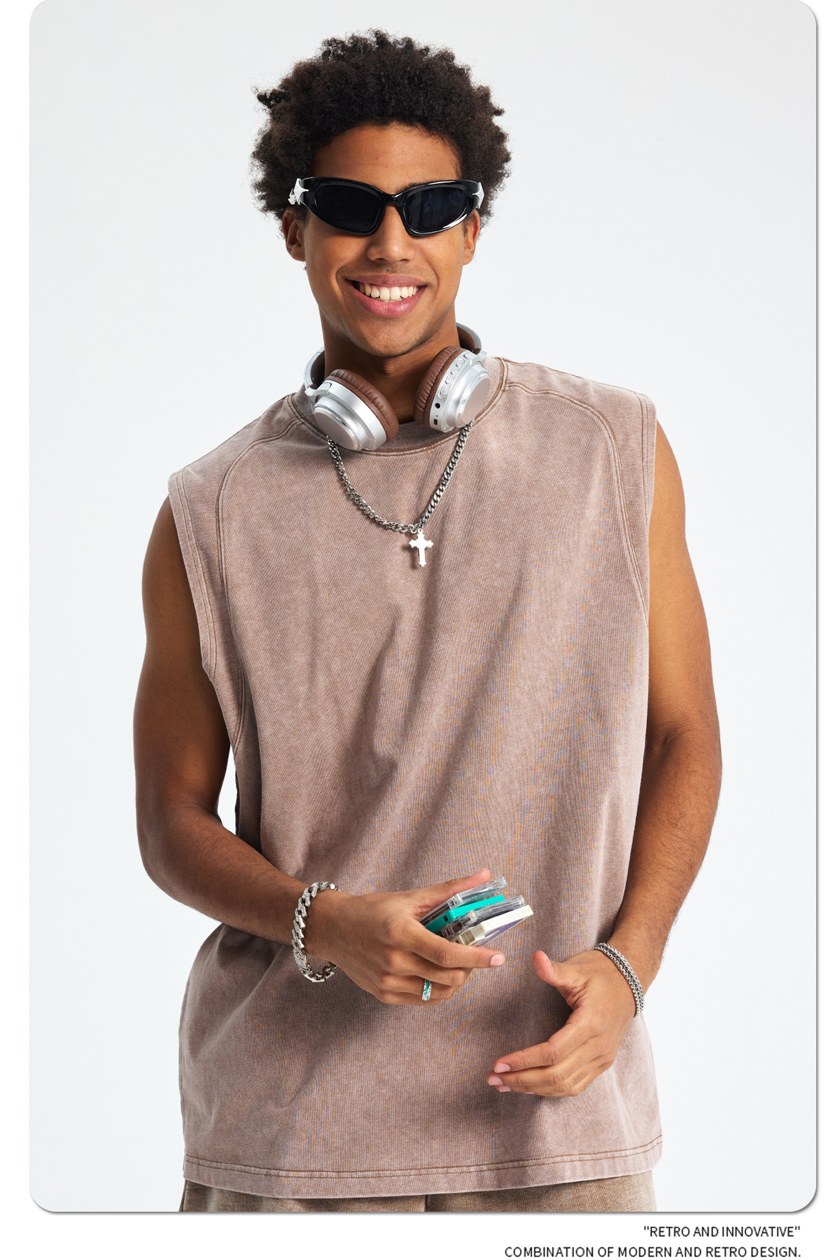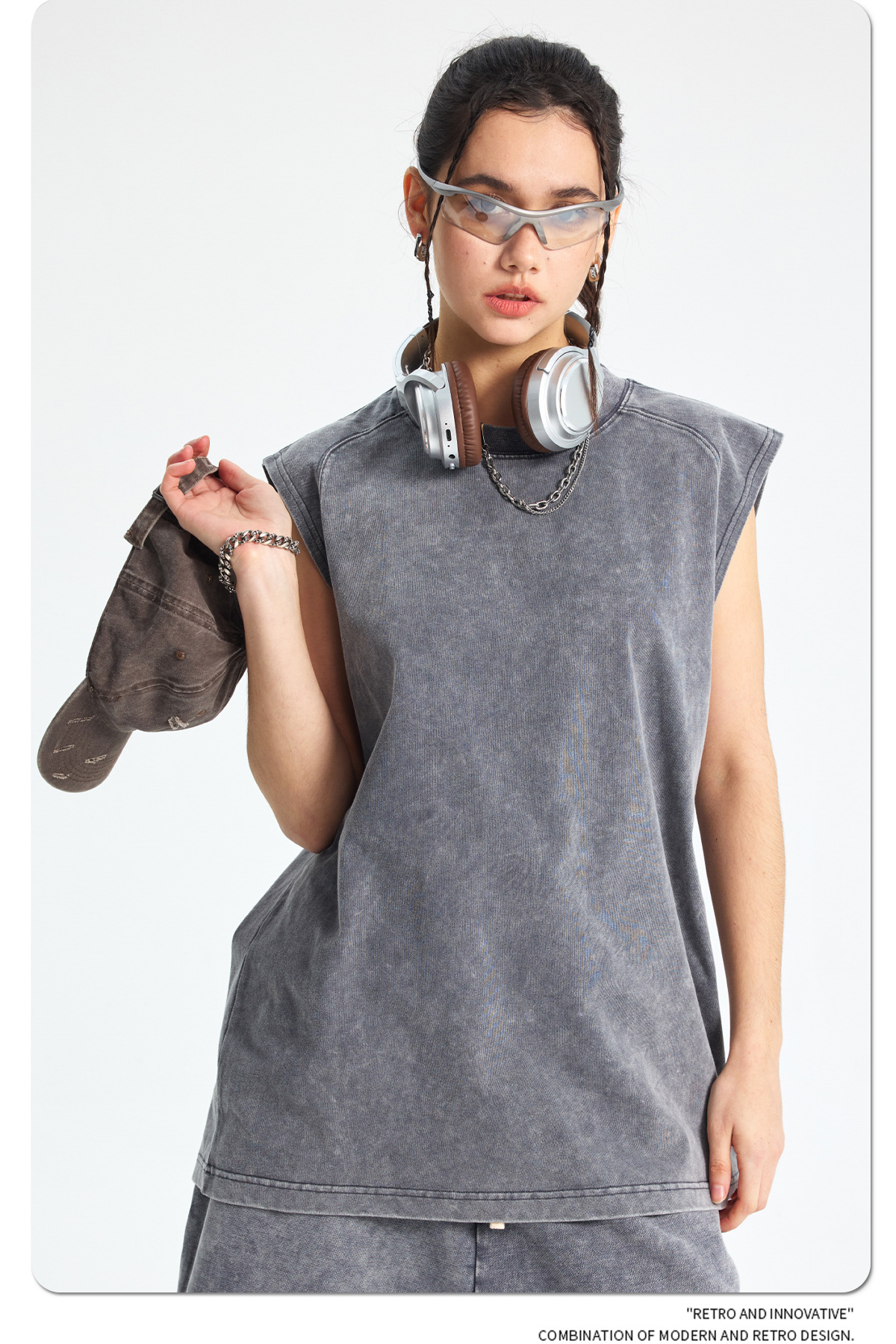 美式潮牌寬松寬肩重磅蠟染做舊運動健身圓領無袖T恤背心男坎肩夏