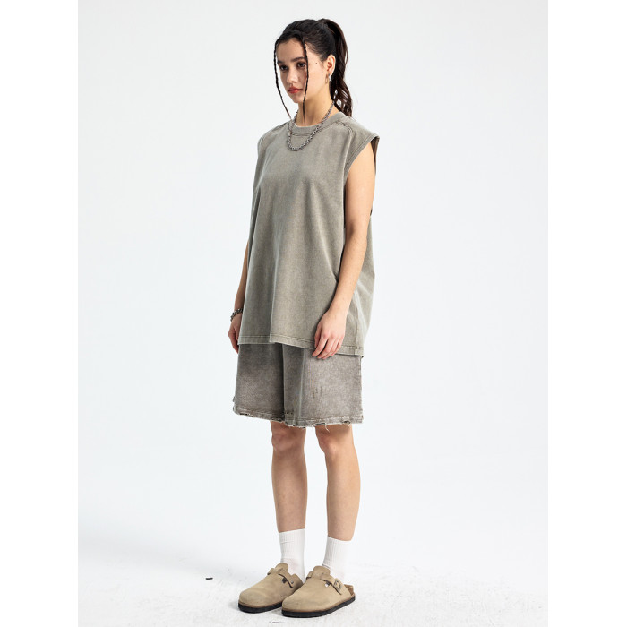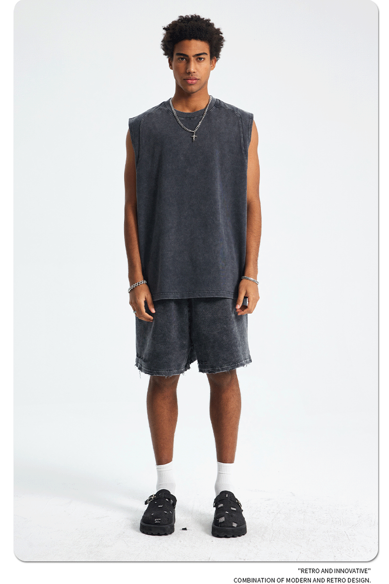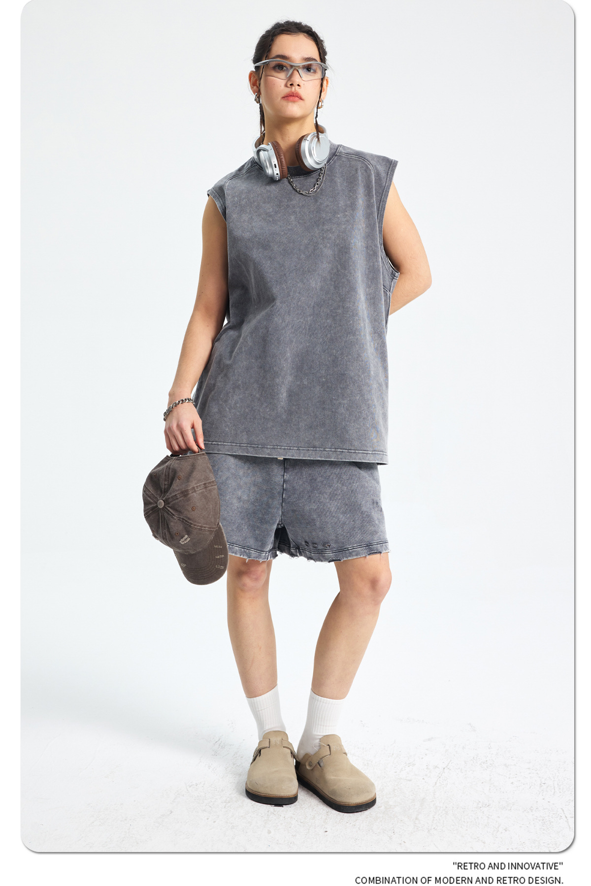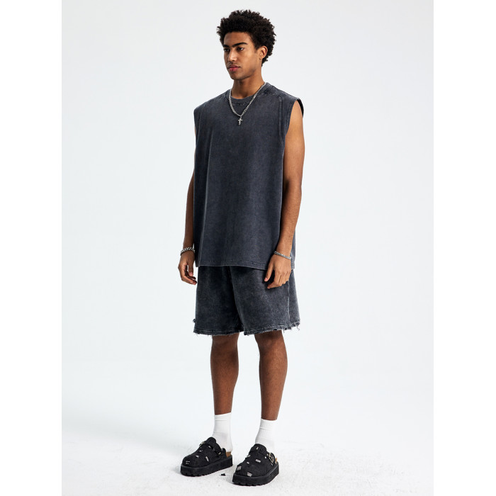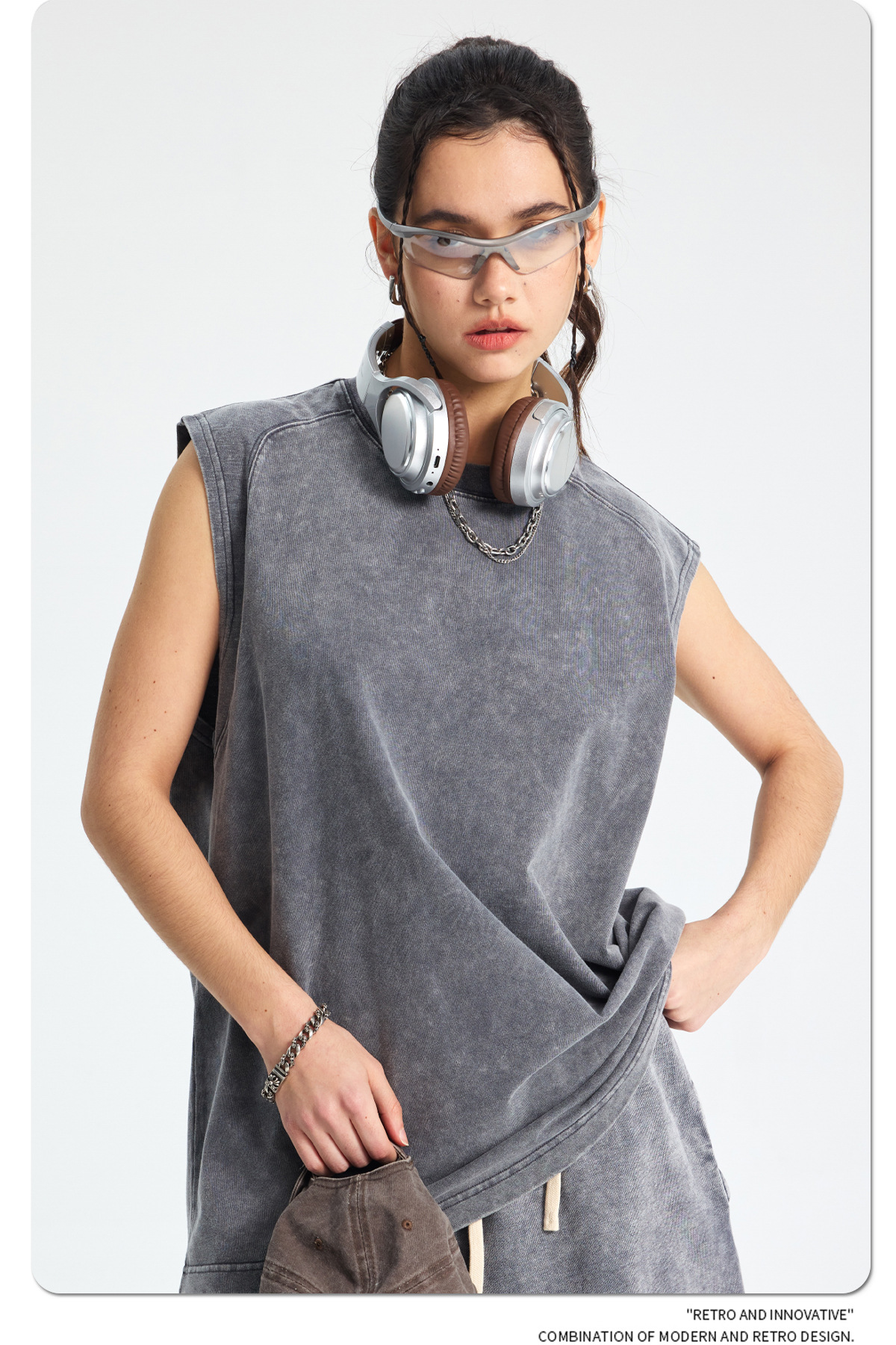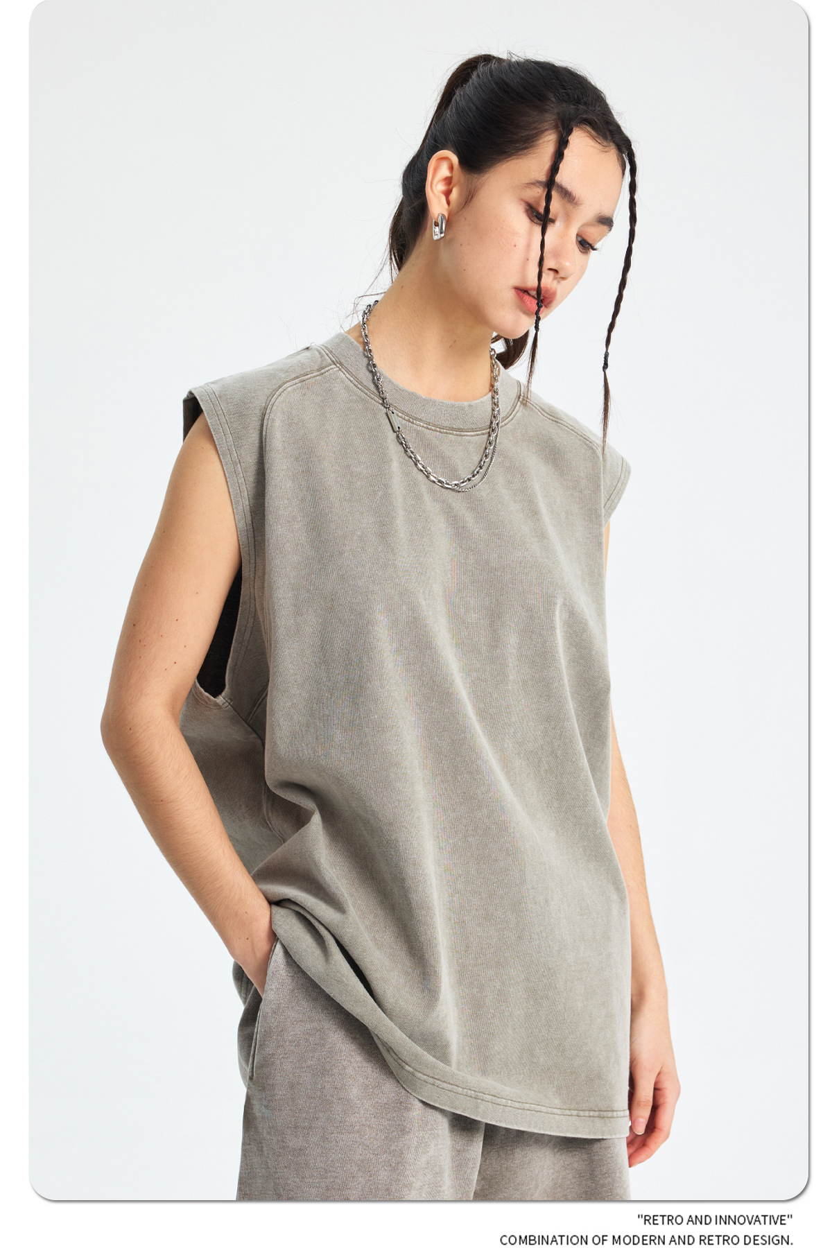 美式潮牌寬松寬肩重磅蠟染做舊運動健身圓領無袖T恤背心男坎肩夏