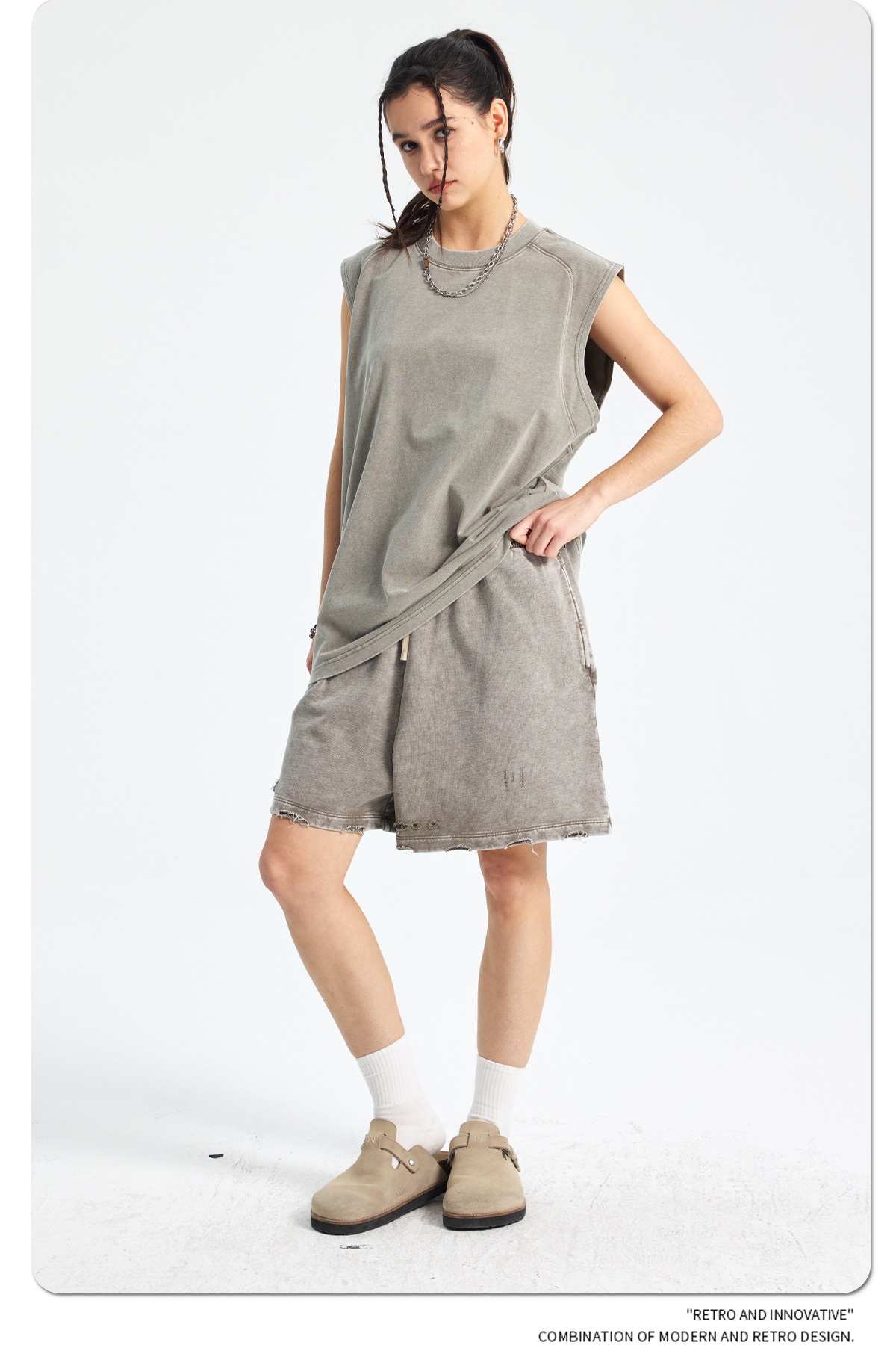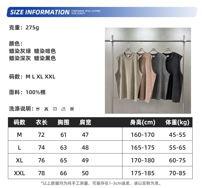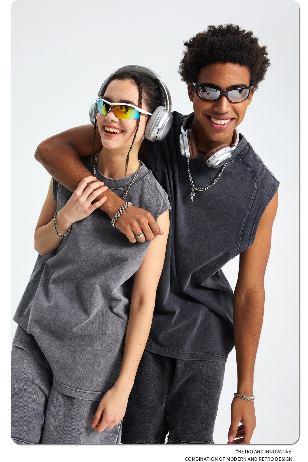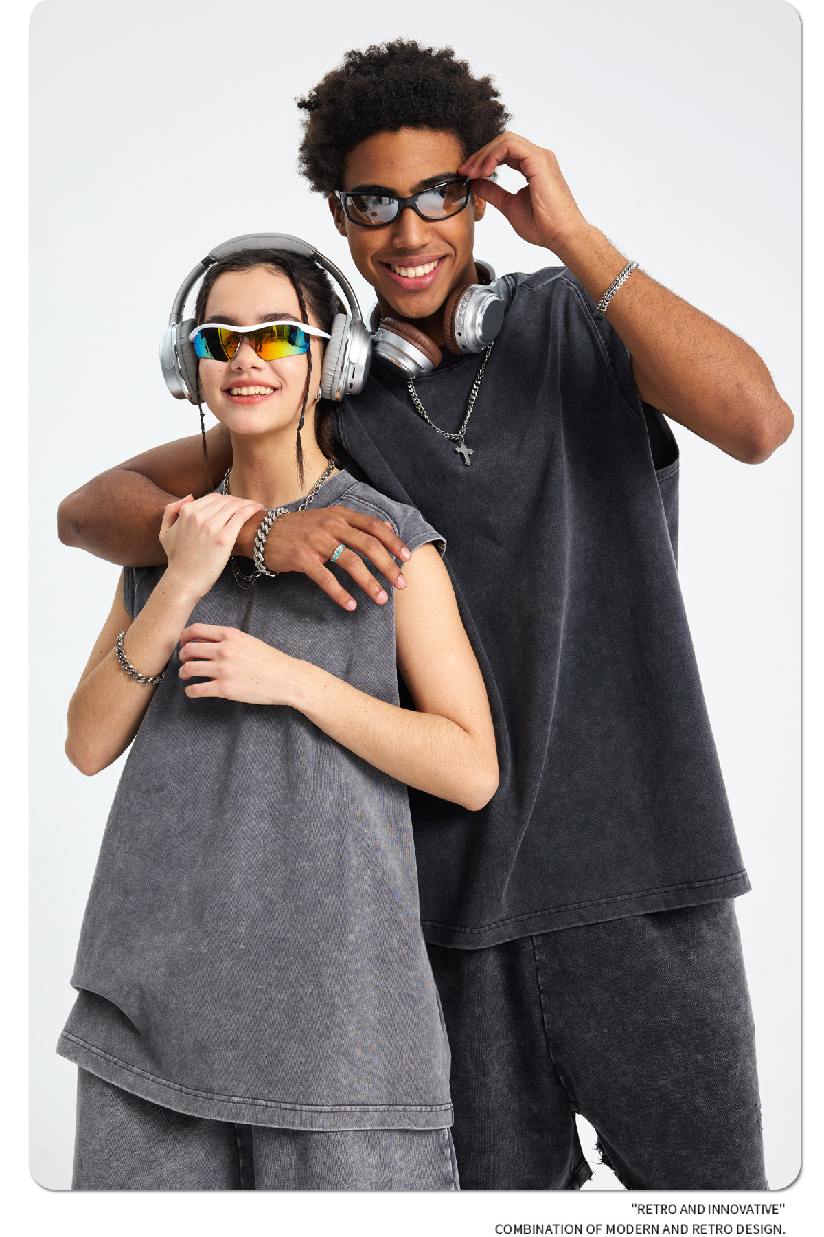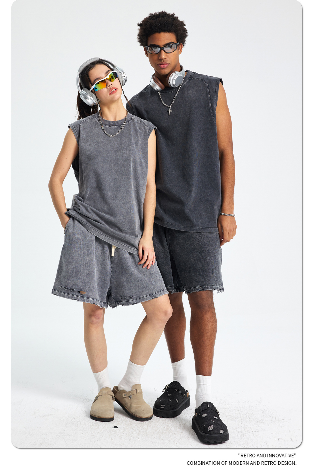 美式潮牌寬松寬肩重磅蠟染做舊運動健身圓領無袖T恤背心男坎肩夏