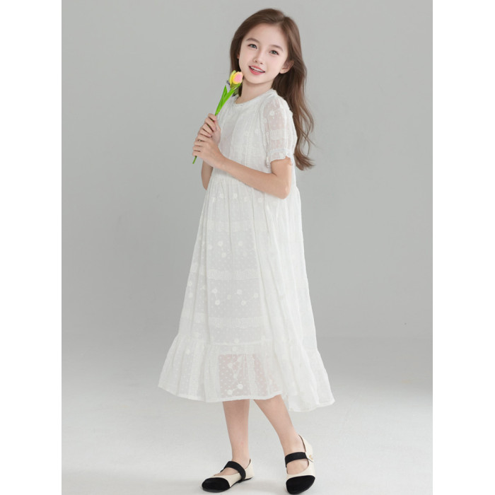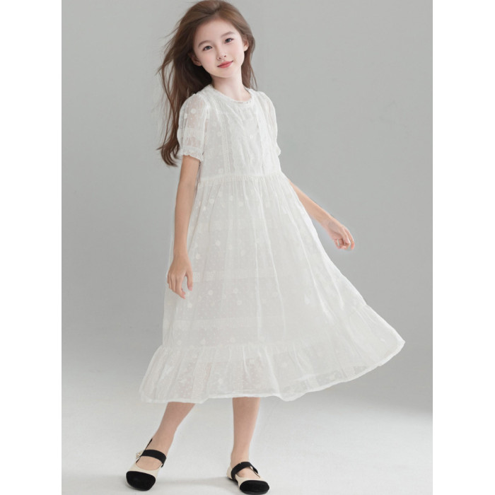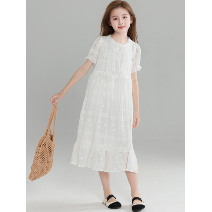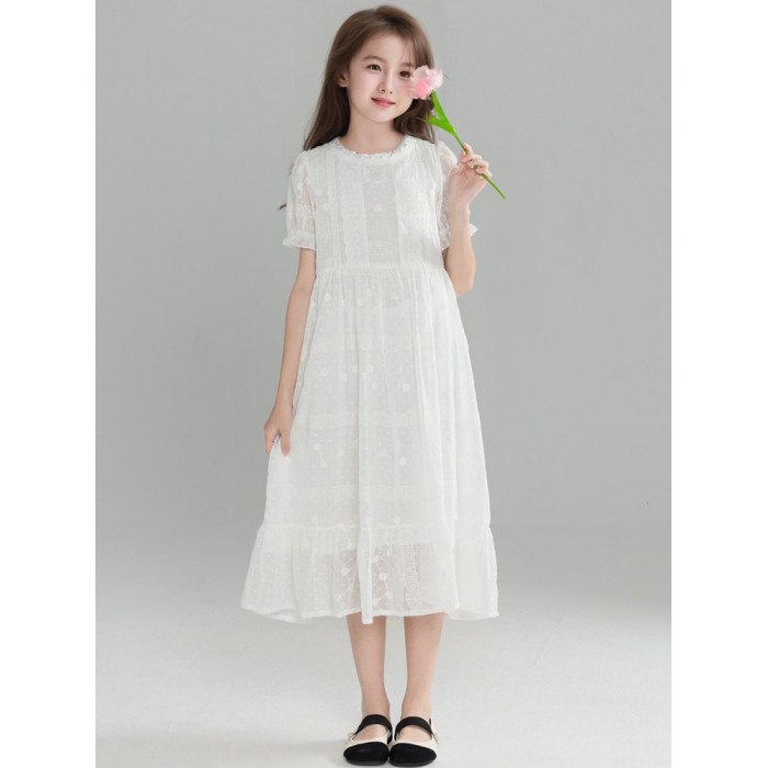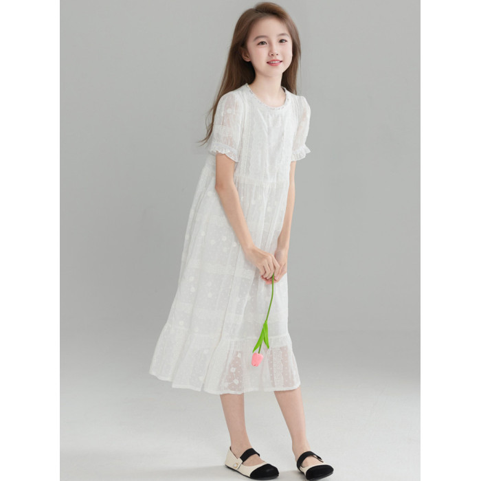 夏季女童鏤空蕾絲花邊白色雪紡連衣裙 童裝夏款刺綉裙子 中大兒童