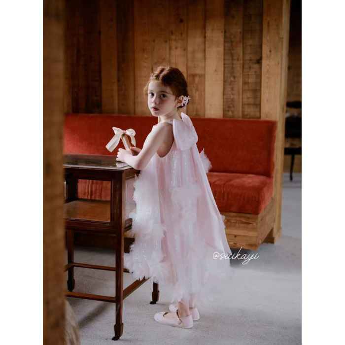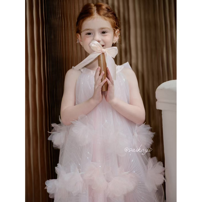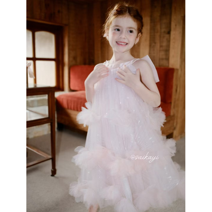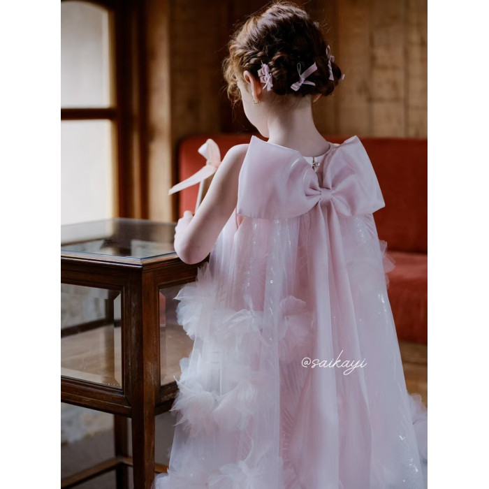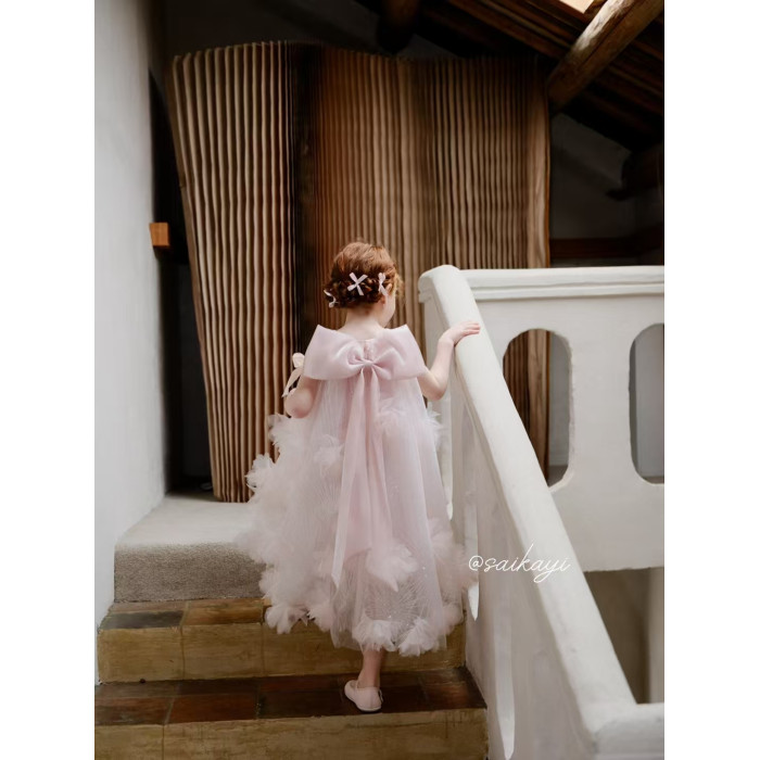 女童蝴蝶結粉色連衣裙夏花童生日晚宴高定禮服裙蓬蓬網紗仙女長裙