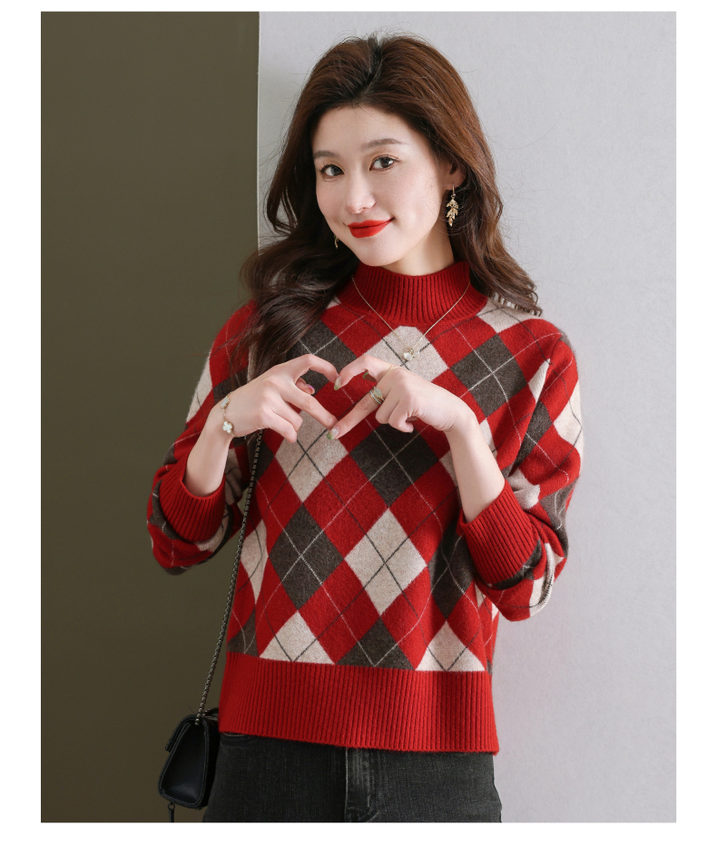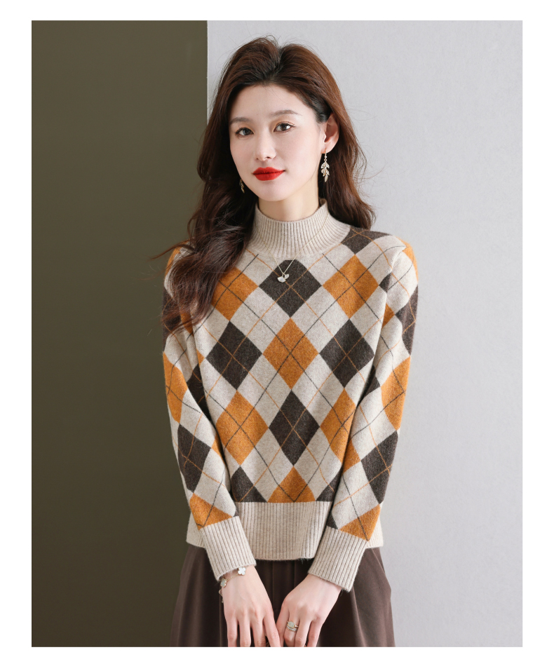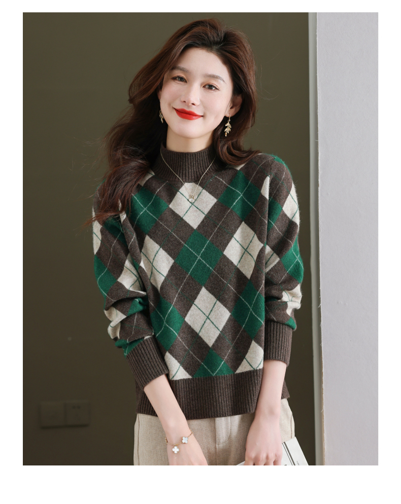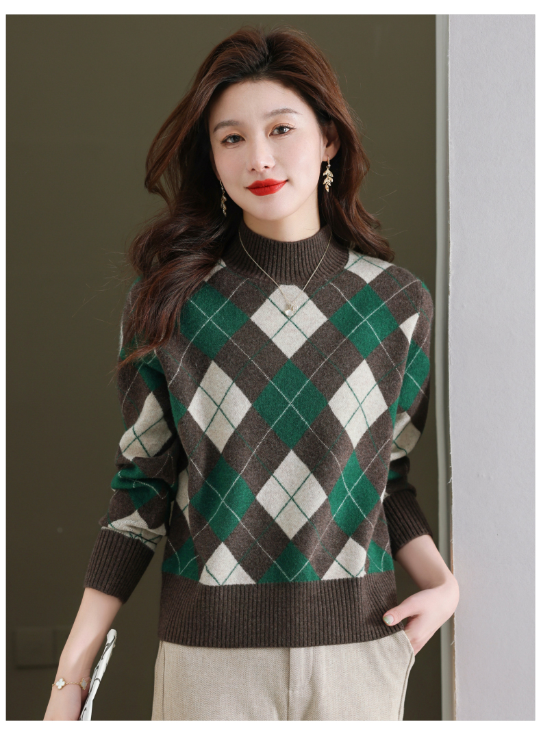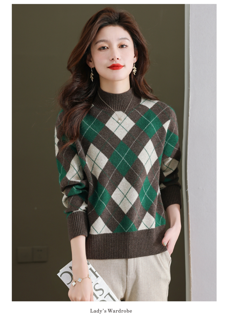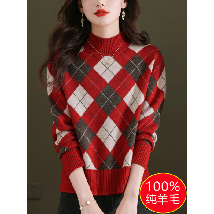半高領女士毛衣100純羊毛衫秋冬打底衫菱形格子上衣內搭針織衫厚