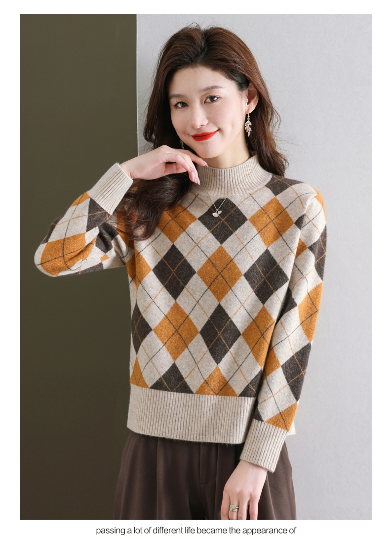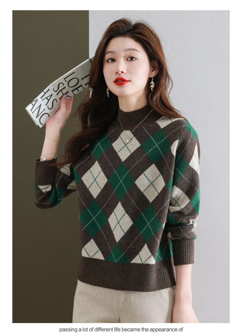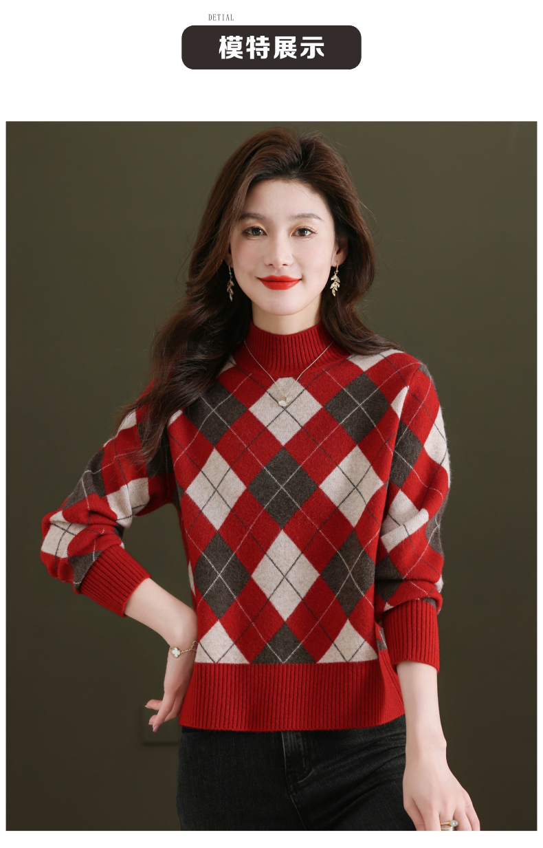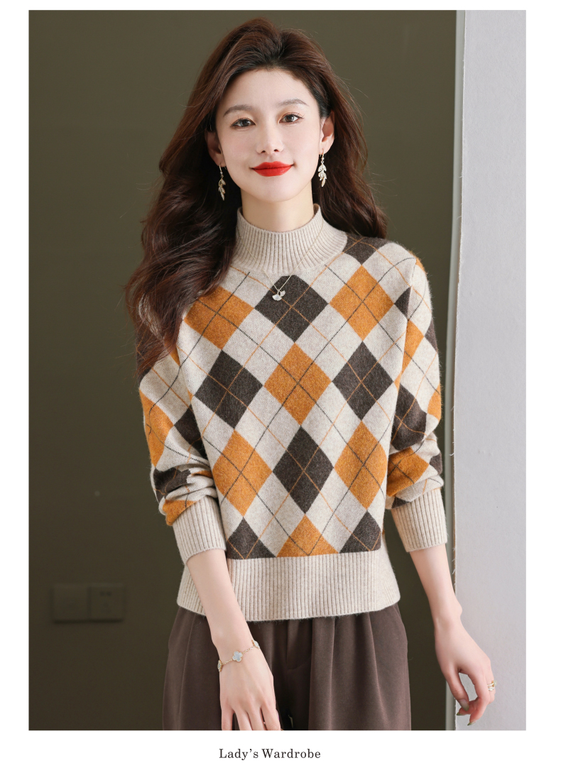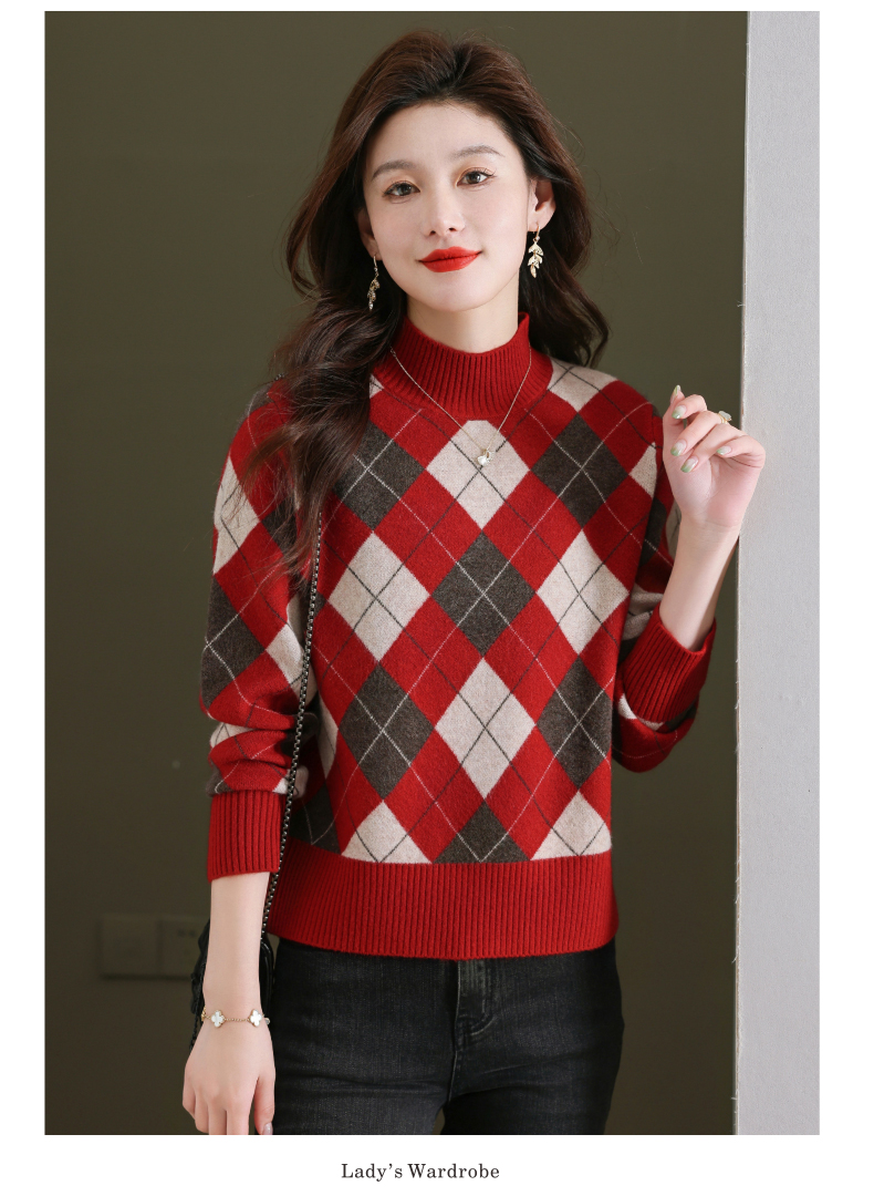 半高領女士毛衣100純羊毛衫秋冬打底衫菱形格子上衣內搭針織衫厚