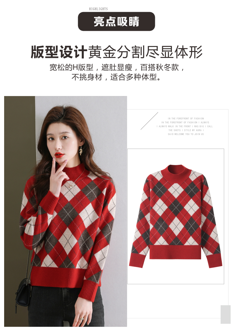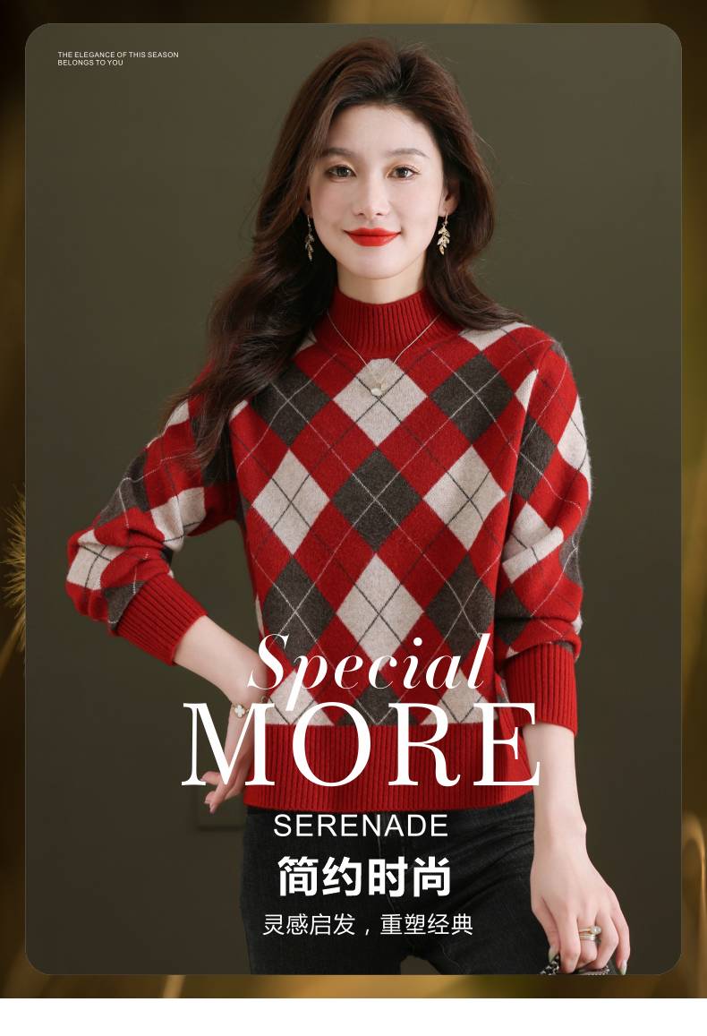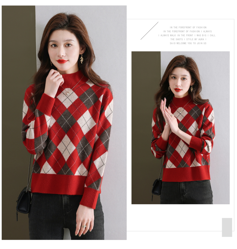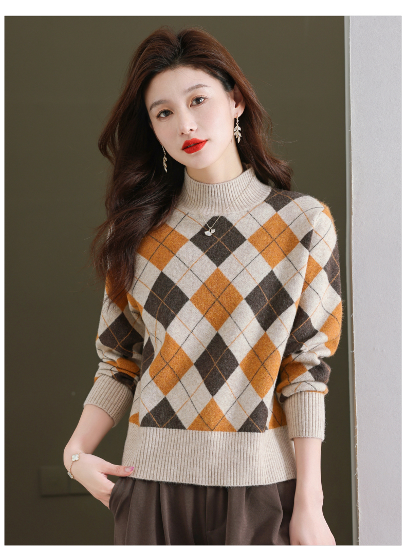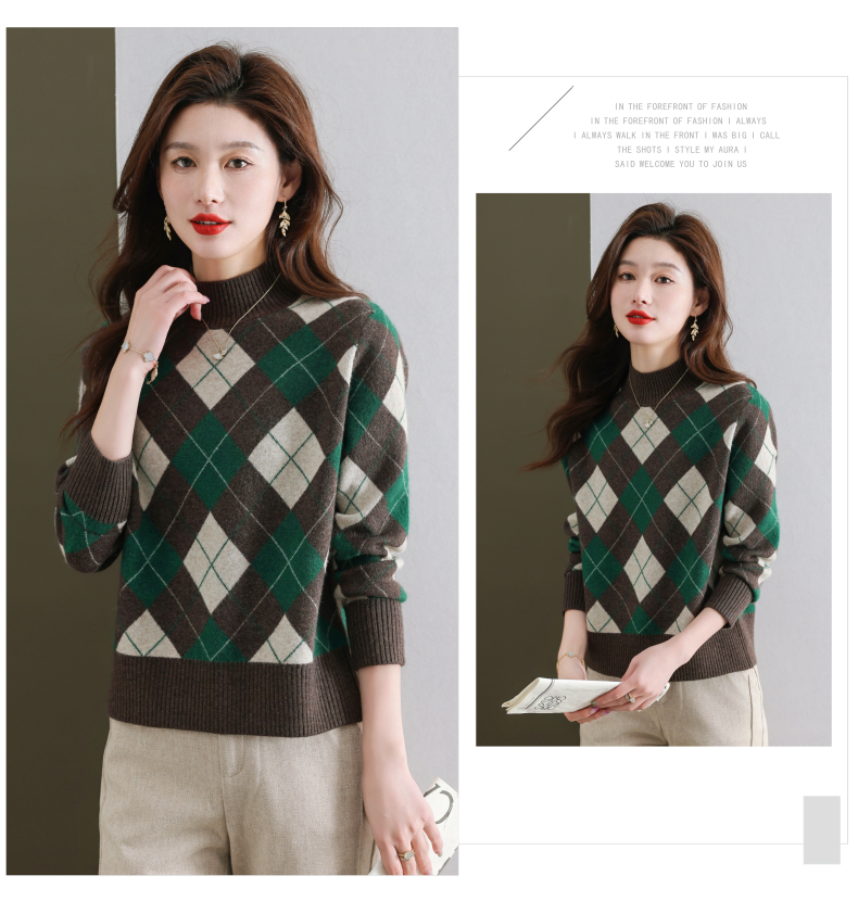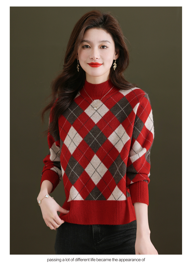 半高領女士毛衣100純羊毛衫秋冬打底衫菱形格子上衣內搭針織衫厚