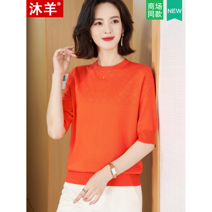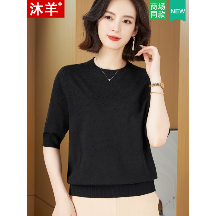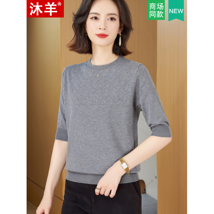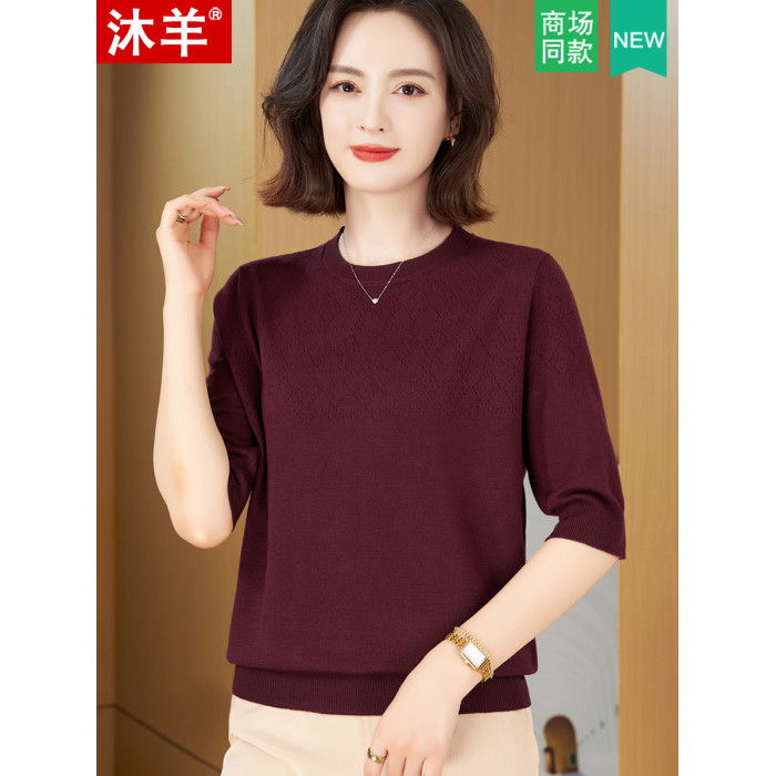 超細羊毛衫女春秋中袖薄款圓領外穿毛衣寬松大碼五分袖針織打底衫