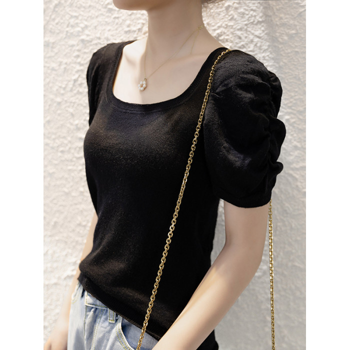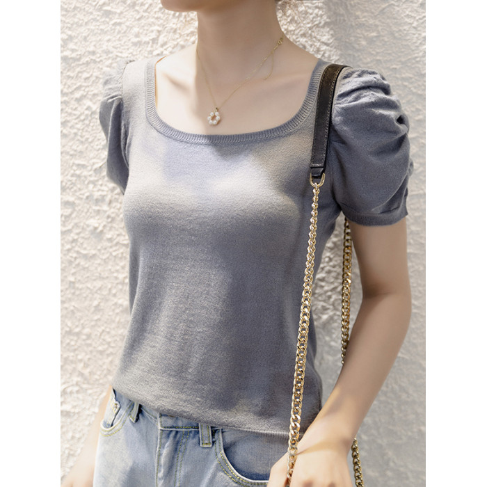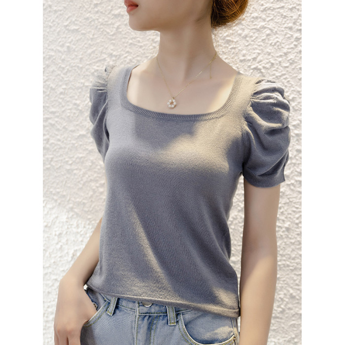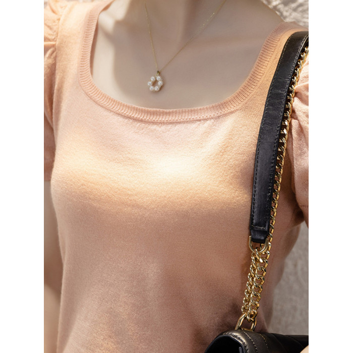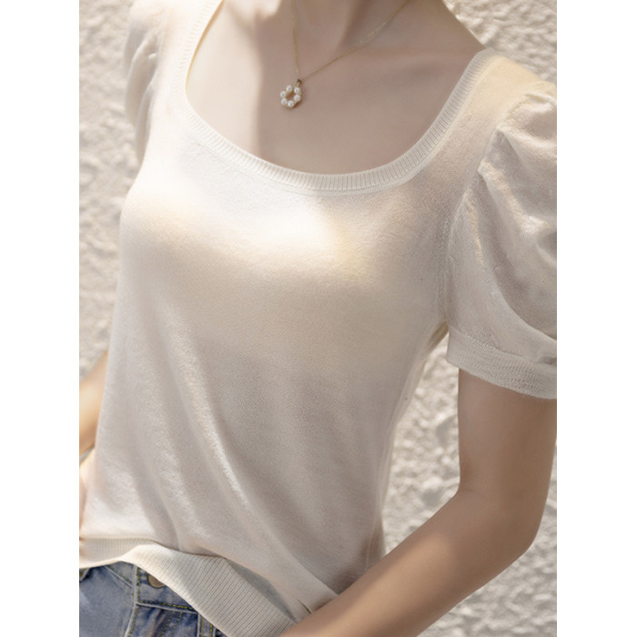 女士打底衫100%羊毛泡泡袖短袖針織衫修身顯瘦方領上衣氣質顯白