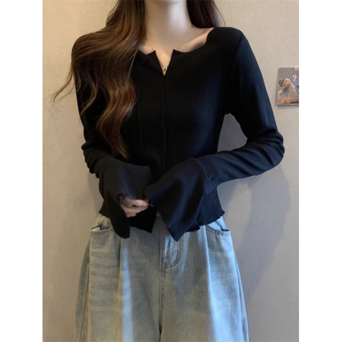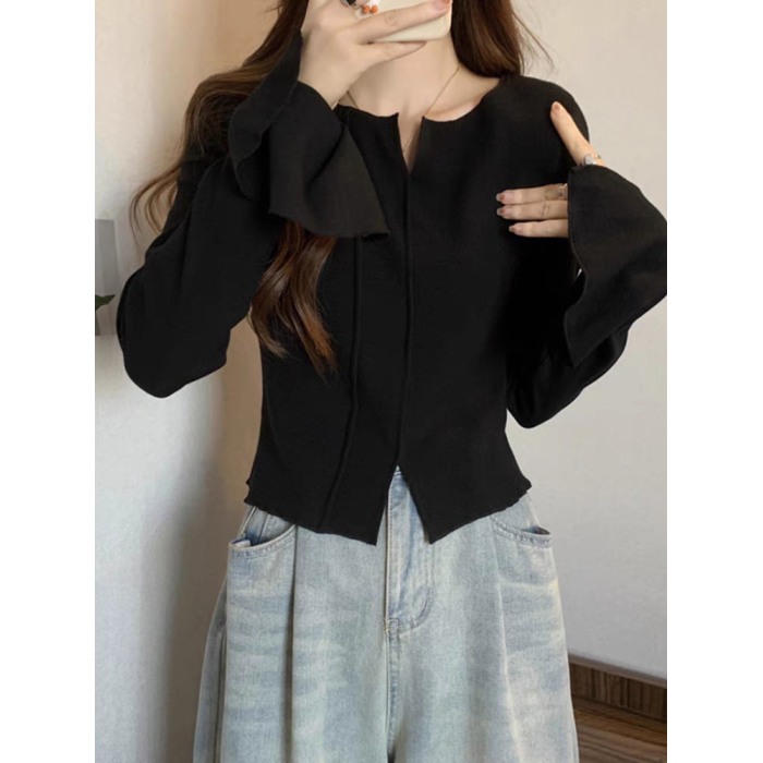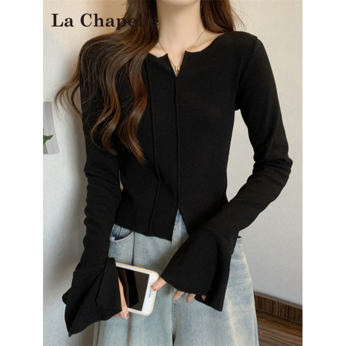 拉夏貝爾黑色喇叭袖針織打底衫女秋季設計感V領氣質百搭短款上衣