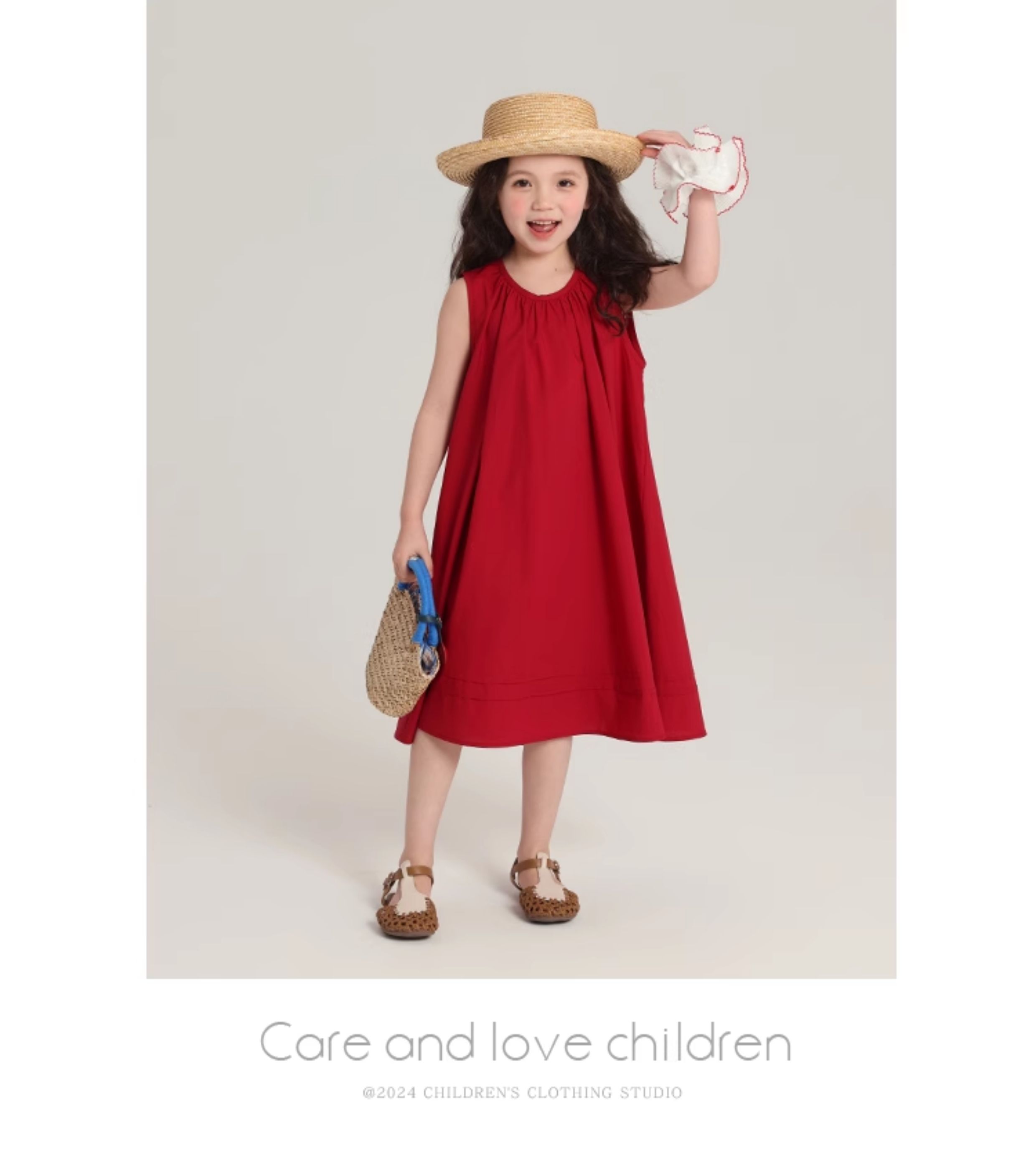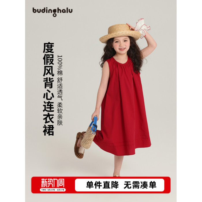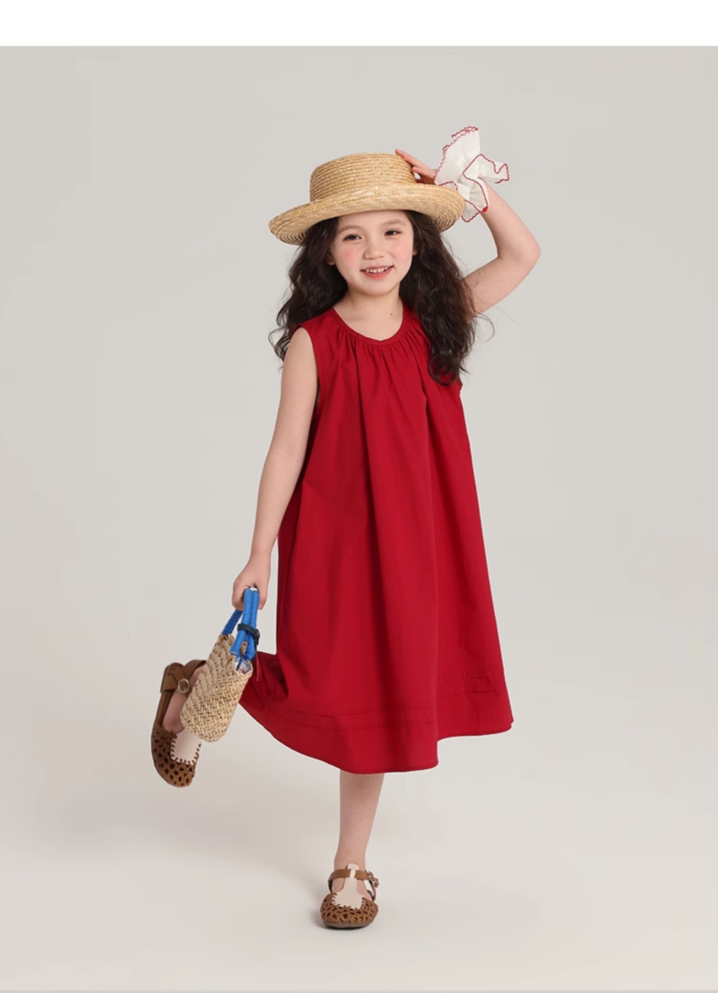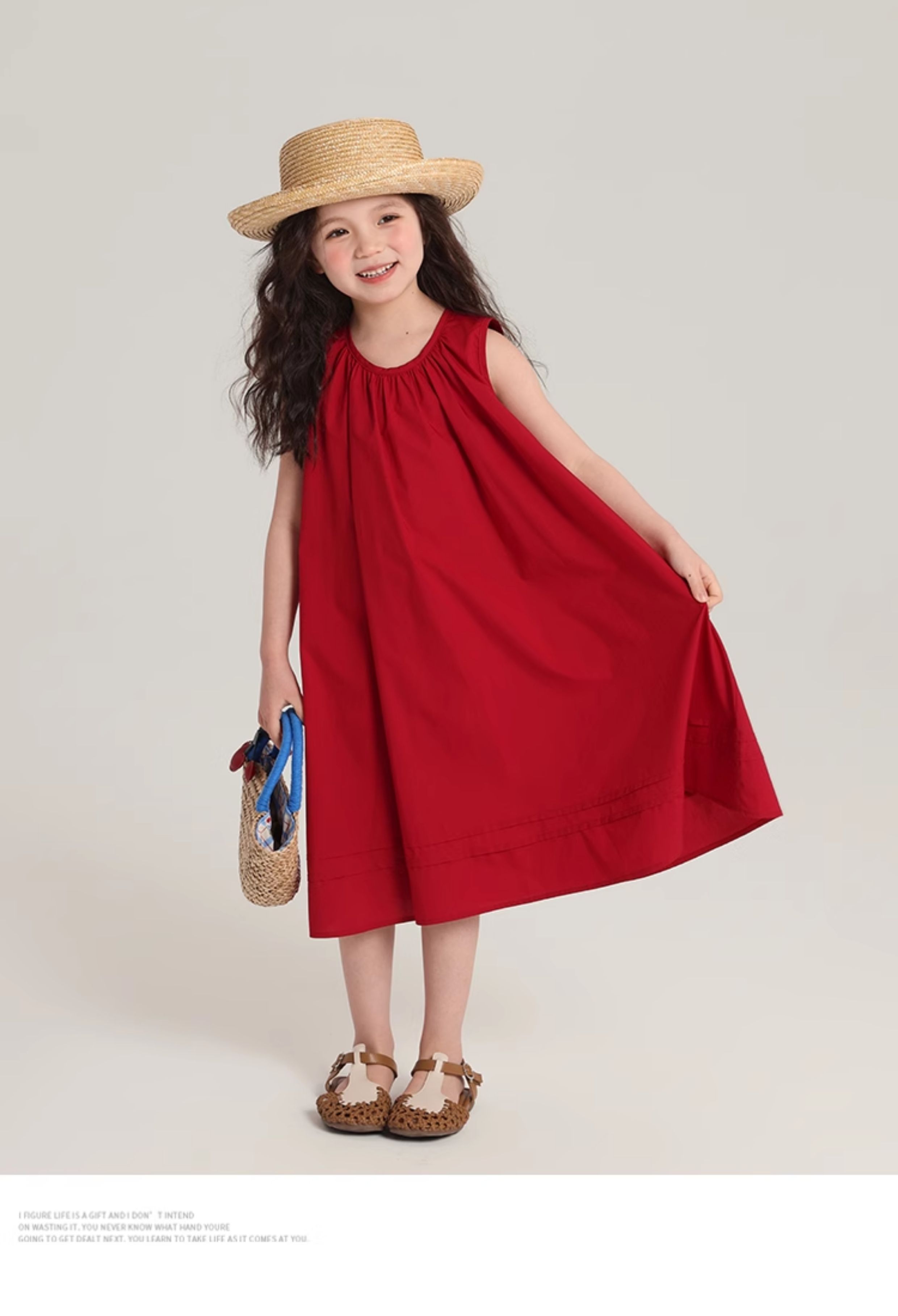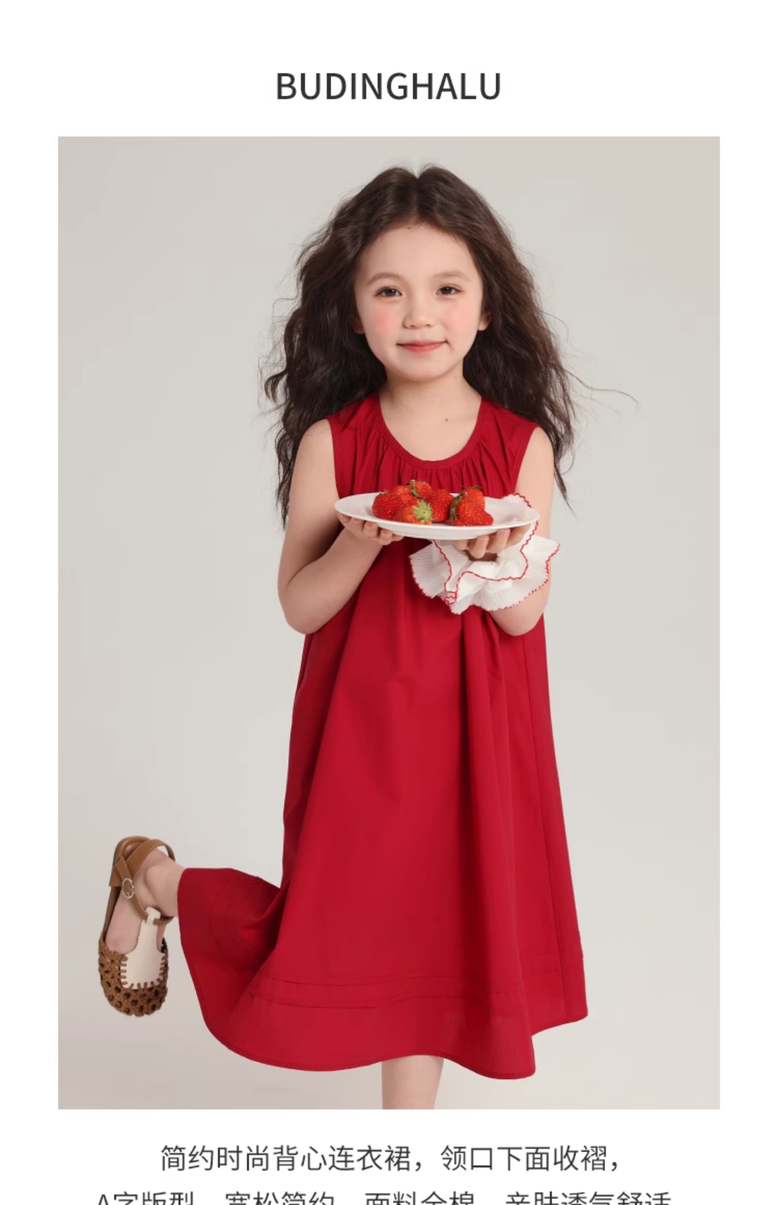 布丁哈魯童裝女童2025夏季新款中大兒童百搭洋氣紅色公主連衣裙子