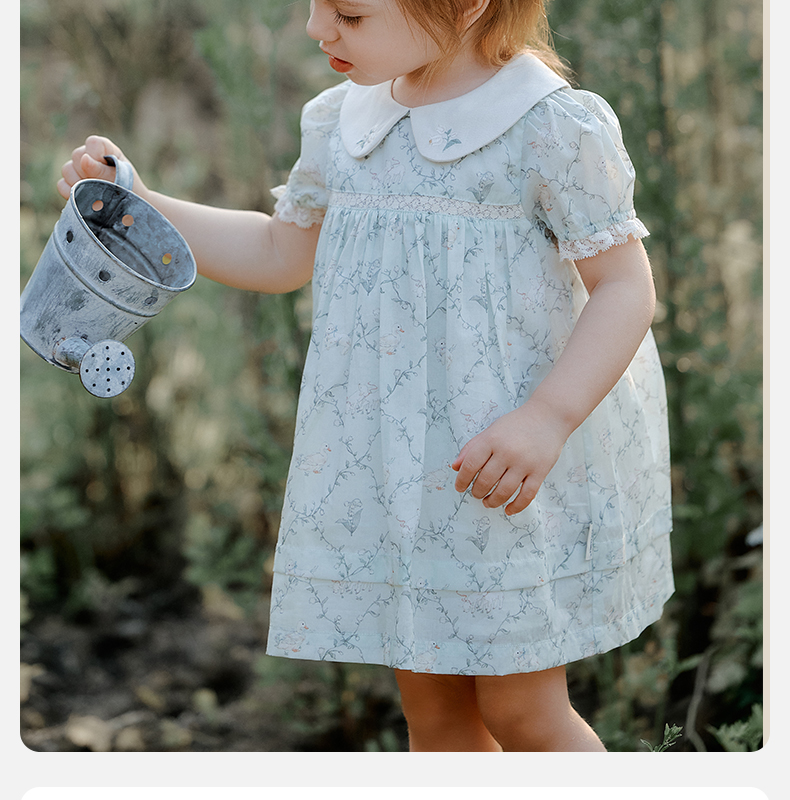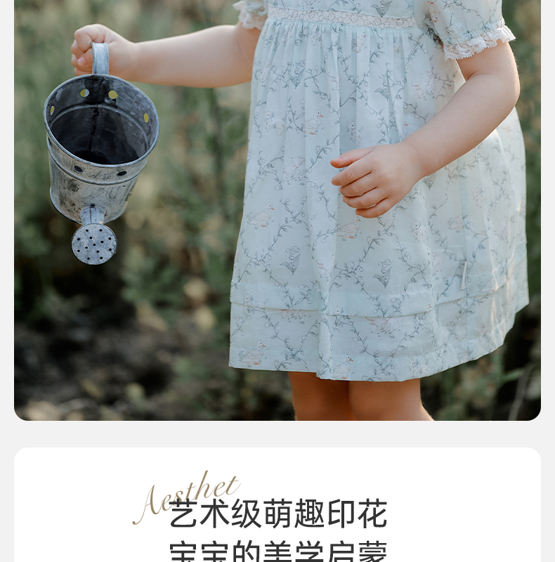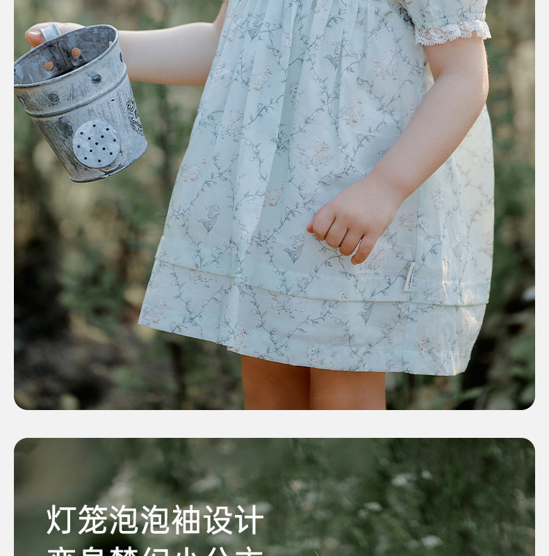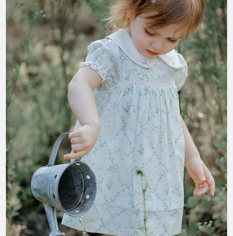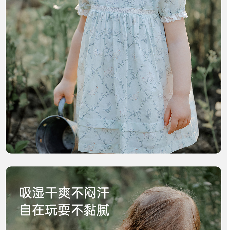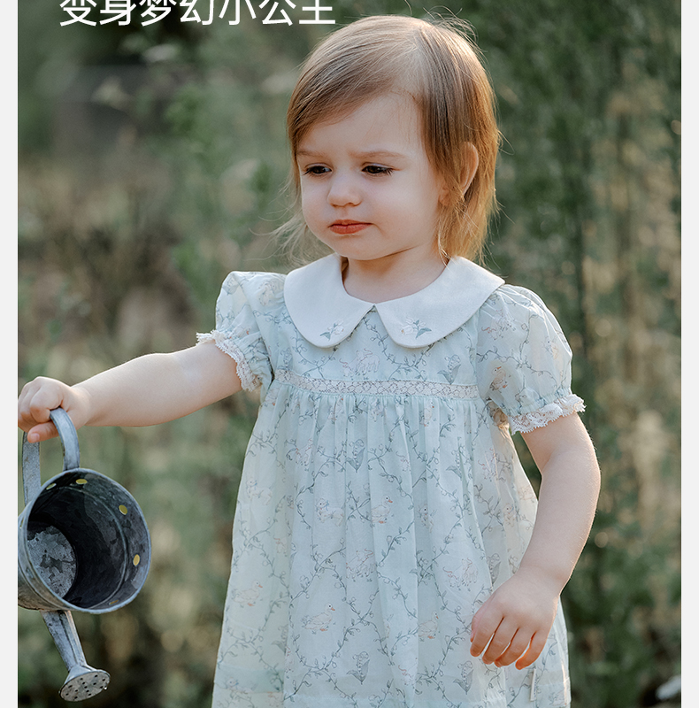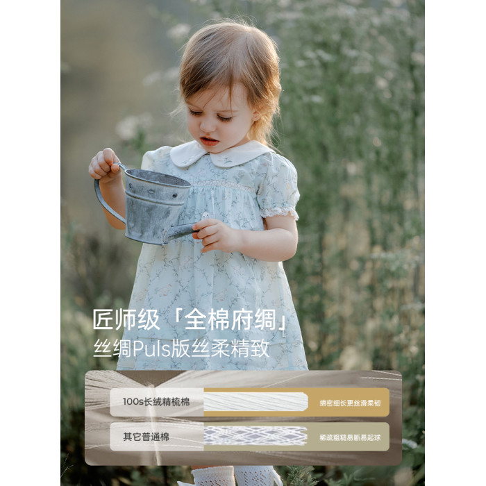 Oak Family夏季新品女童短袖連衣裙法式泡泡袖全棉府綢寶寶裙子