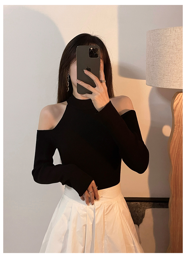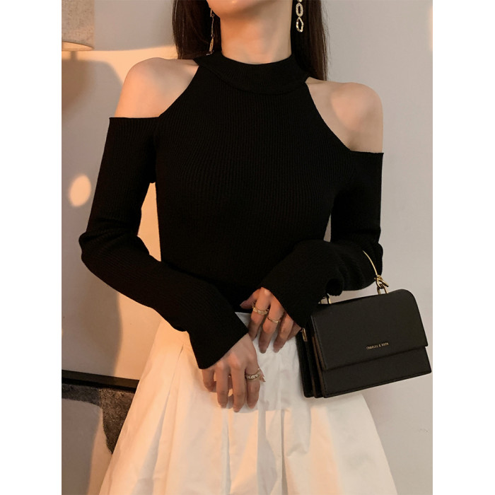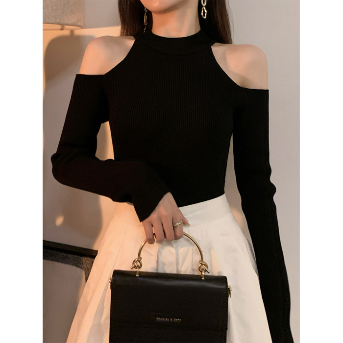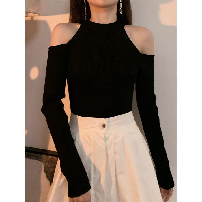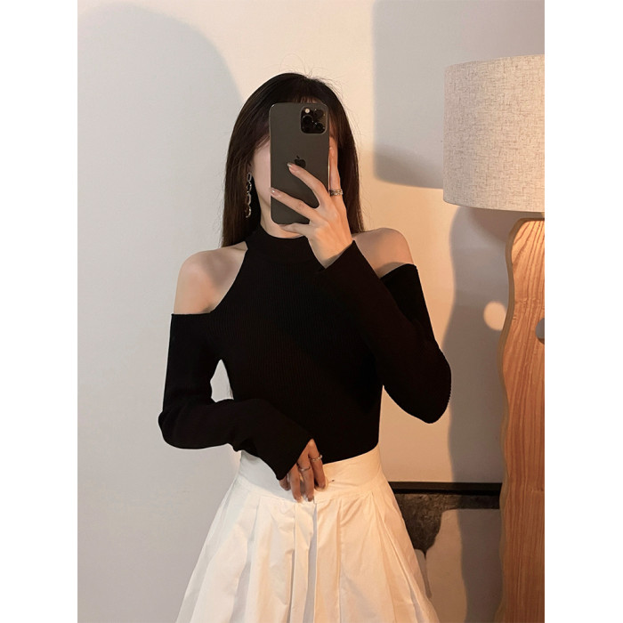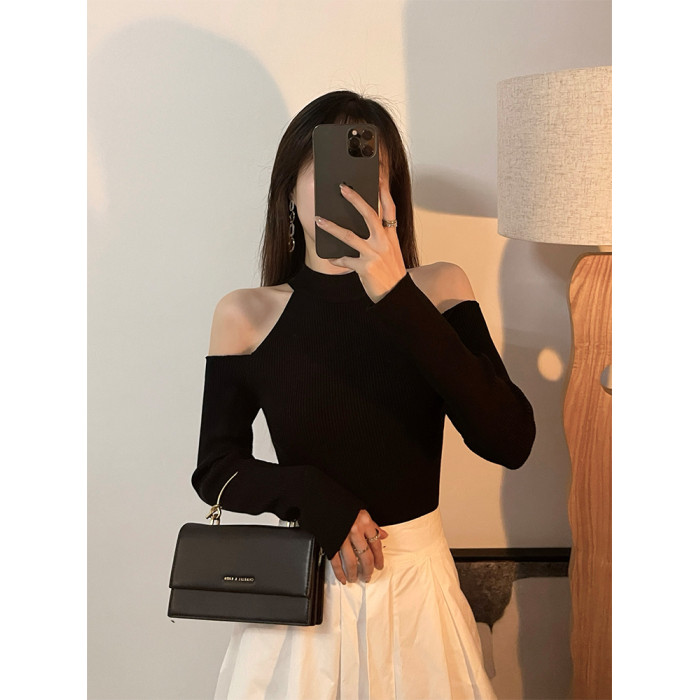 黑色掛脖露肩上衣女百搭辣妹長袖顯瘦打底衫設計感小衆毛衣針織衫