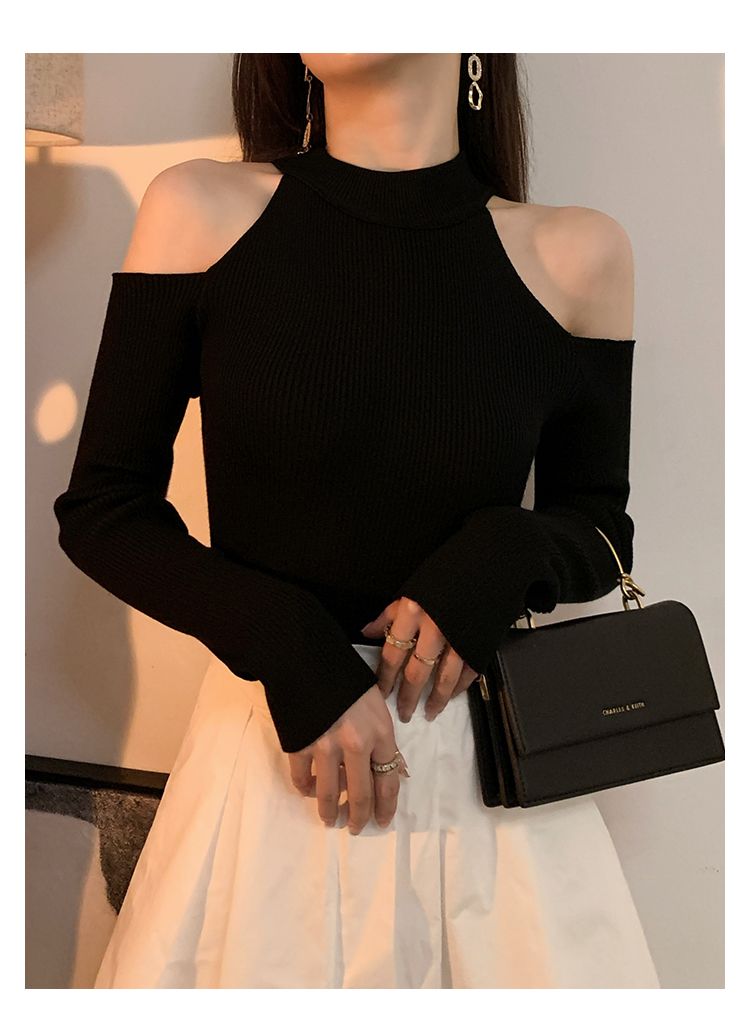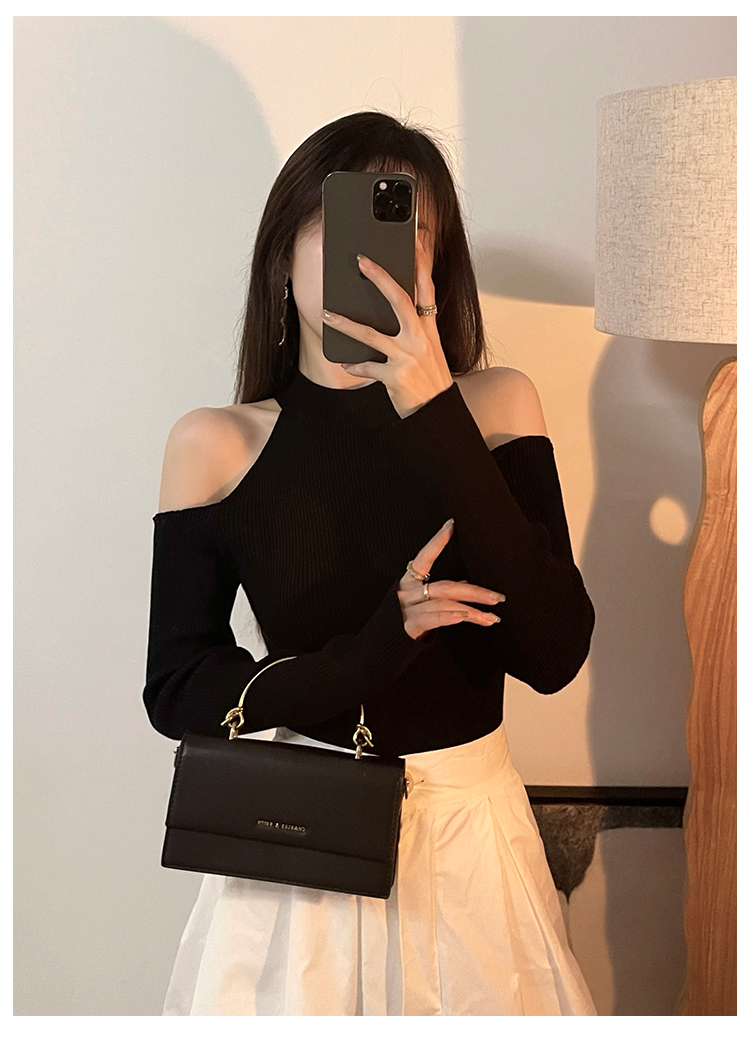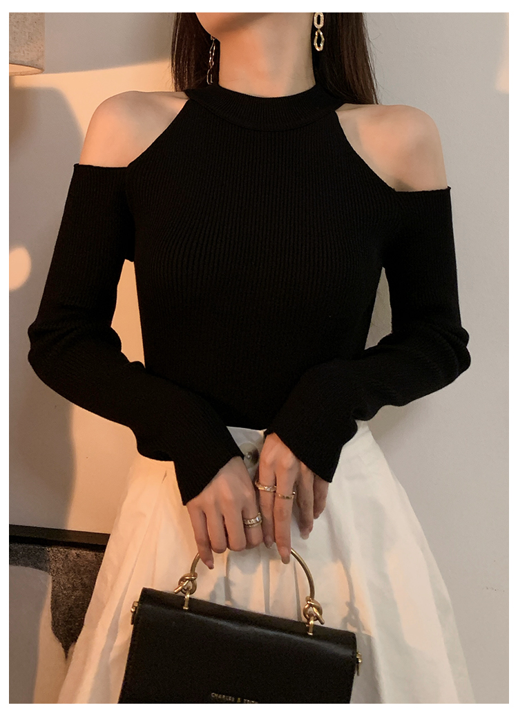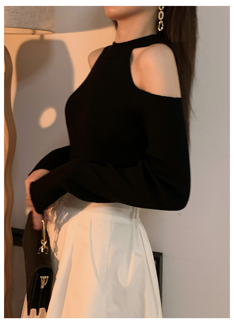 黑色掛脖露肩上衣女百搭辣妹長袖顯瘦打底衫設計感小衆毛衣針織衫
