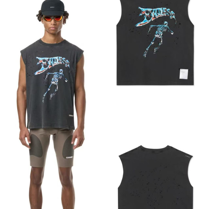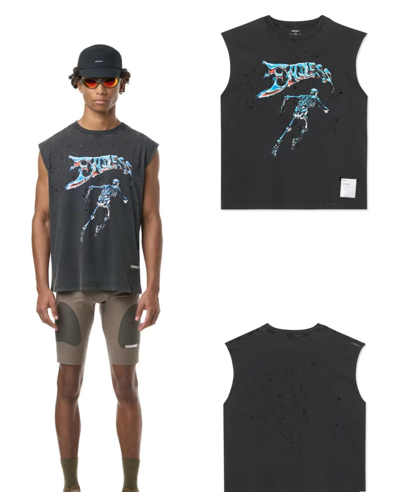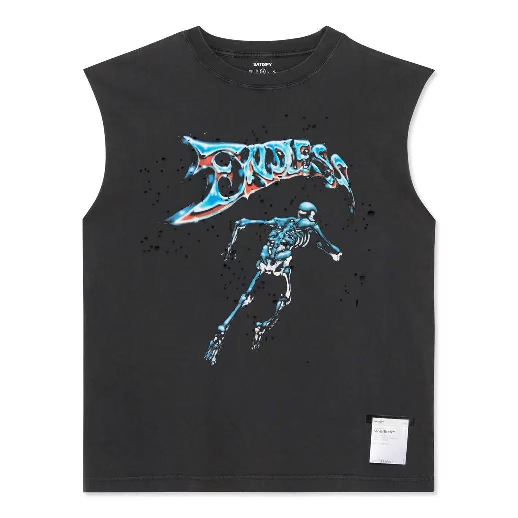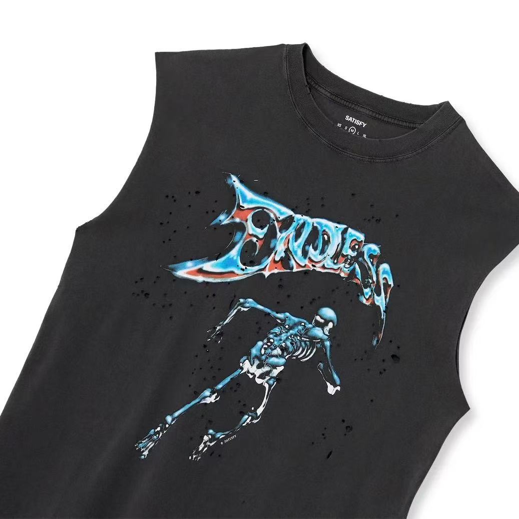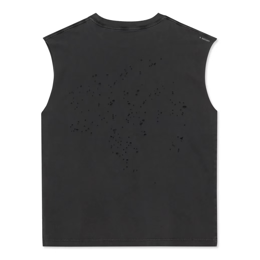 高街小衆美式潮牌SATISFY印花噴墨破洞做舊背心