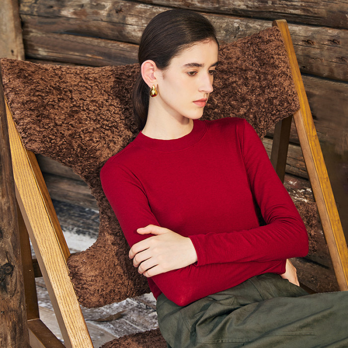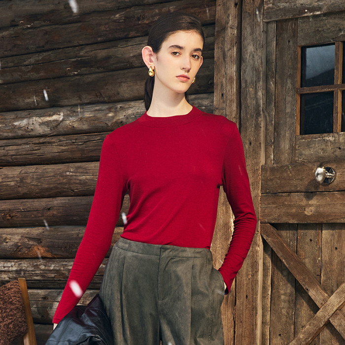 高克重可機洗100%精紡超細羊毛針織衫上衣女修身顯瘦圓領紅色毛衣