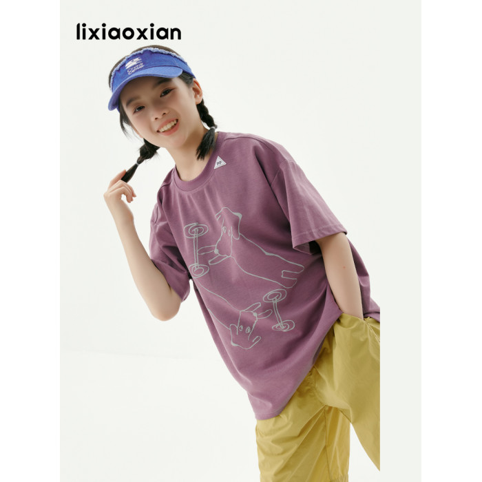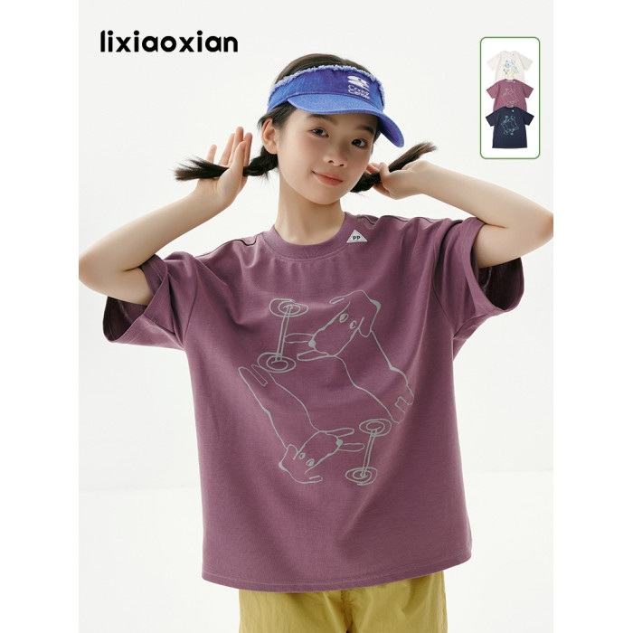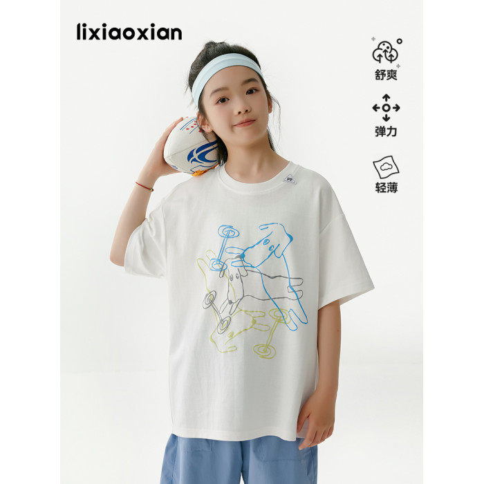 梨小閒女童【清透雅紗棉】夏短袖T恤兒童中大童線條印花休閒體恤