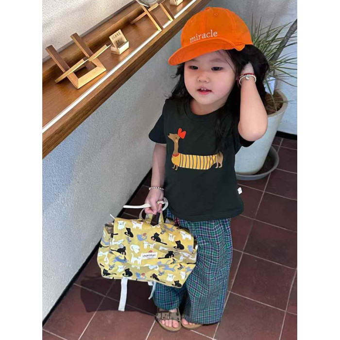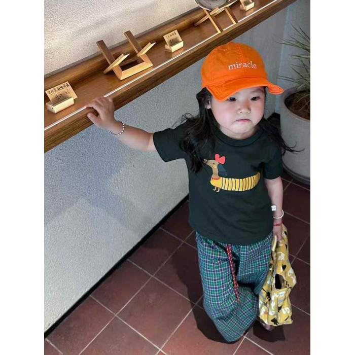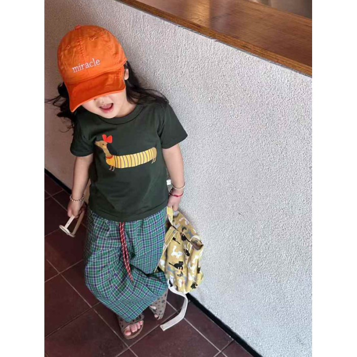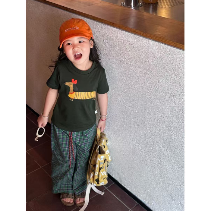 童裝女童短袖2025新款t恤夏純棉男童兒童休閒墨綠色印花上衣