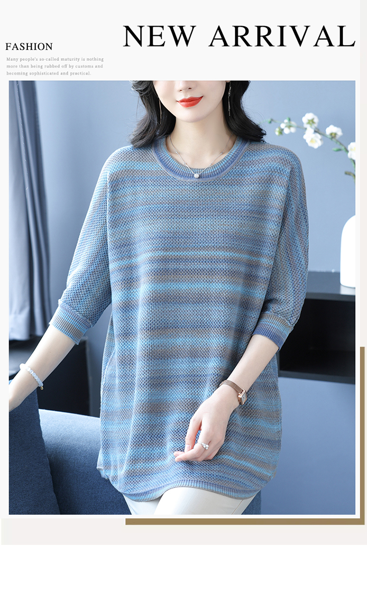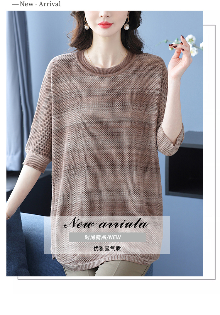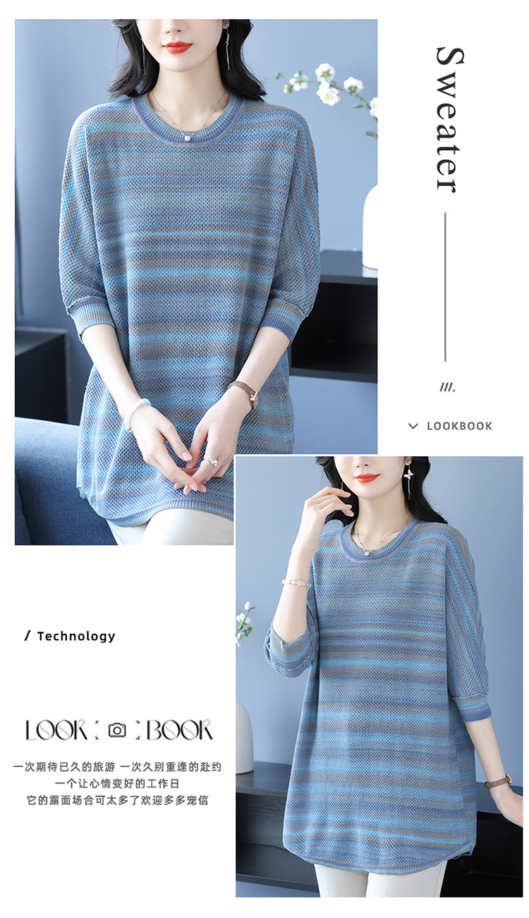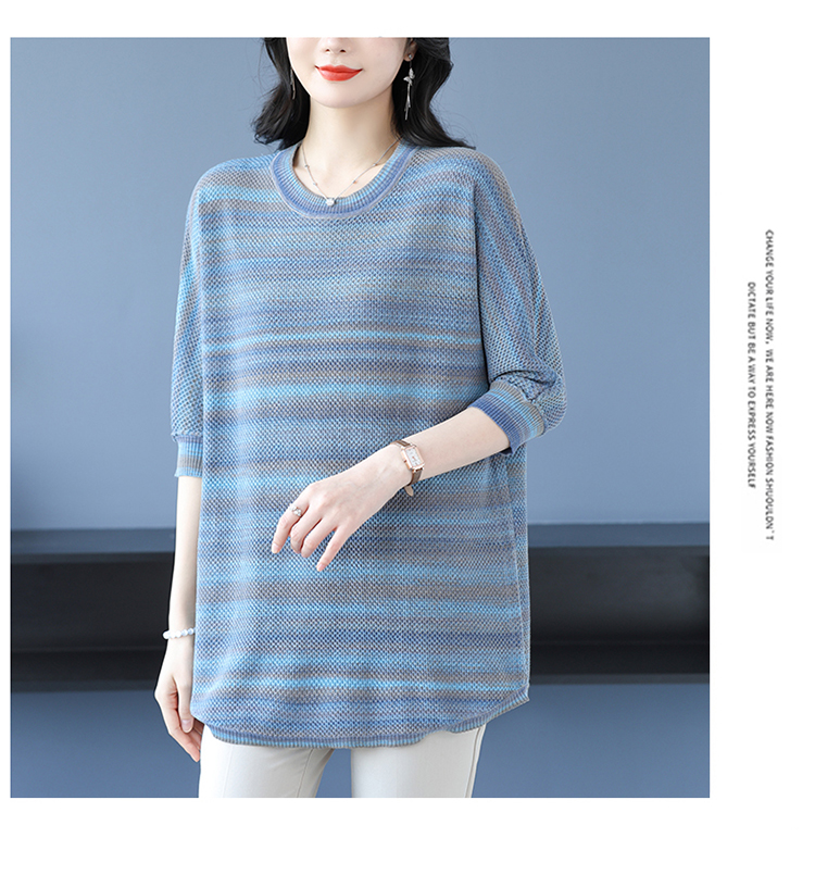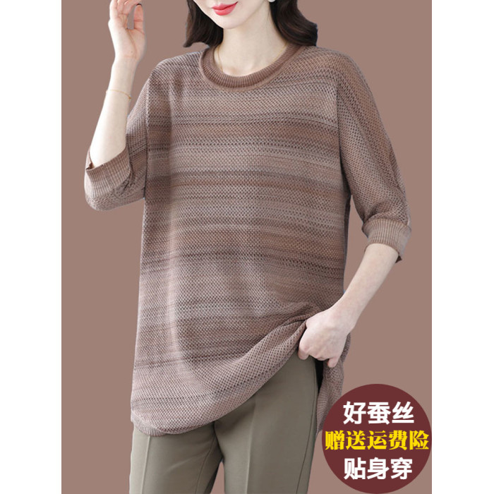 媽媽春裝洋氣冰絲條紋打底衫寬松加大碼遮肚子中長款桑蠶絲針織衫