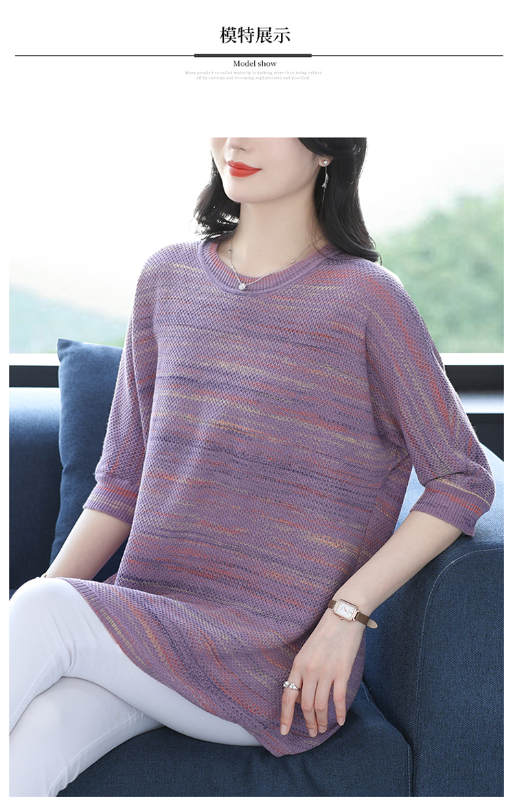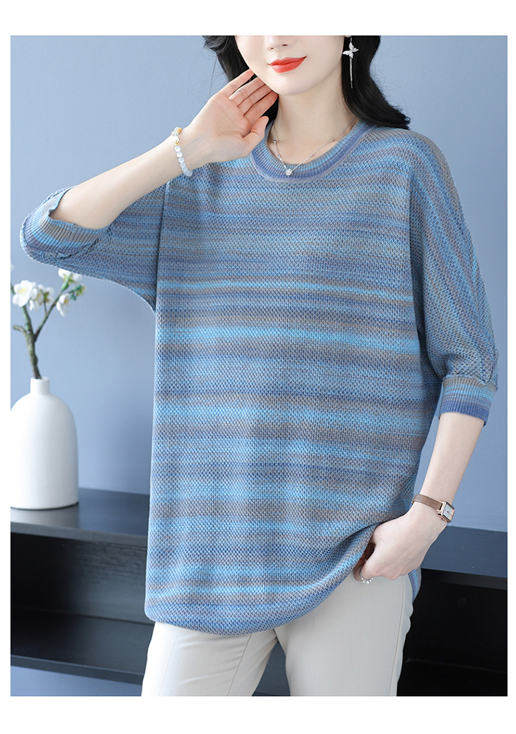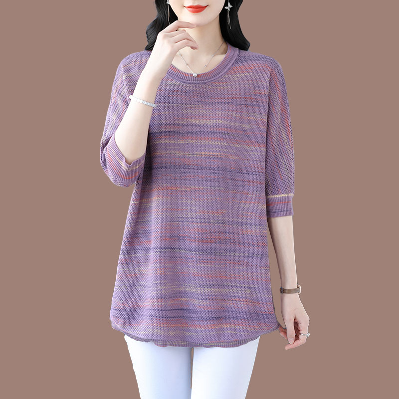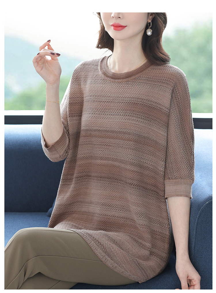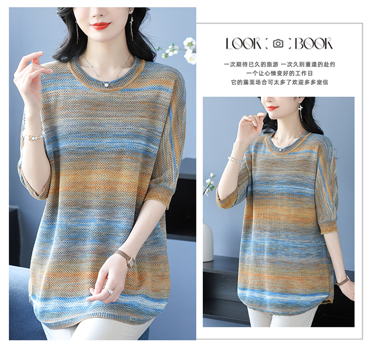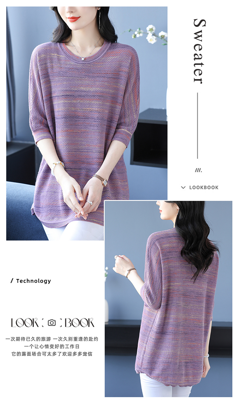 媽媽春裝洋氣冰絲條紋打底衫寬松加大碼遮肚子中長款桑蠶絲針織衫