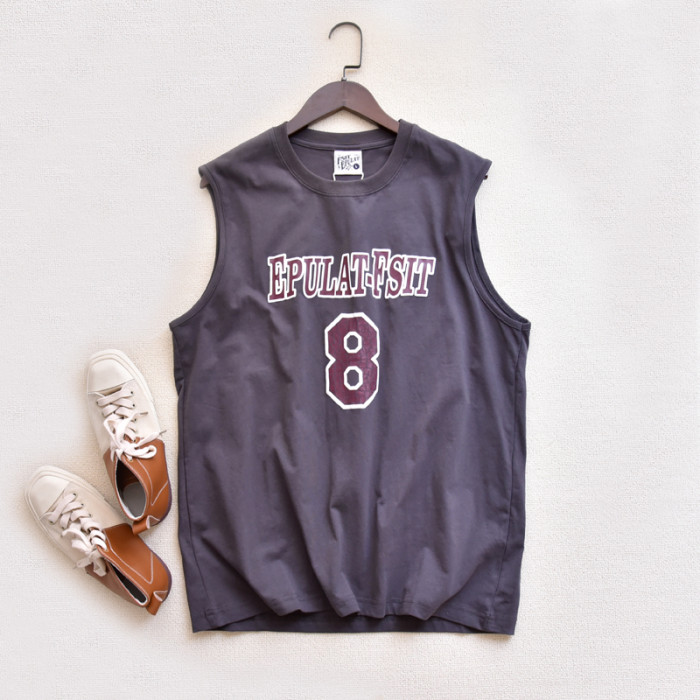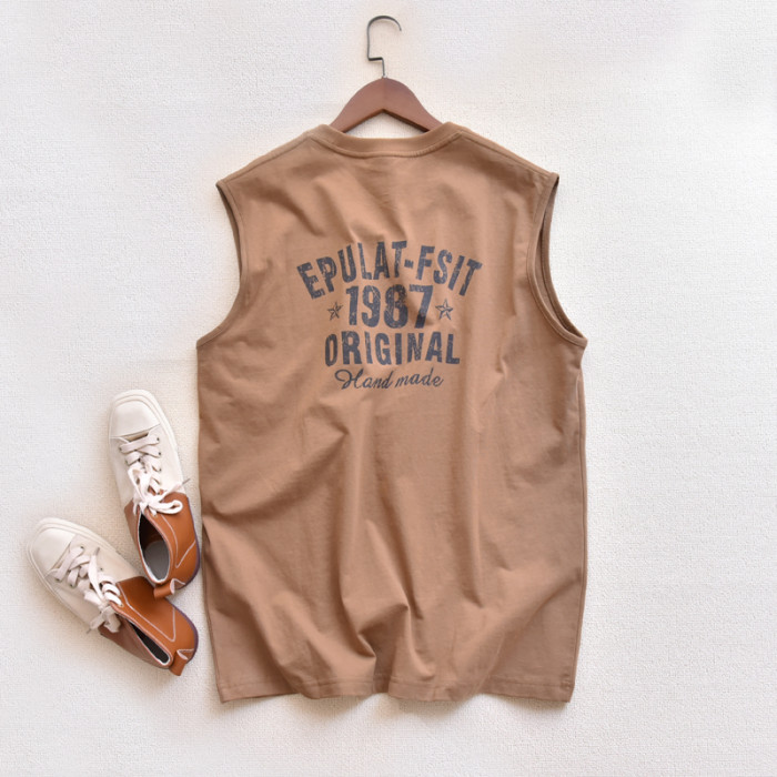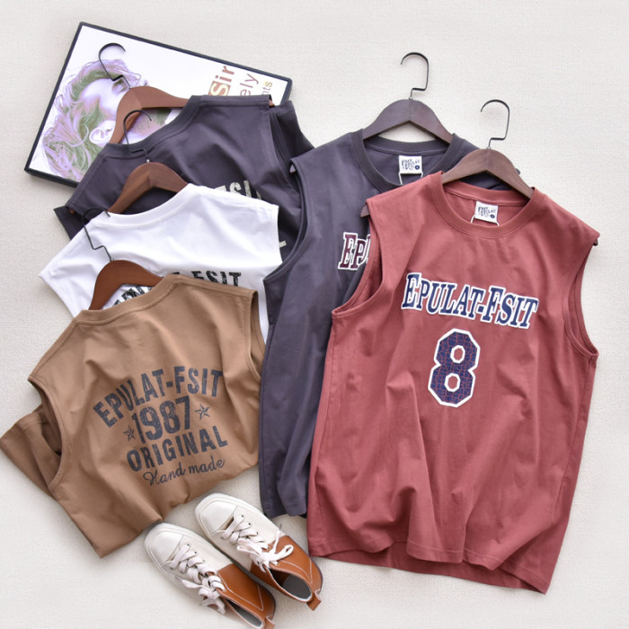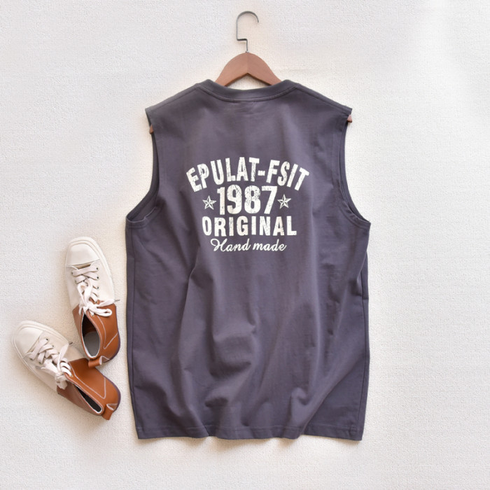 美式復古 後背印花純棉背心男無袖寬肩t恤 夏季寬松運動籃坎肩