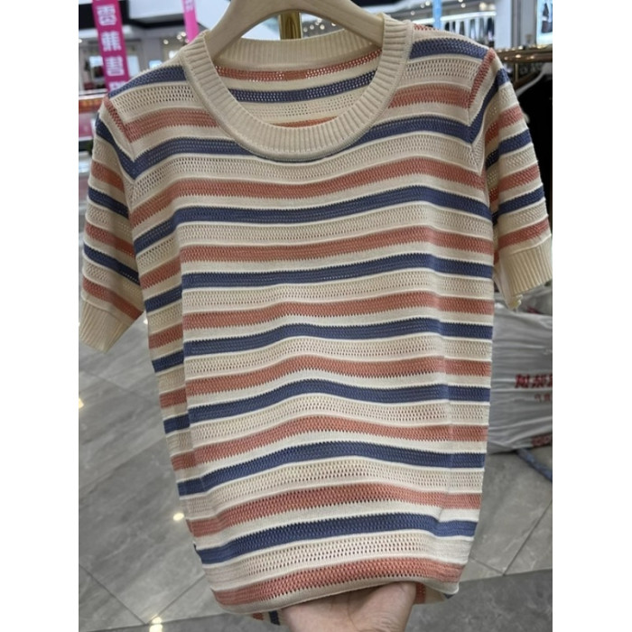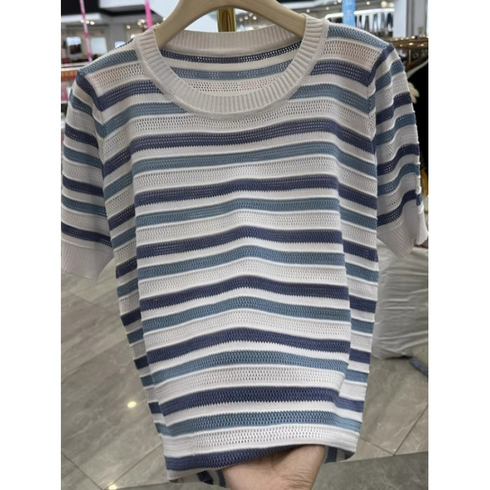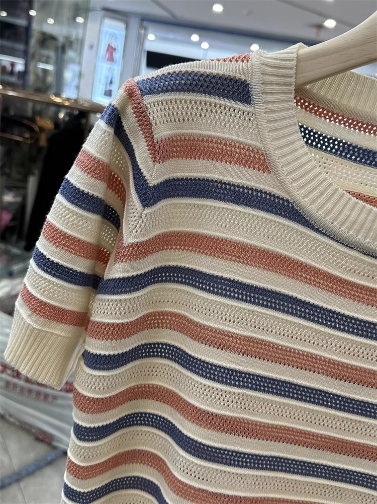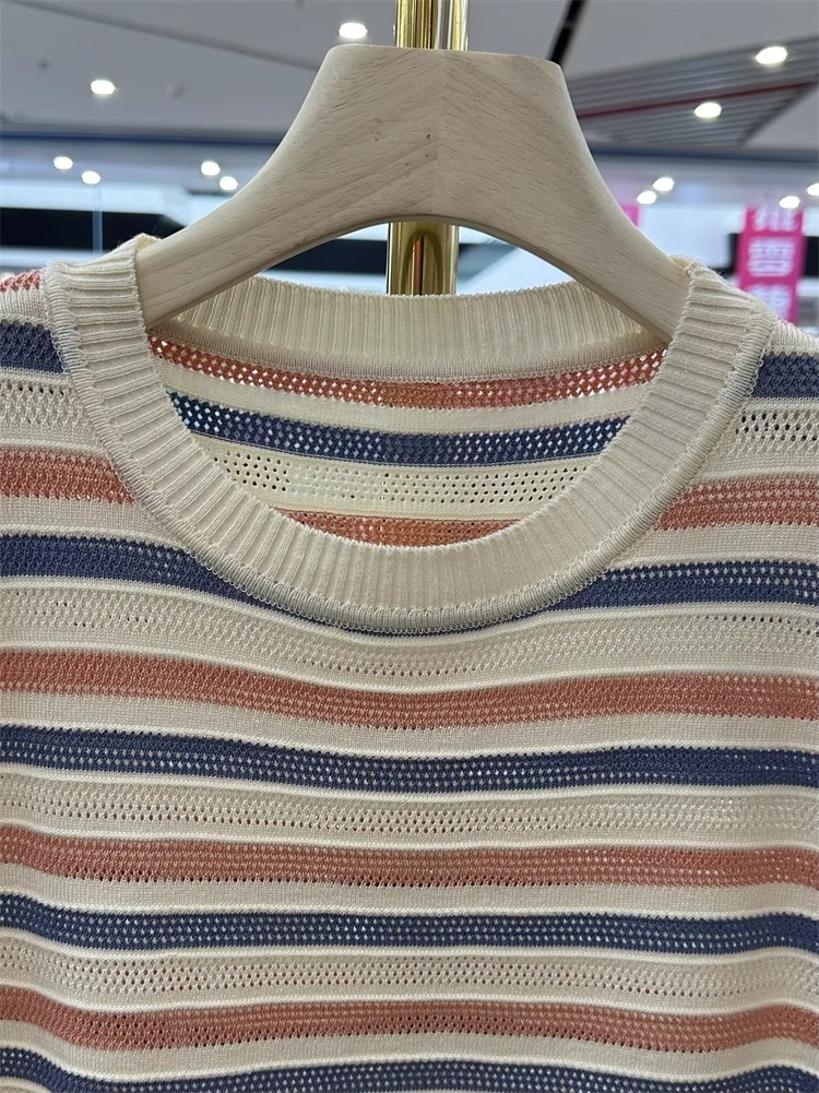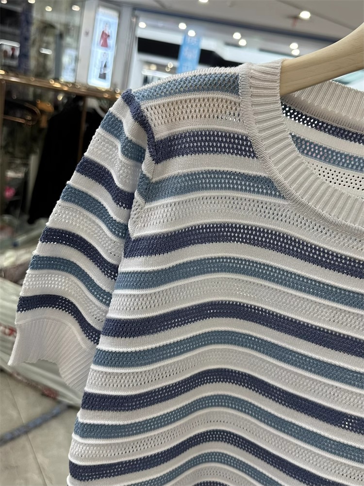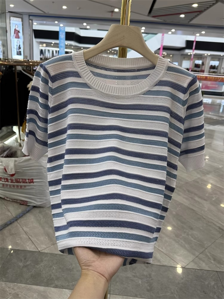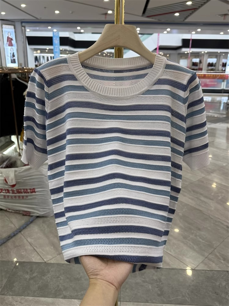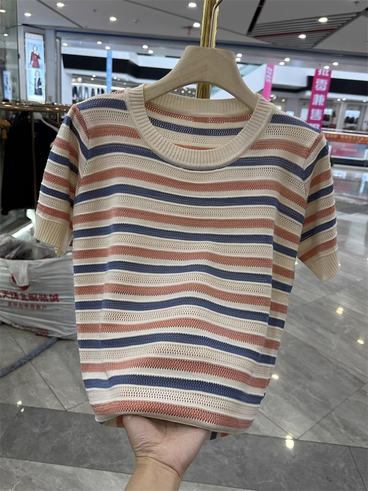冰絲條紋針織衫女夏裝打底衫2025年新款寬松顯瘦鏤空透氣短袖上衣