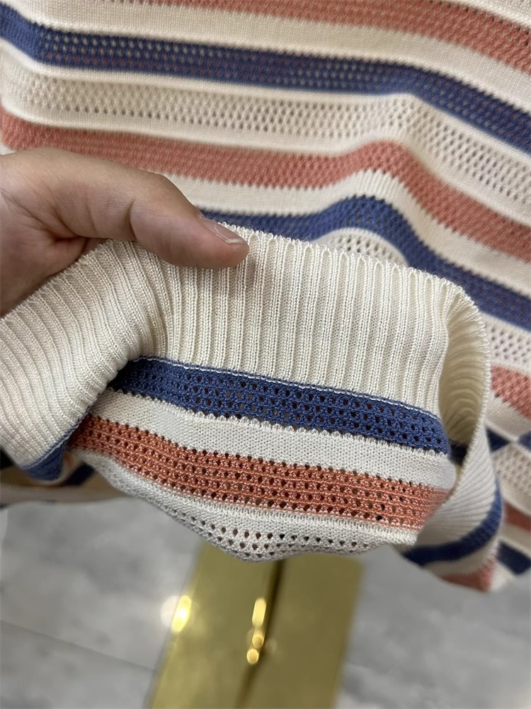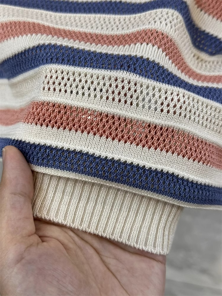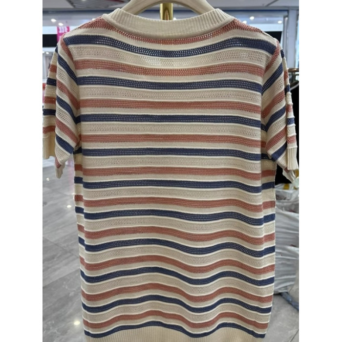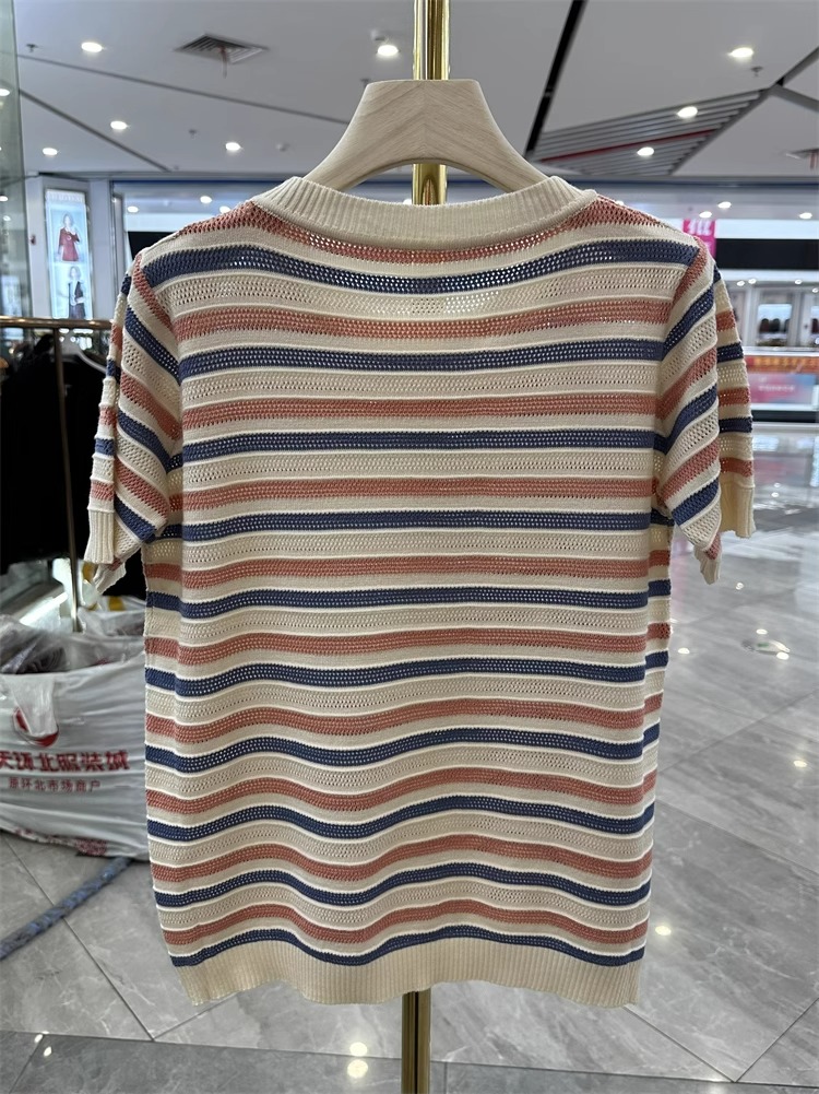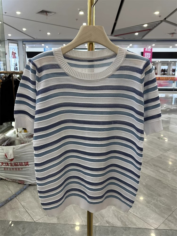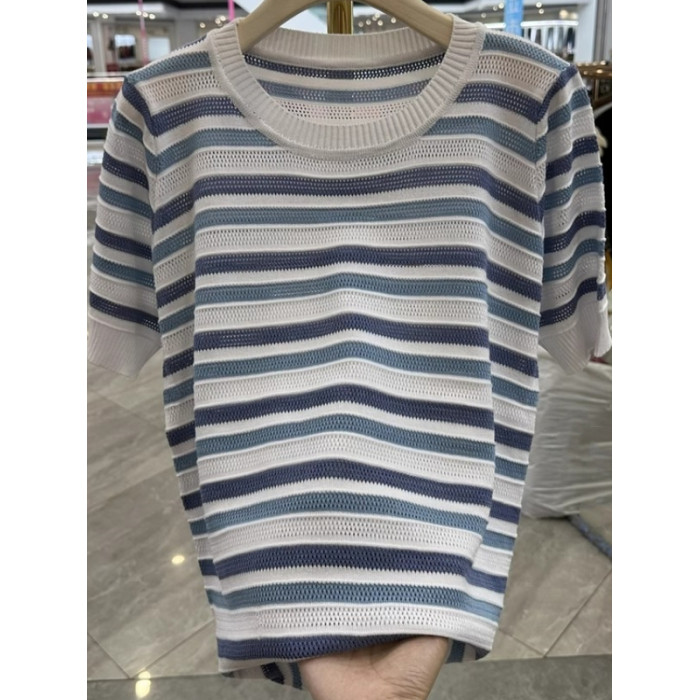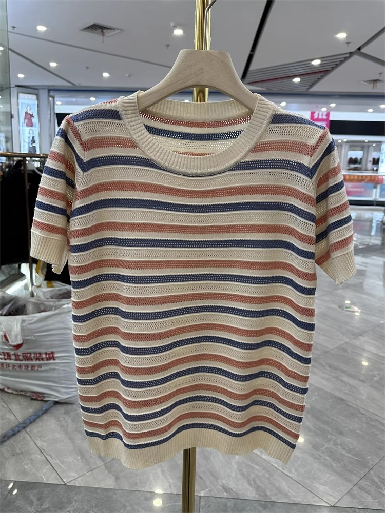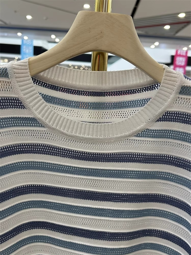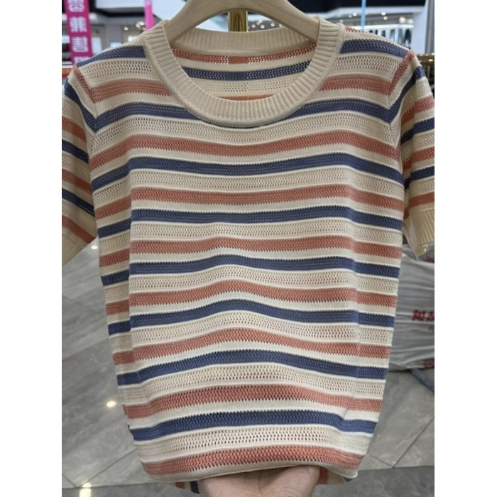 冰絲條紋針織衫女夏裝打底衫2025年新款寬松顯瘦鏤空透氣短袖上衣