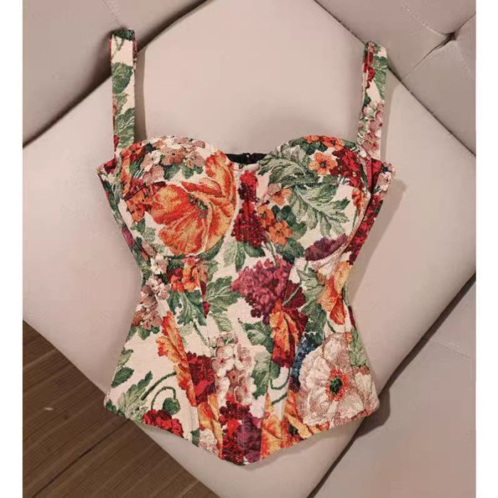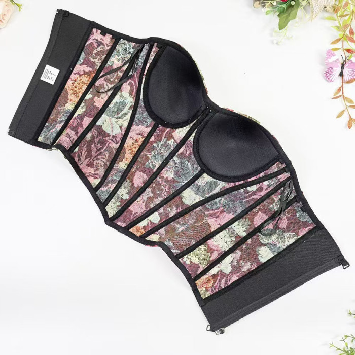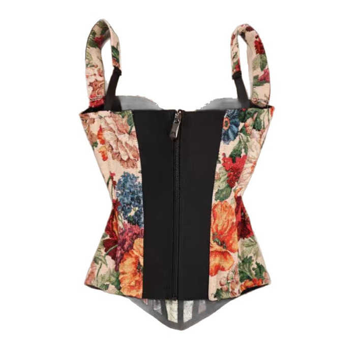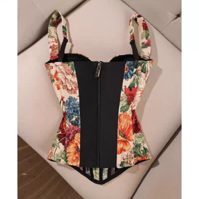 街頭復古花朵印花莫奈油畫復古魚骨小背心緊身聚攏塑身禮服胸衣女