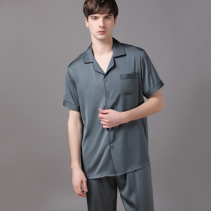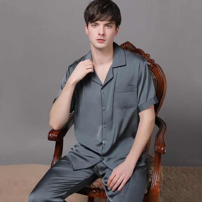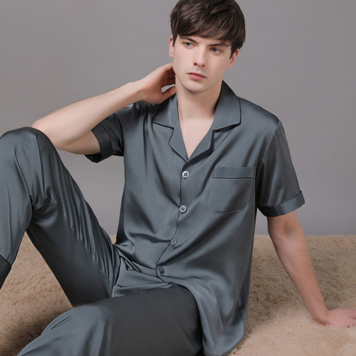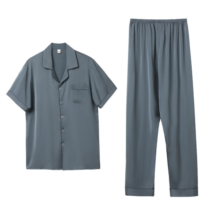 睡衣男2024新款短袖長褲春夏男士睡衣冰絲綢家居服純色