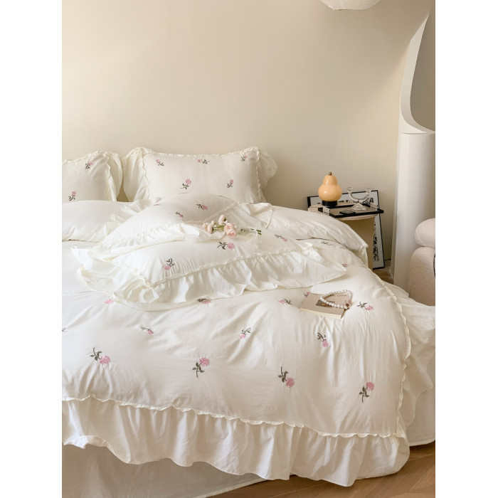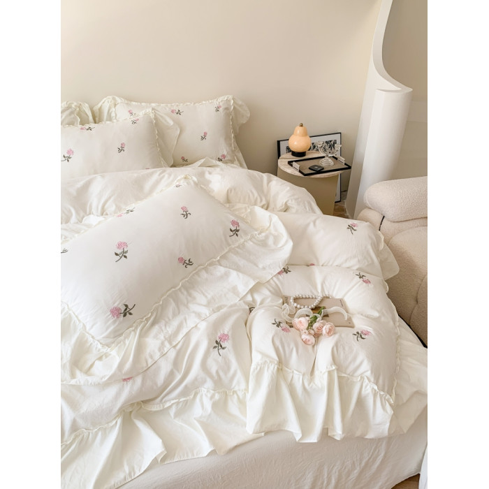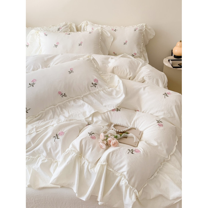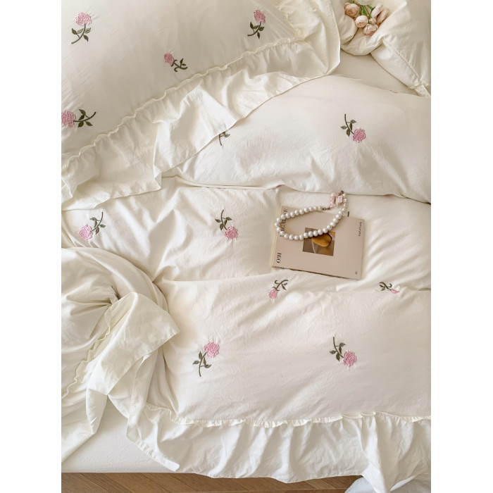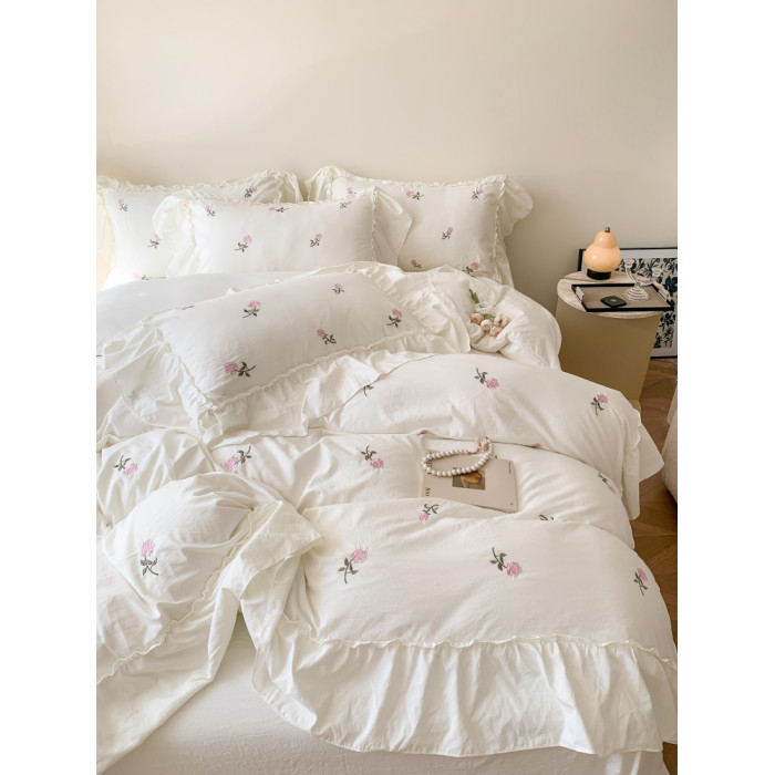 純欲仙女法式刺綉粉玫瑰花邊被套床單四件套柔軟水洗棉被單三件套