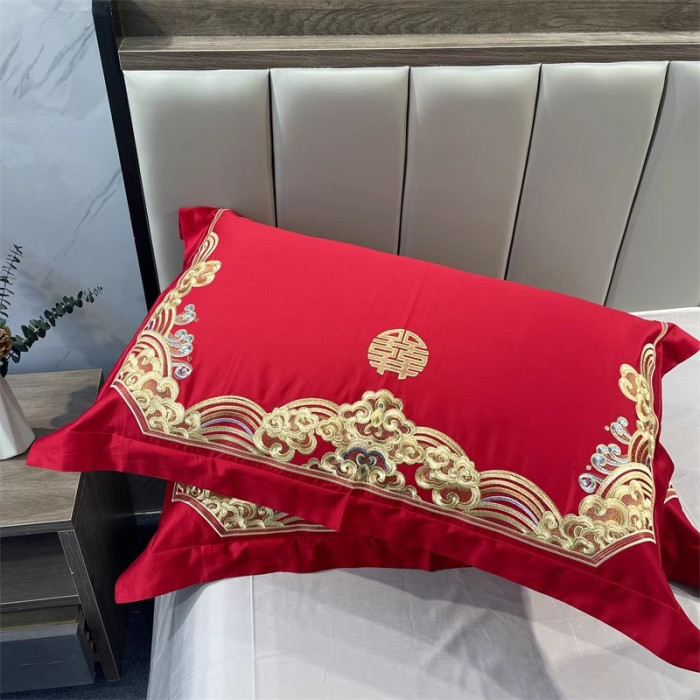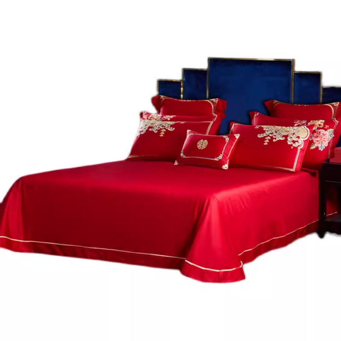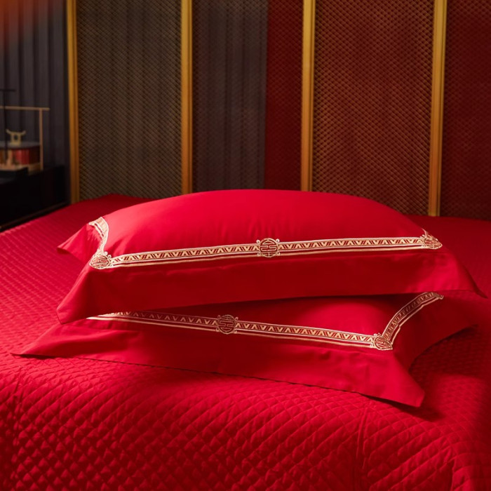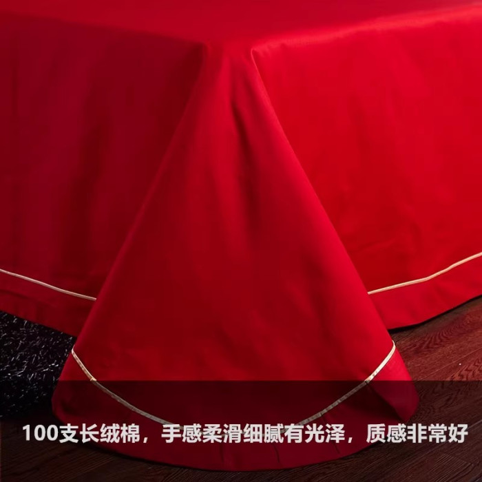 100支床單+枕套三件套高檔純棉長絨棉刺綉枕套大紅結婚床品婚慶