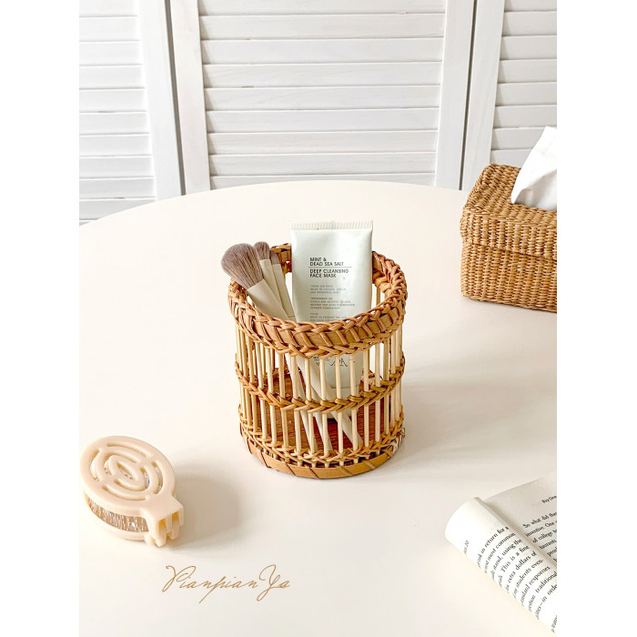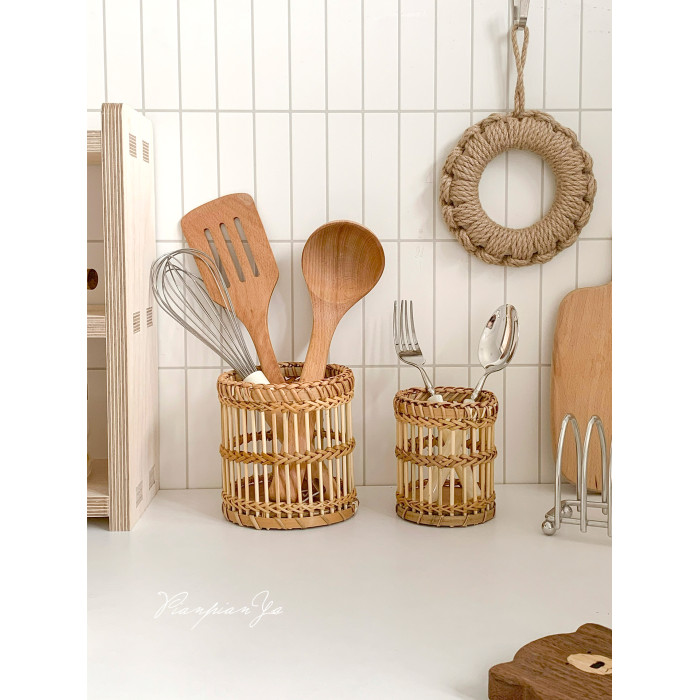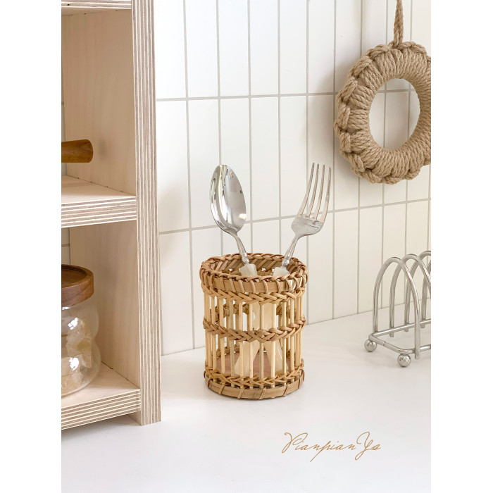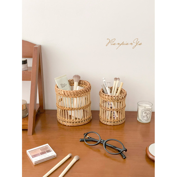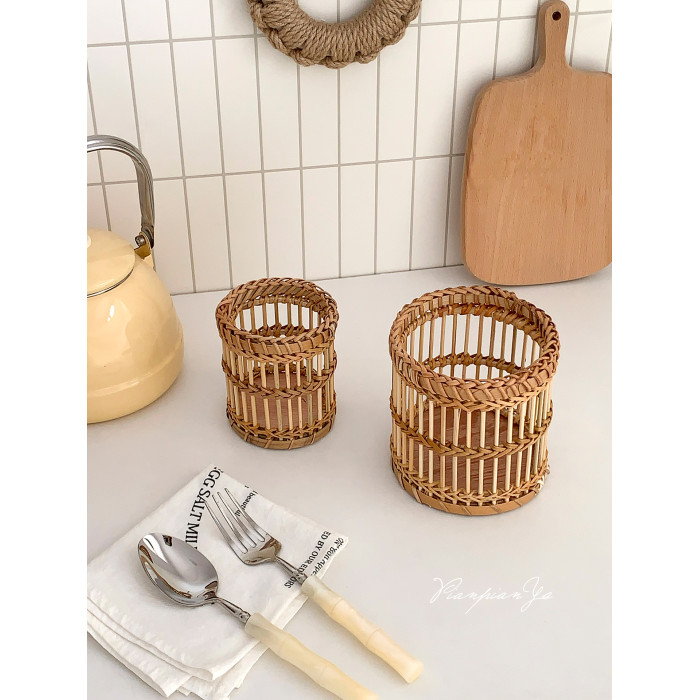 竹編復古木質編織筆筒桌面文具梳子化妝收納廚房工具收納筒擺件