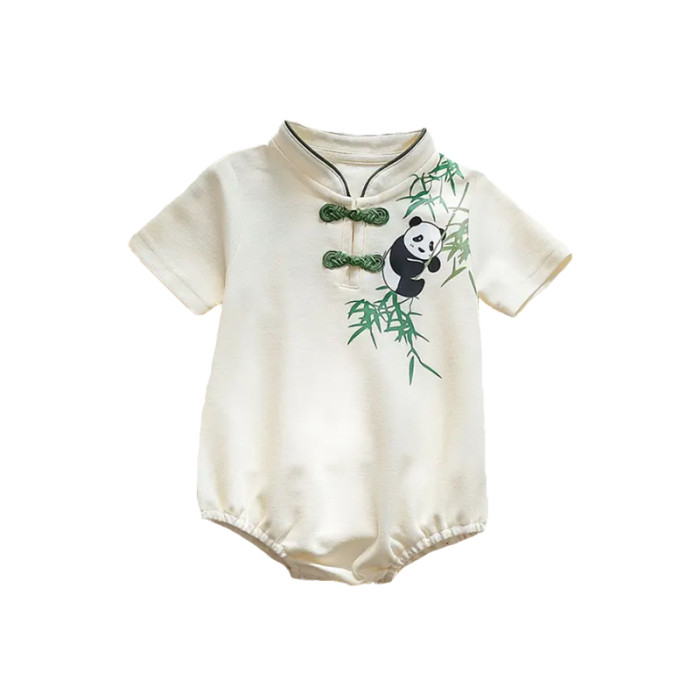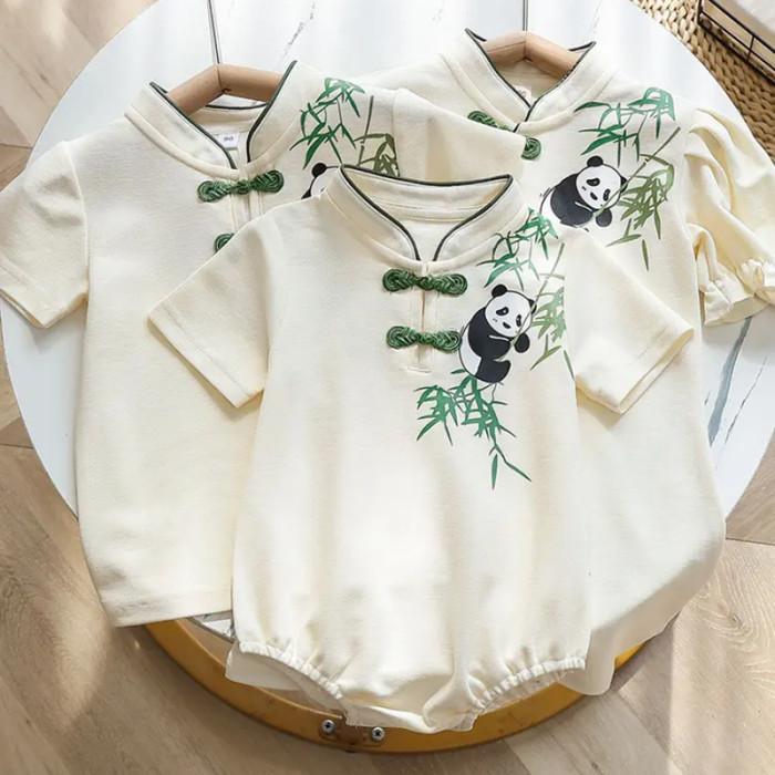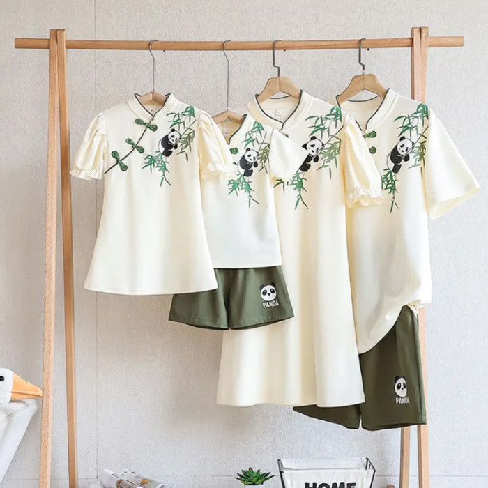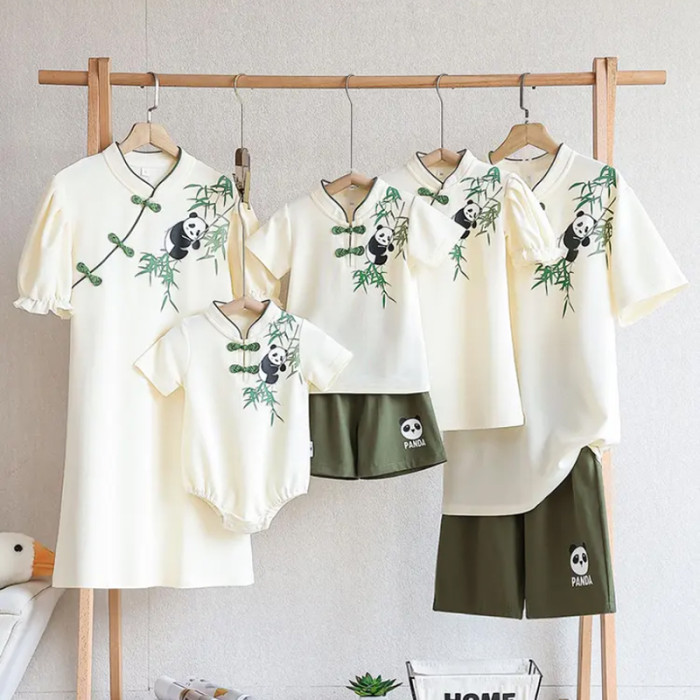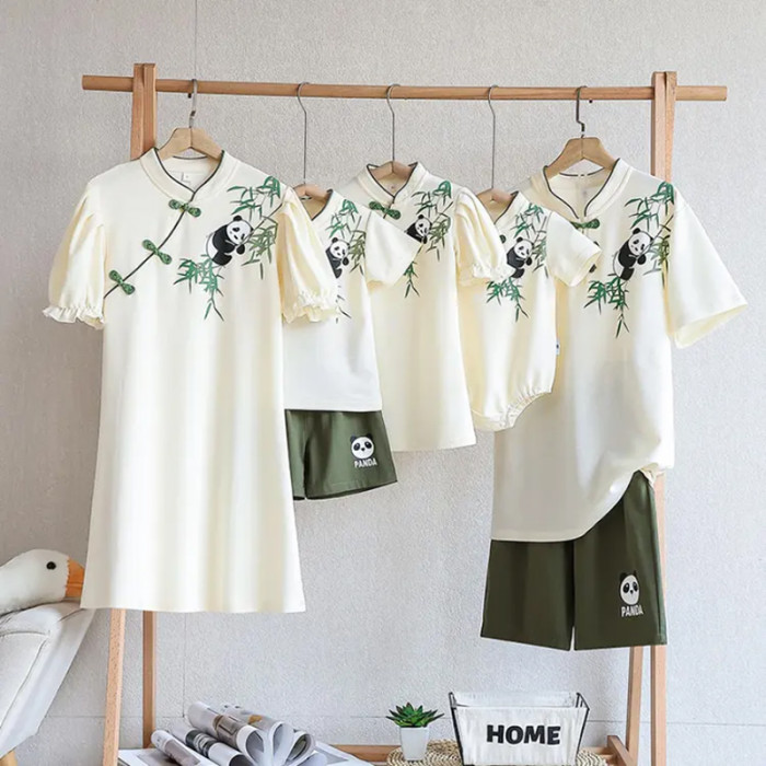 國風中式親子裝一家三口夏天嬰兒周嵗拍照熊貓polo衫連衣裙母女裝