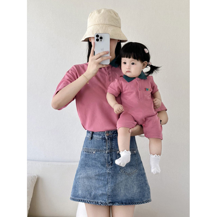 親子裝一家三口百天周嵗宴小月齡連體衣高級感母女母子全家裝短袖