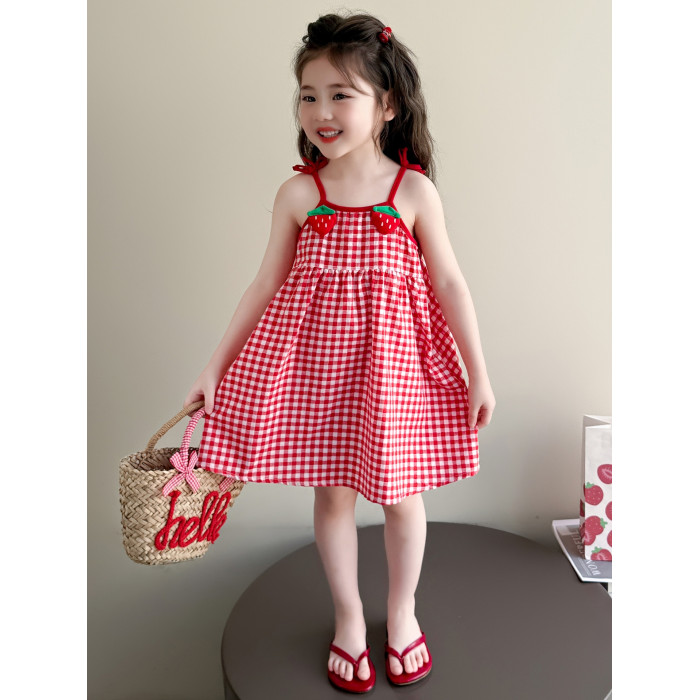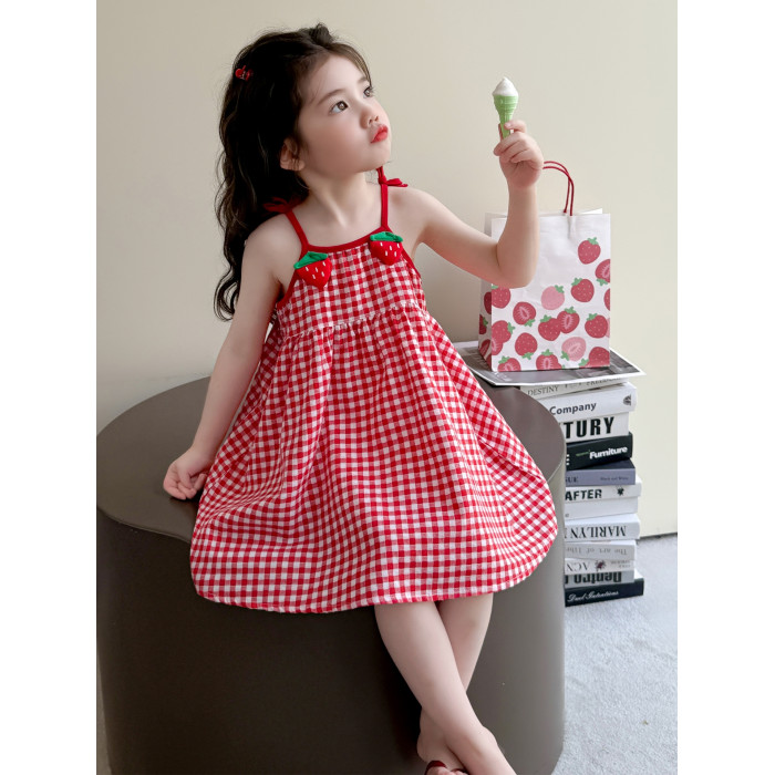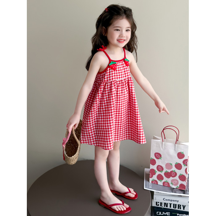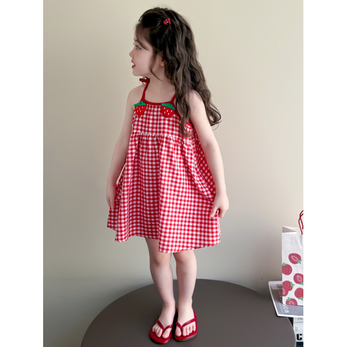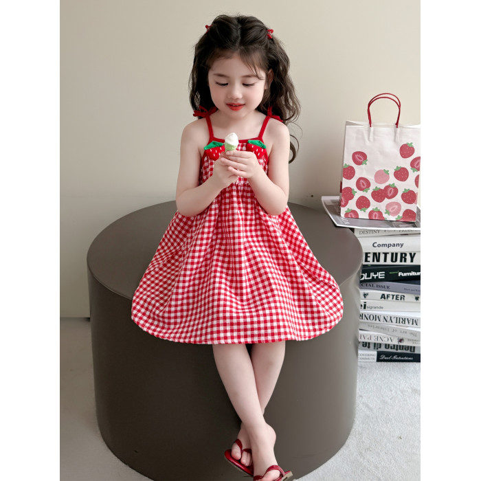 女童甜美可愛紅色草莓格子吊帶裙夏季涼快背心裙子兒童連衣裙薄款