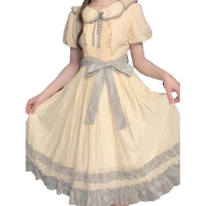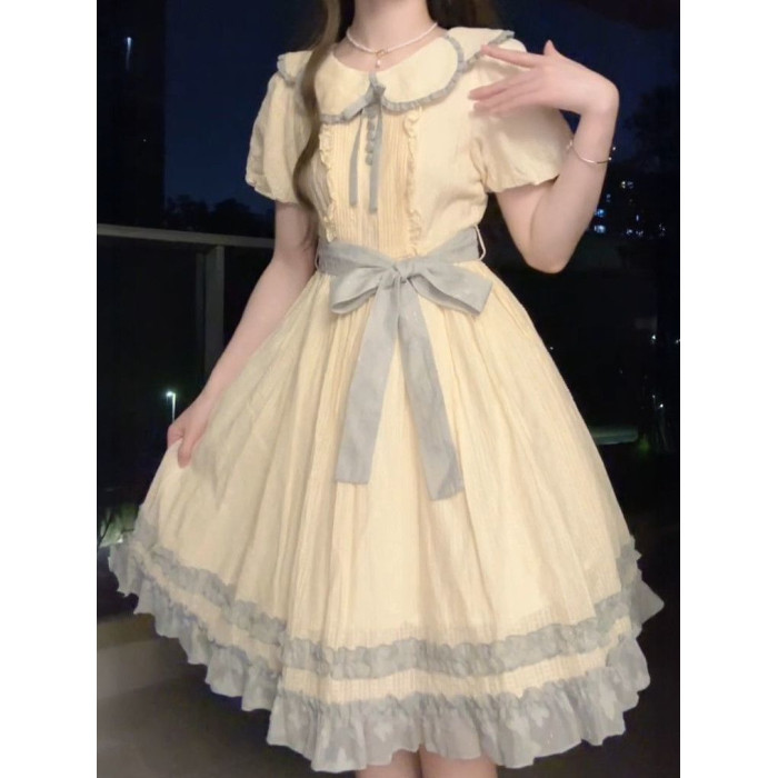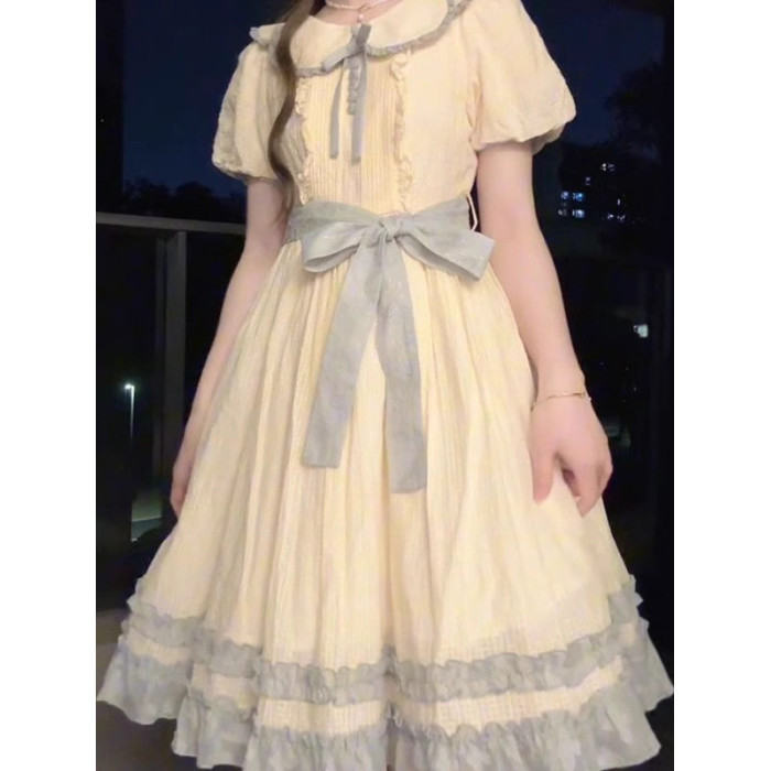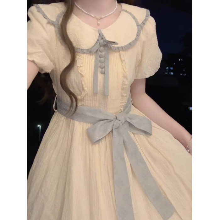 女童韓版花邊蓬蓬裙中大童夏季新款蝴蝶結甜美田園風休閒風連衣裙