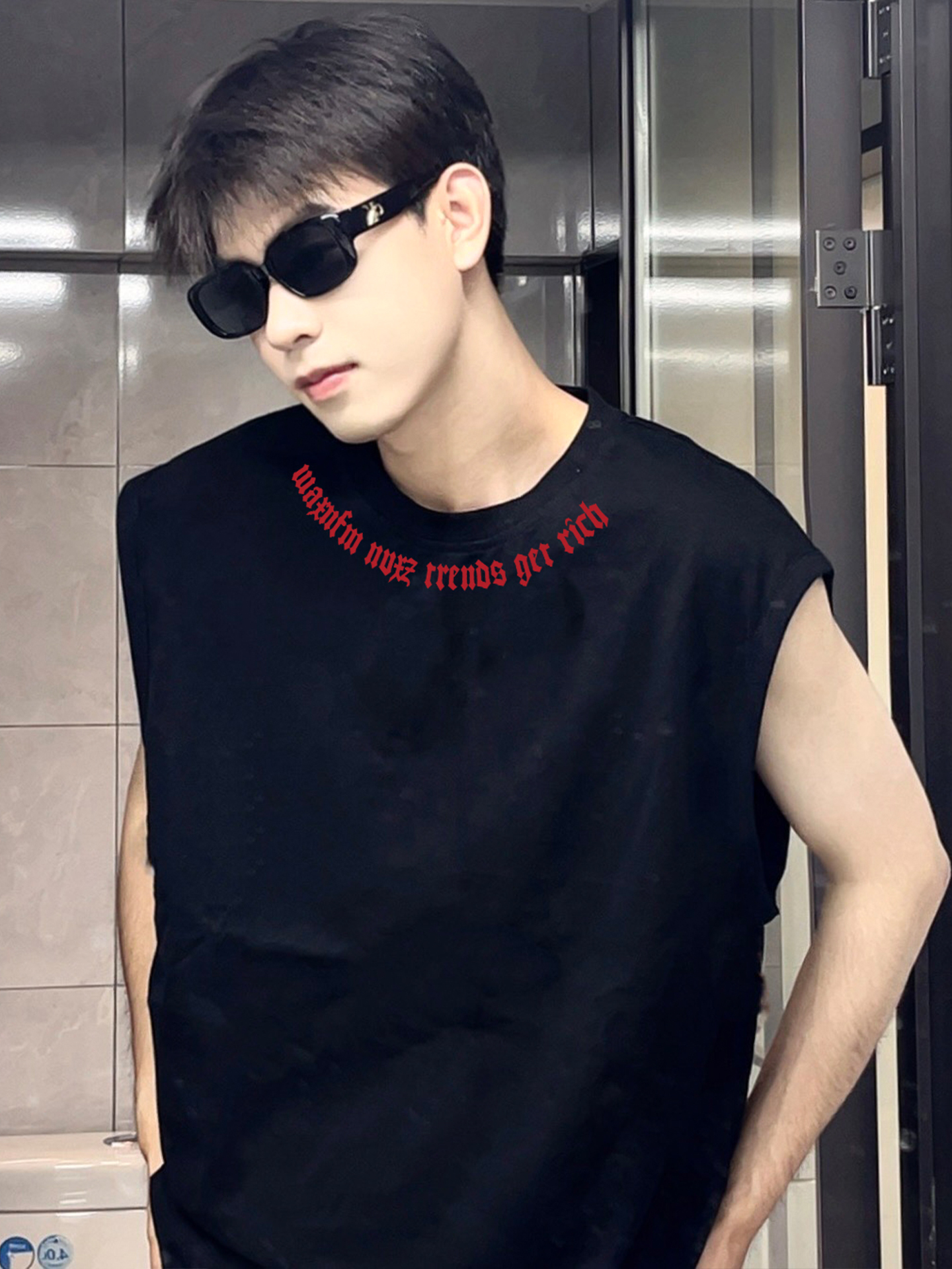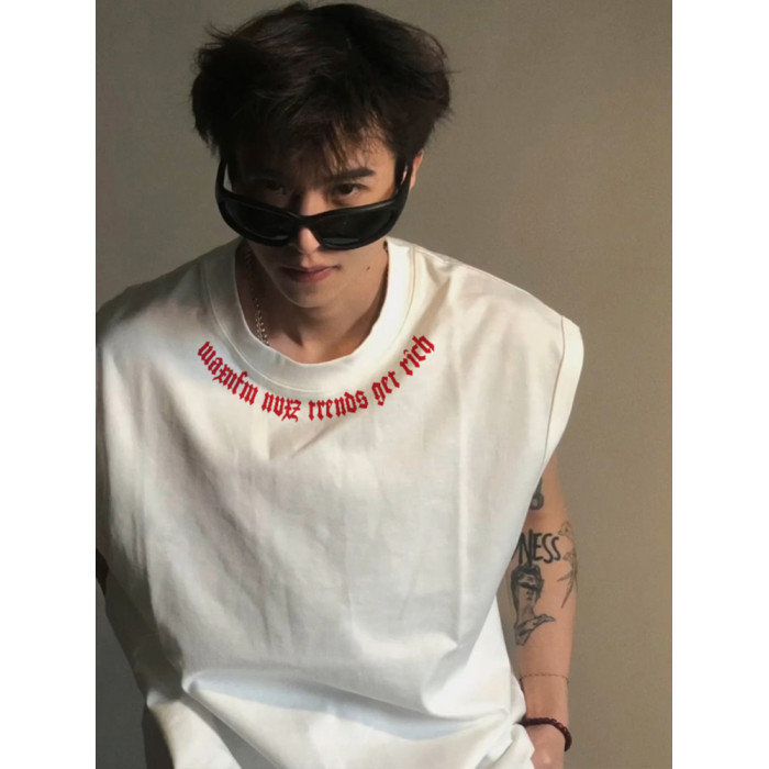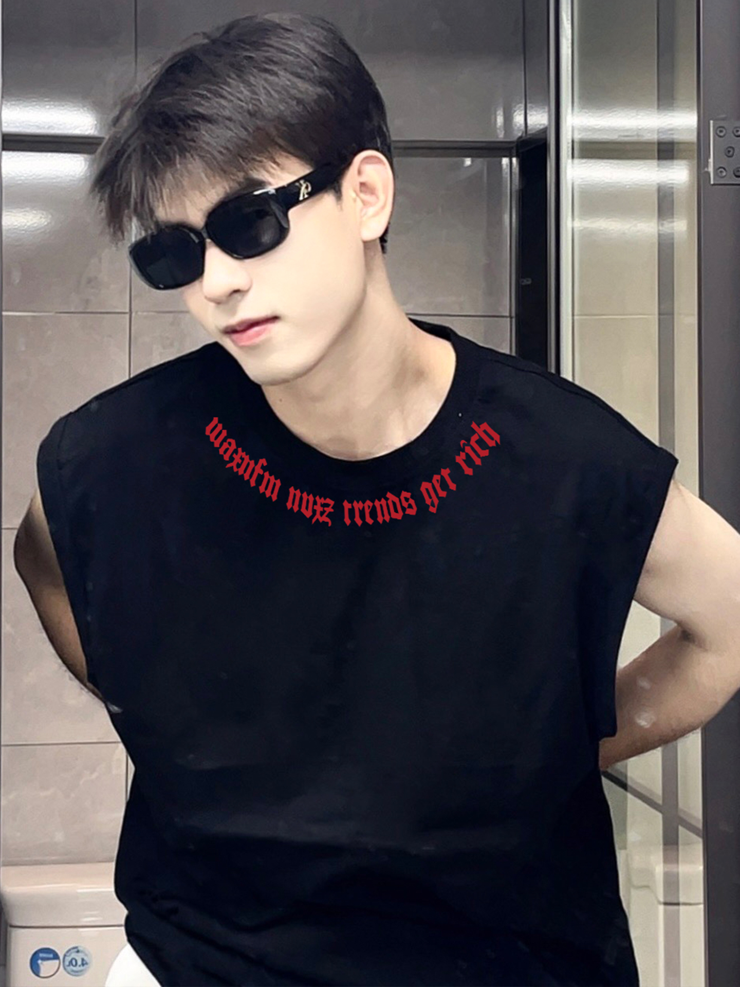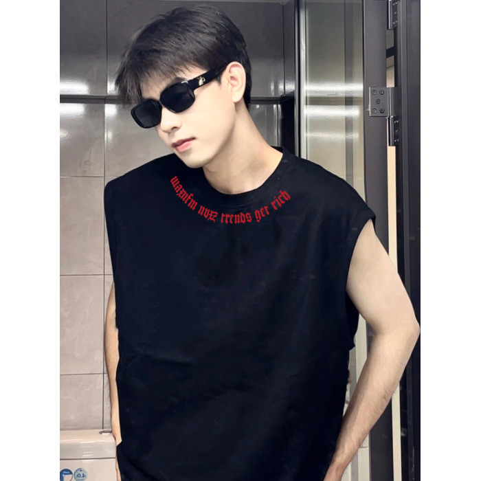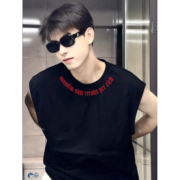 美式復古字母印花無袖T恤男款夏季坎肩寬松背心運動外穿圓領上衣