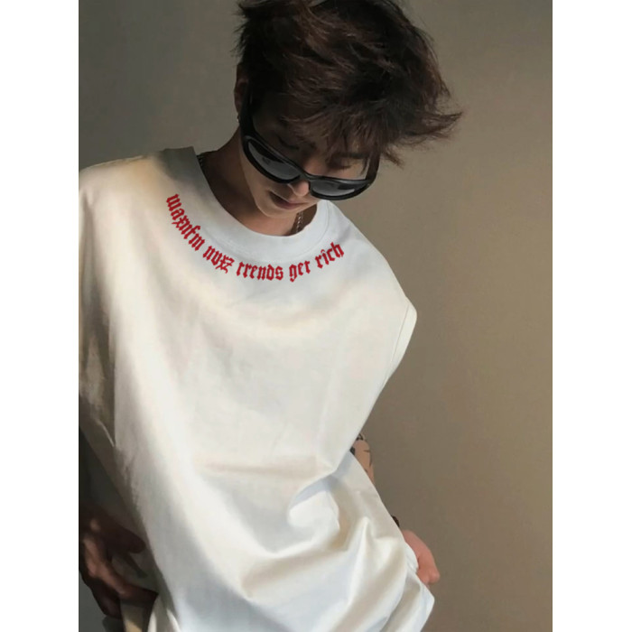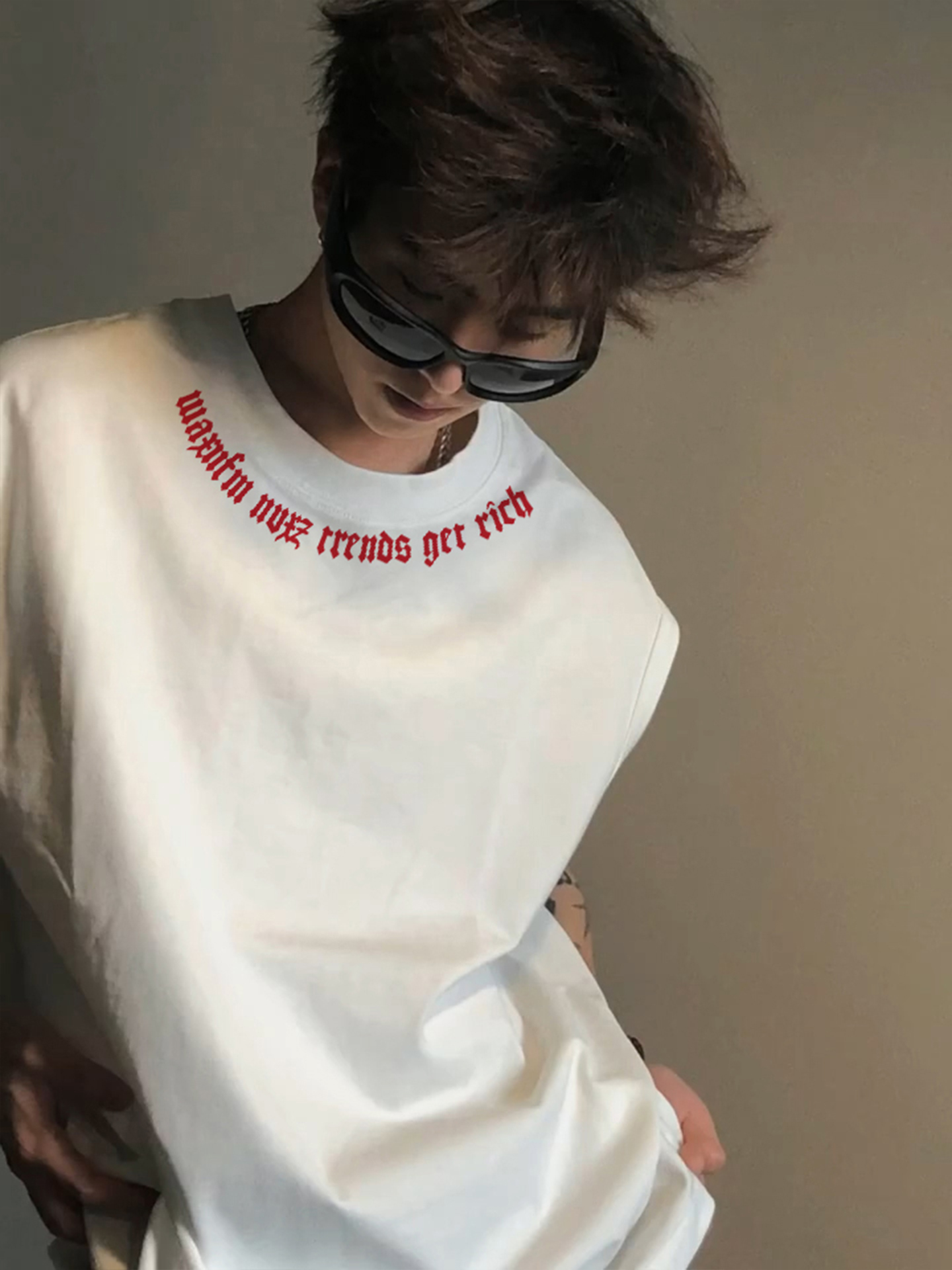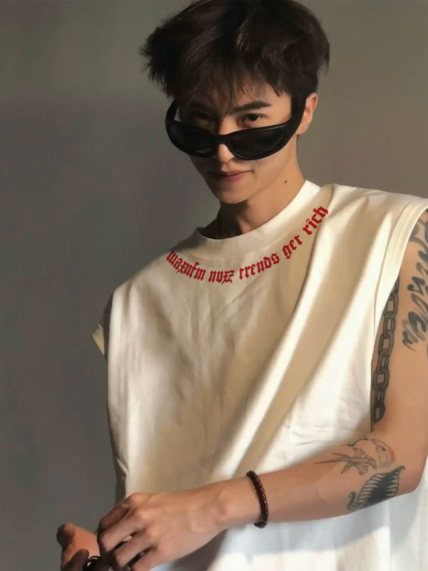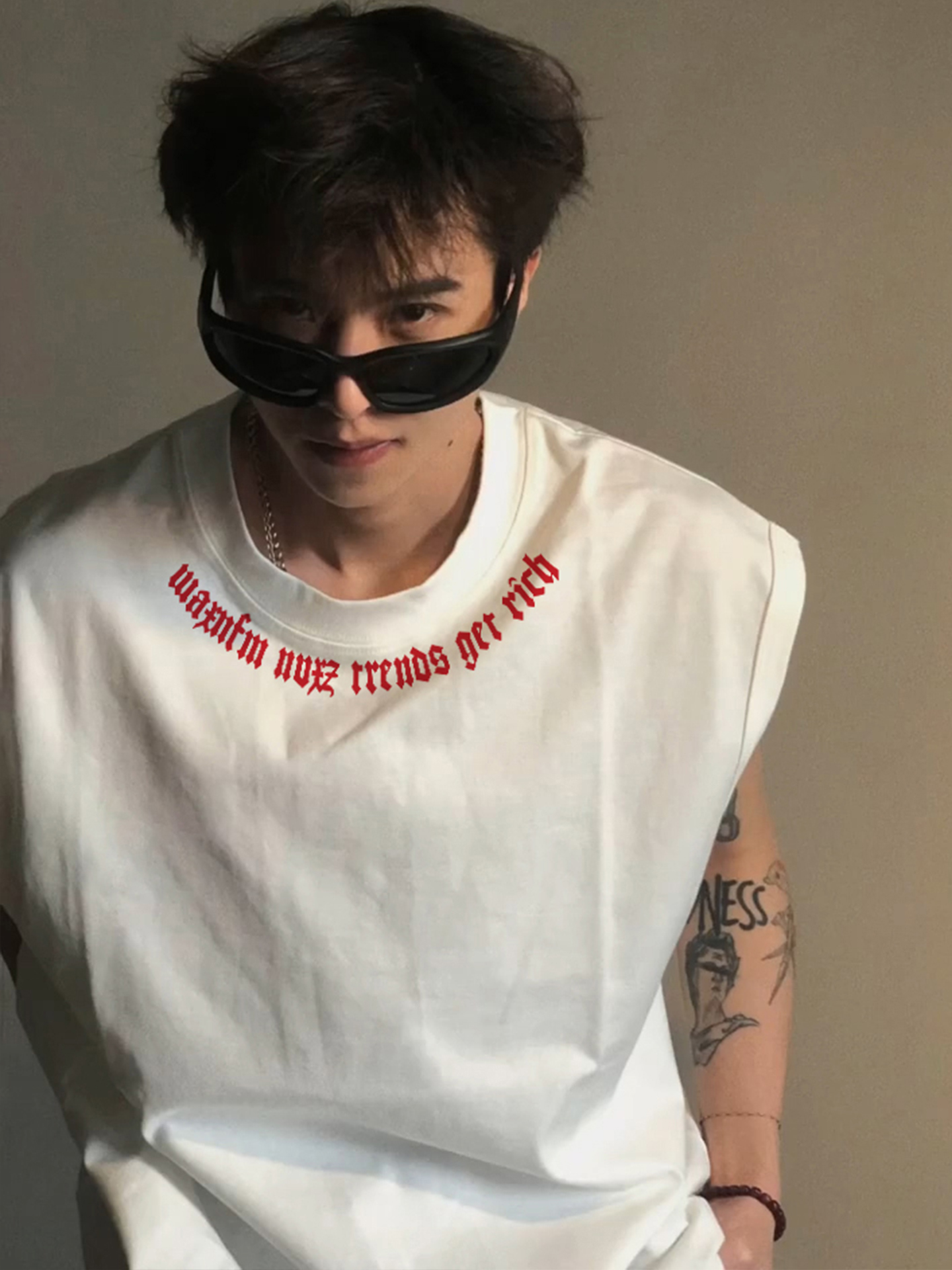 美式復古字母印花無袖T恤男款夏季坎肩寬松背心運動外穿圓領上衣